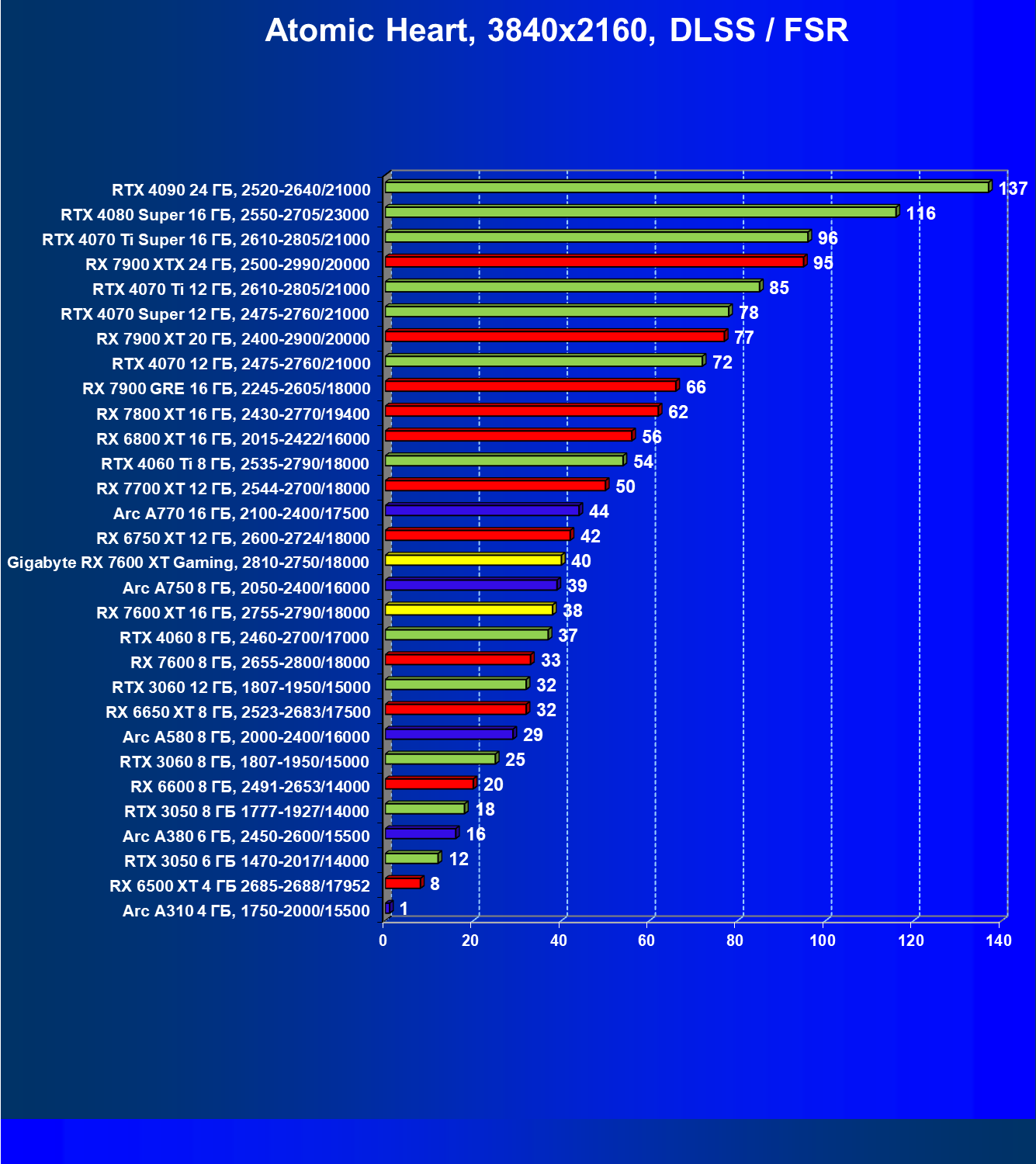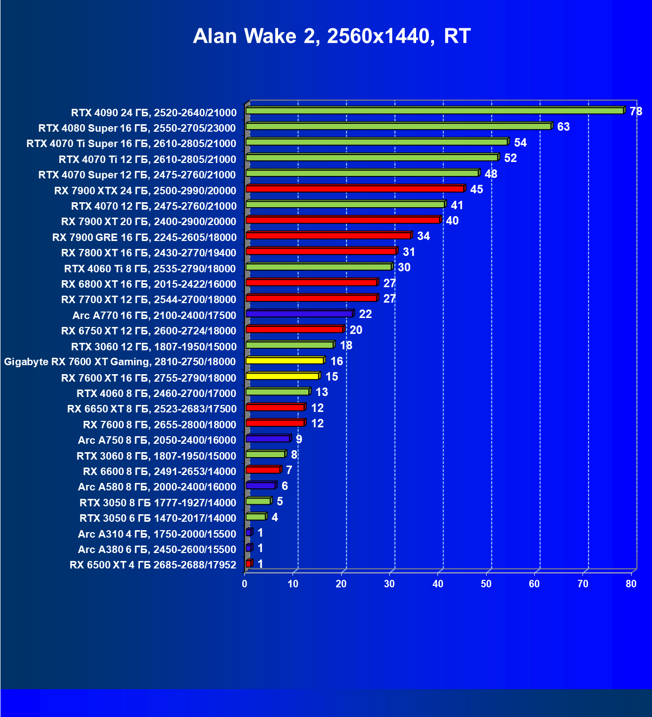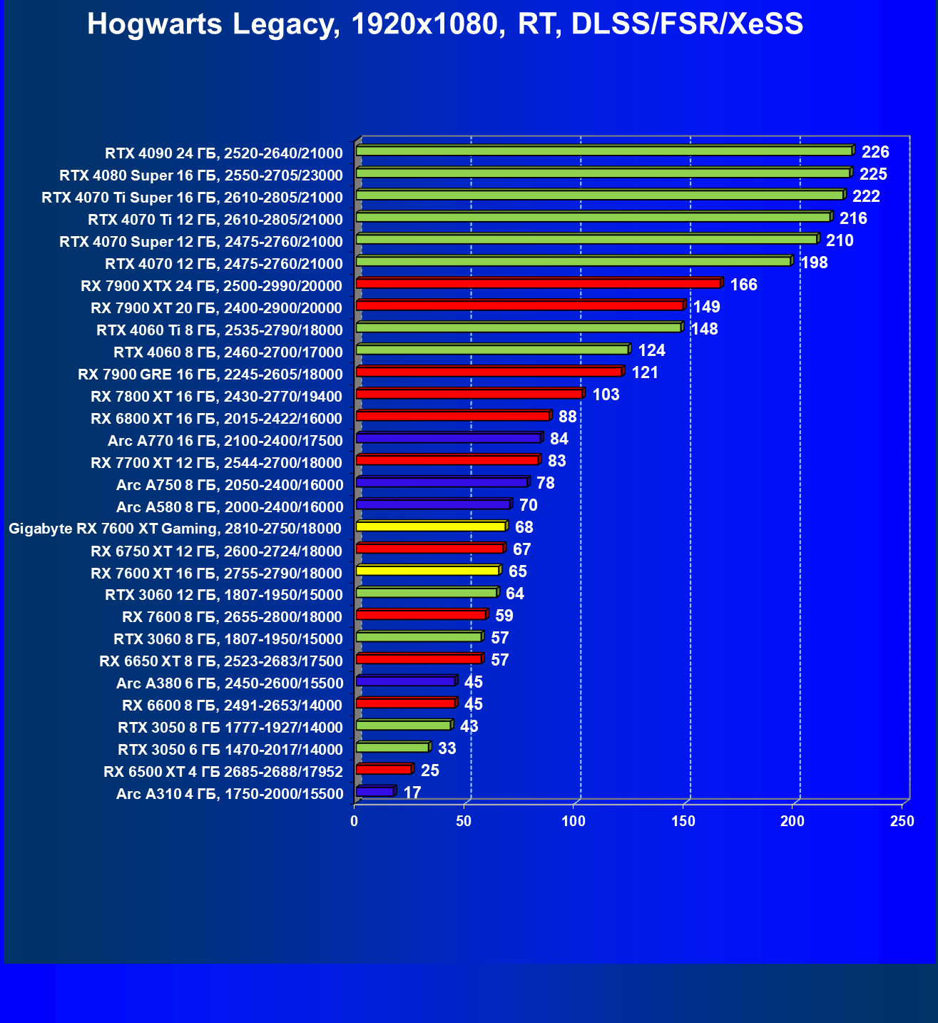 | 13 | Arc A770 16 ГБ, 2100—2400/17500 | 136 | 559 | 41 000 |