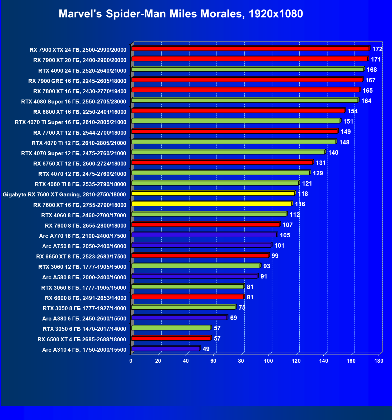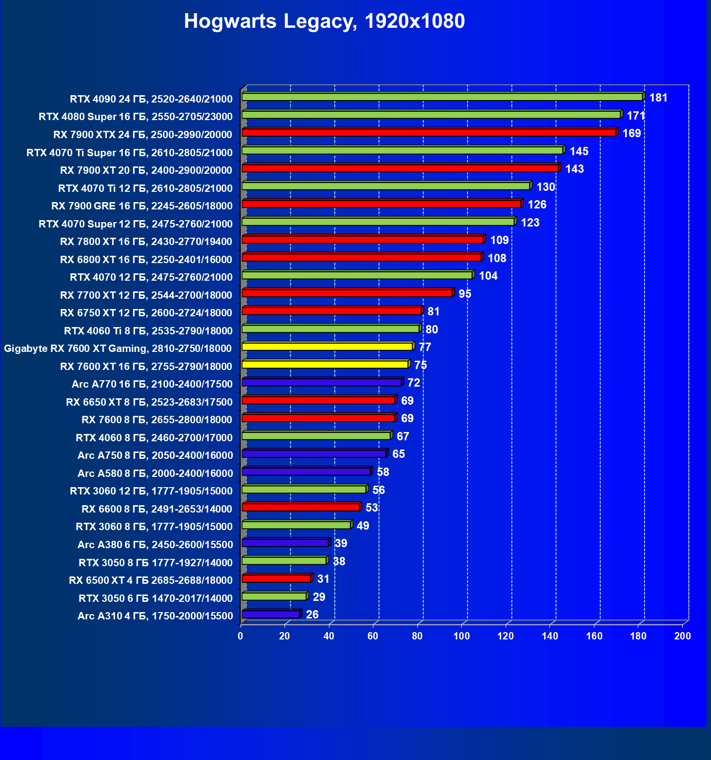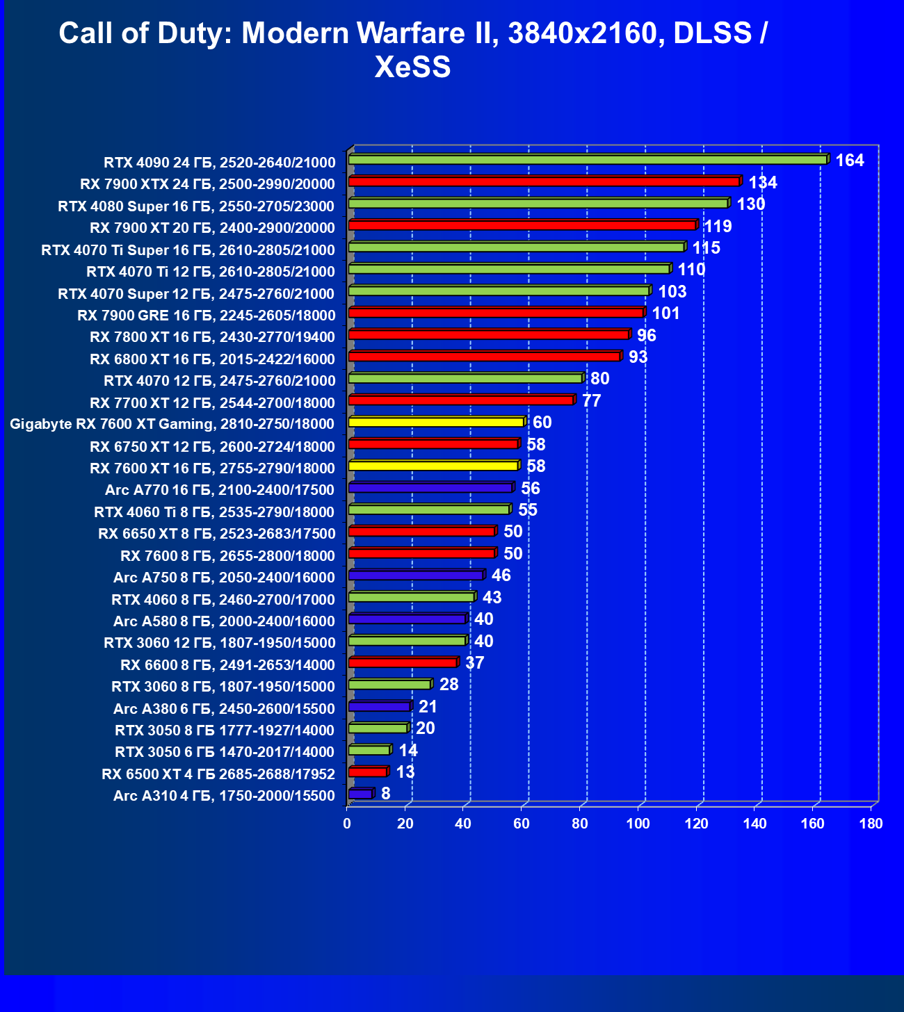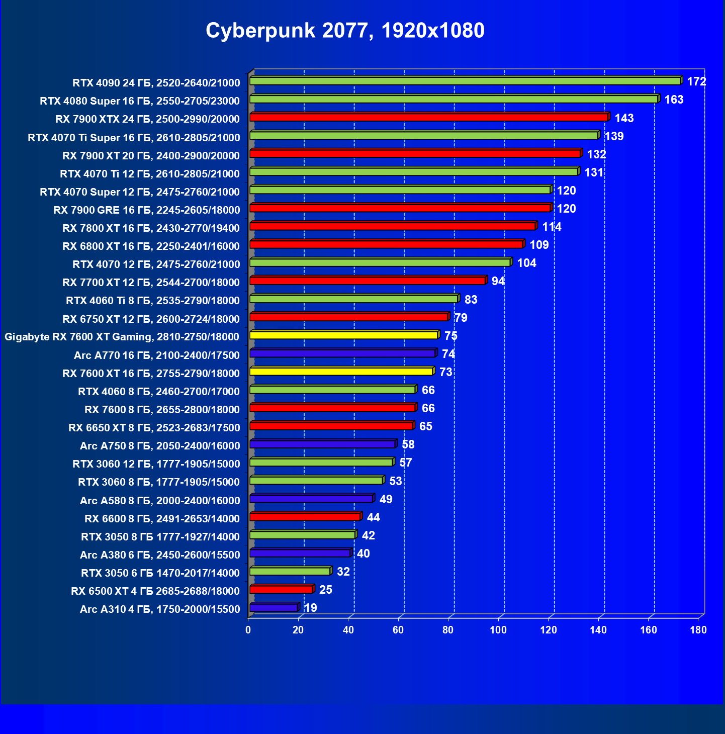 | 21 | RX 7600 XT 16 ГБ, 2755—2790/18000 | 181 | 779 | 43 000 |