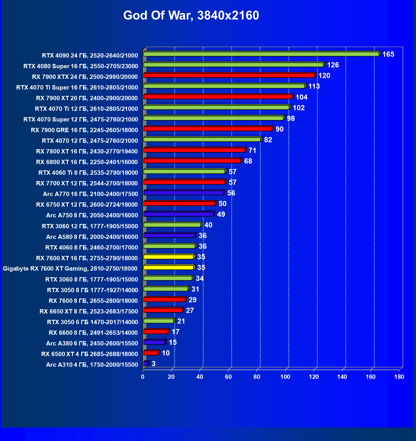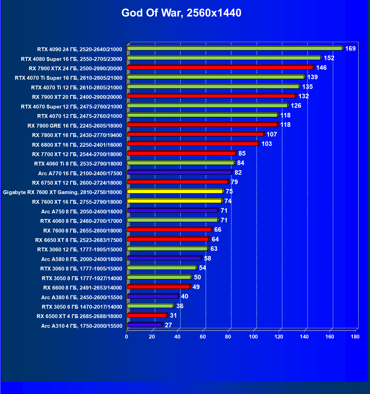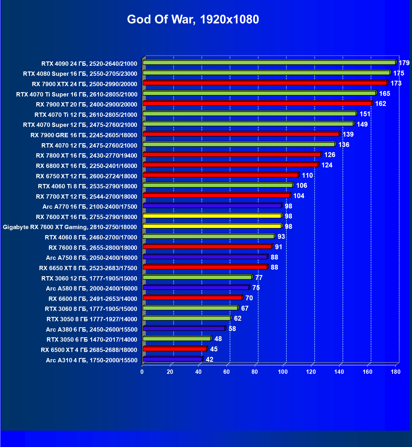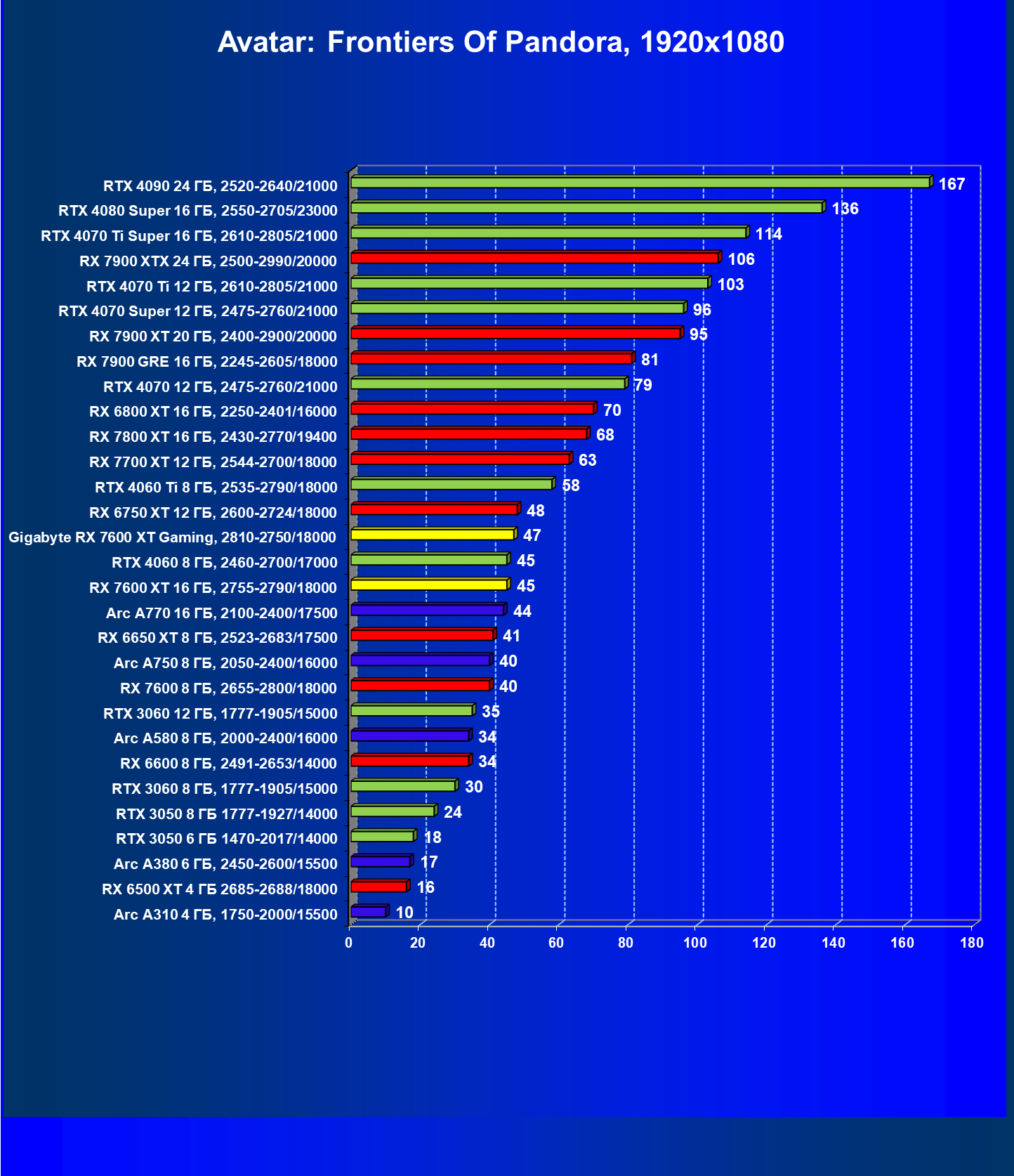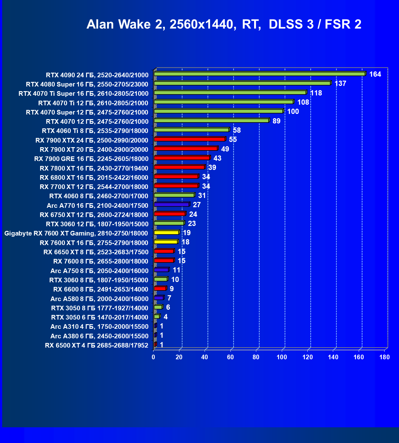 | 21 | RX 7600 XT 16 ГБ, 2755—2790/18000 | 181 | 779 | 43 000 |