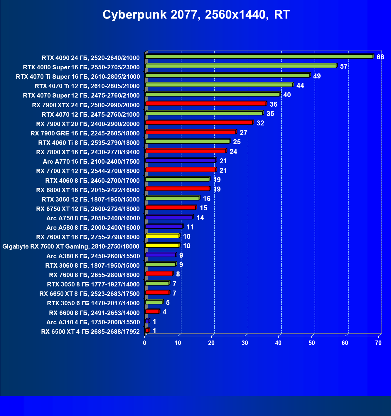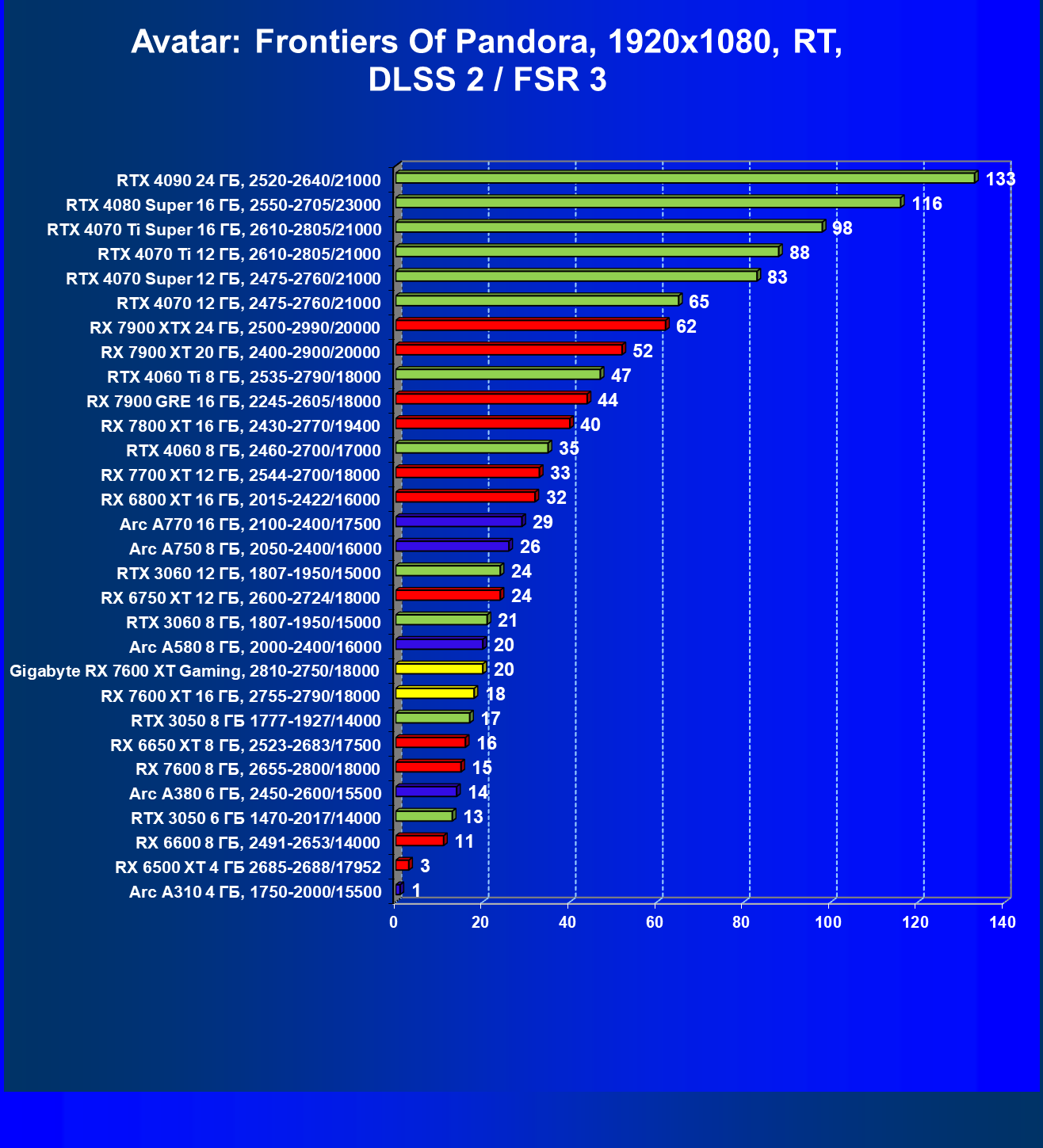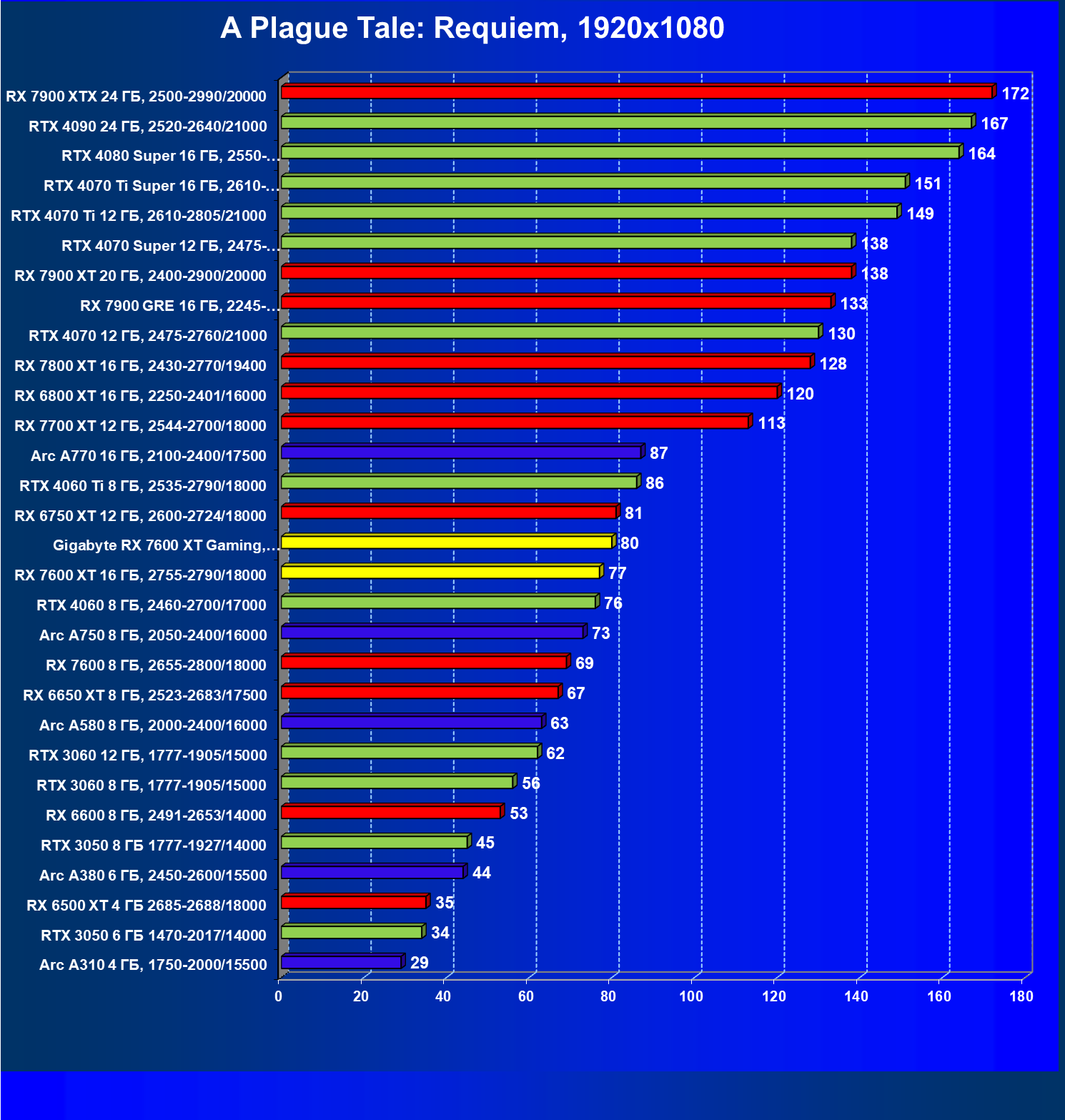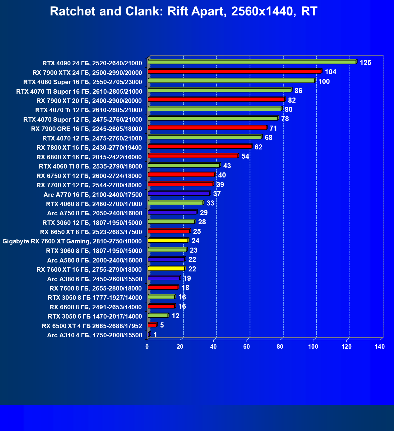 | 20 | Gigabyte RX 7600 XT Gaming, 2810—2750/18000 | 126 | 547 | 43 500 |