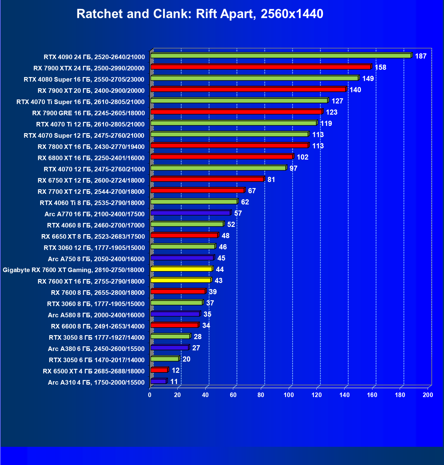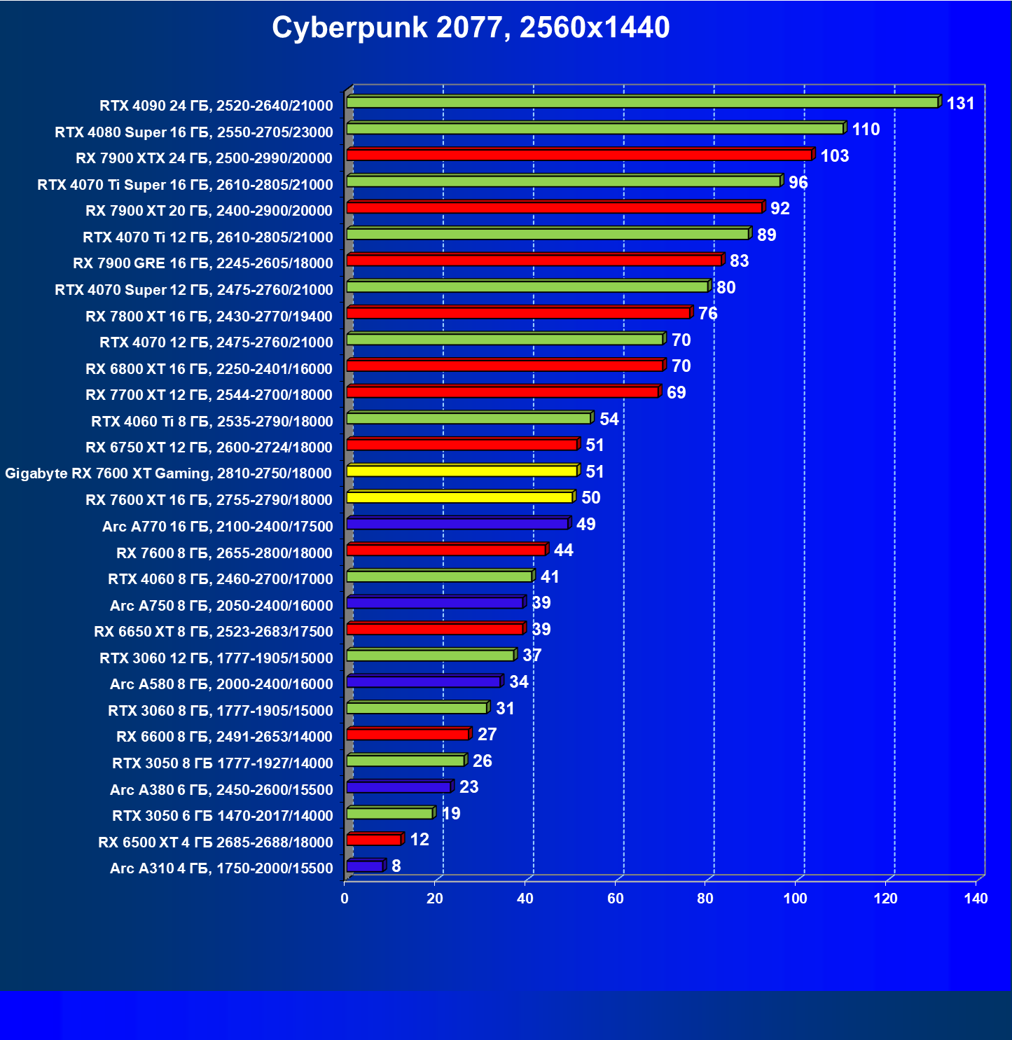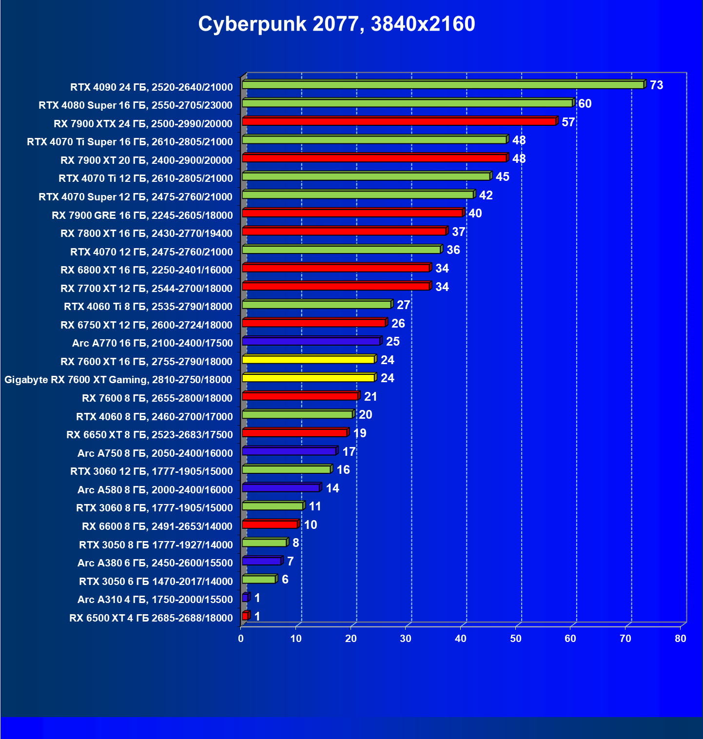 | 20 | Gigabyte RX 7600 XT Gaming, 2810—2750/18000 | 126 | 547 | 43 500 |