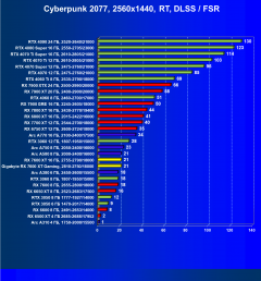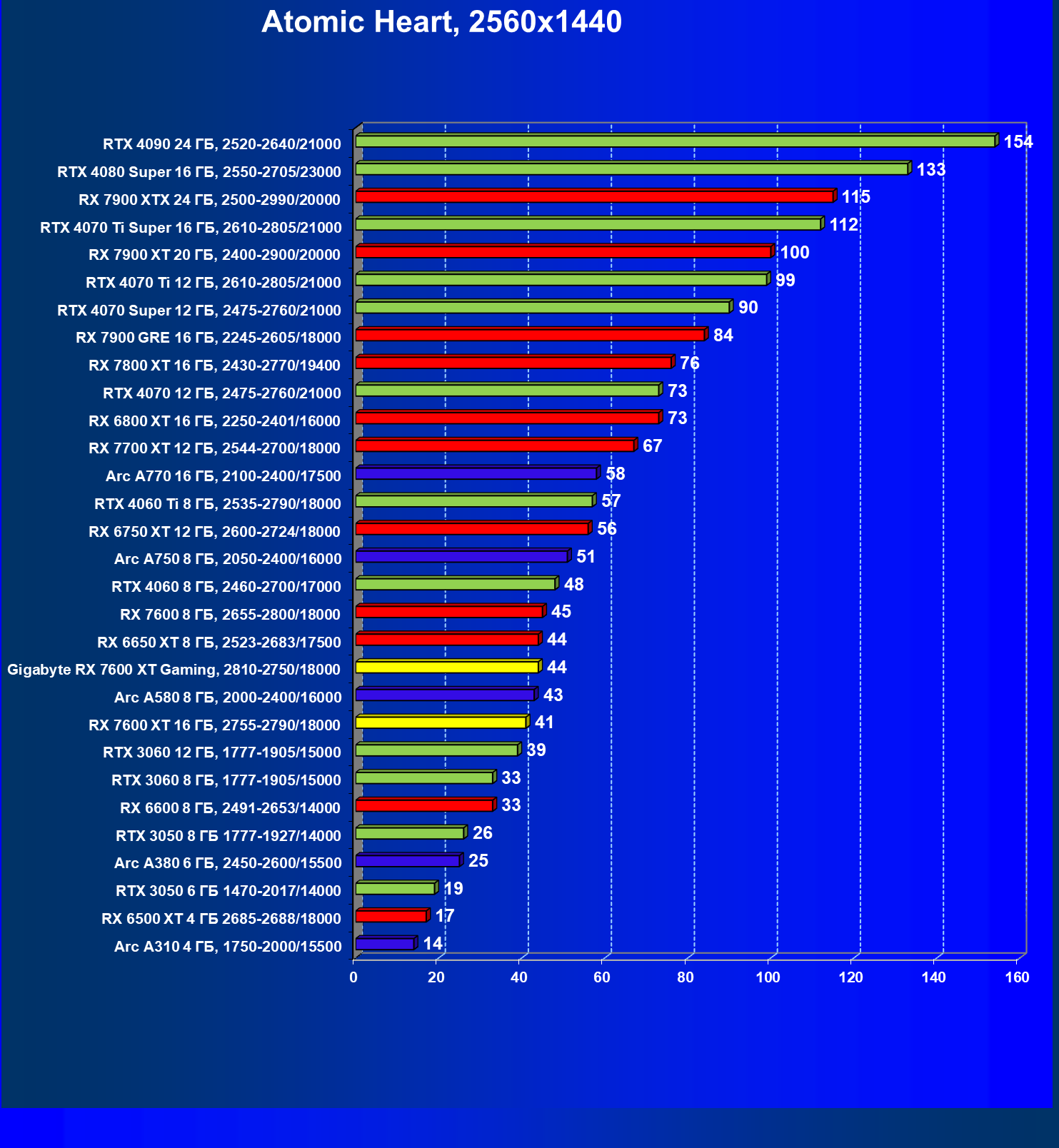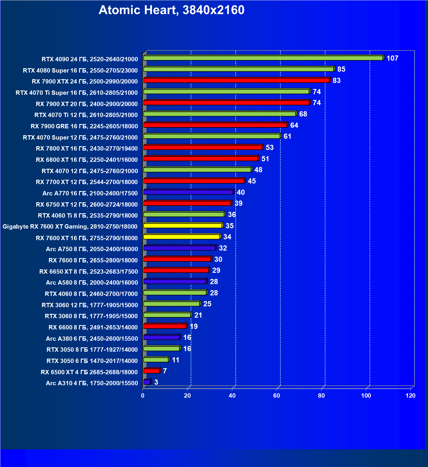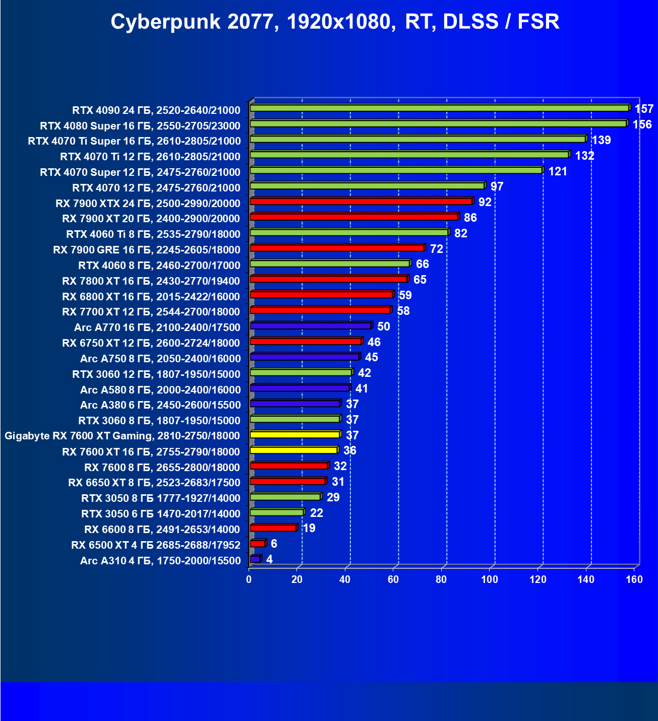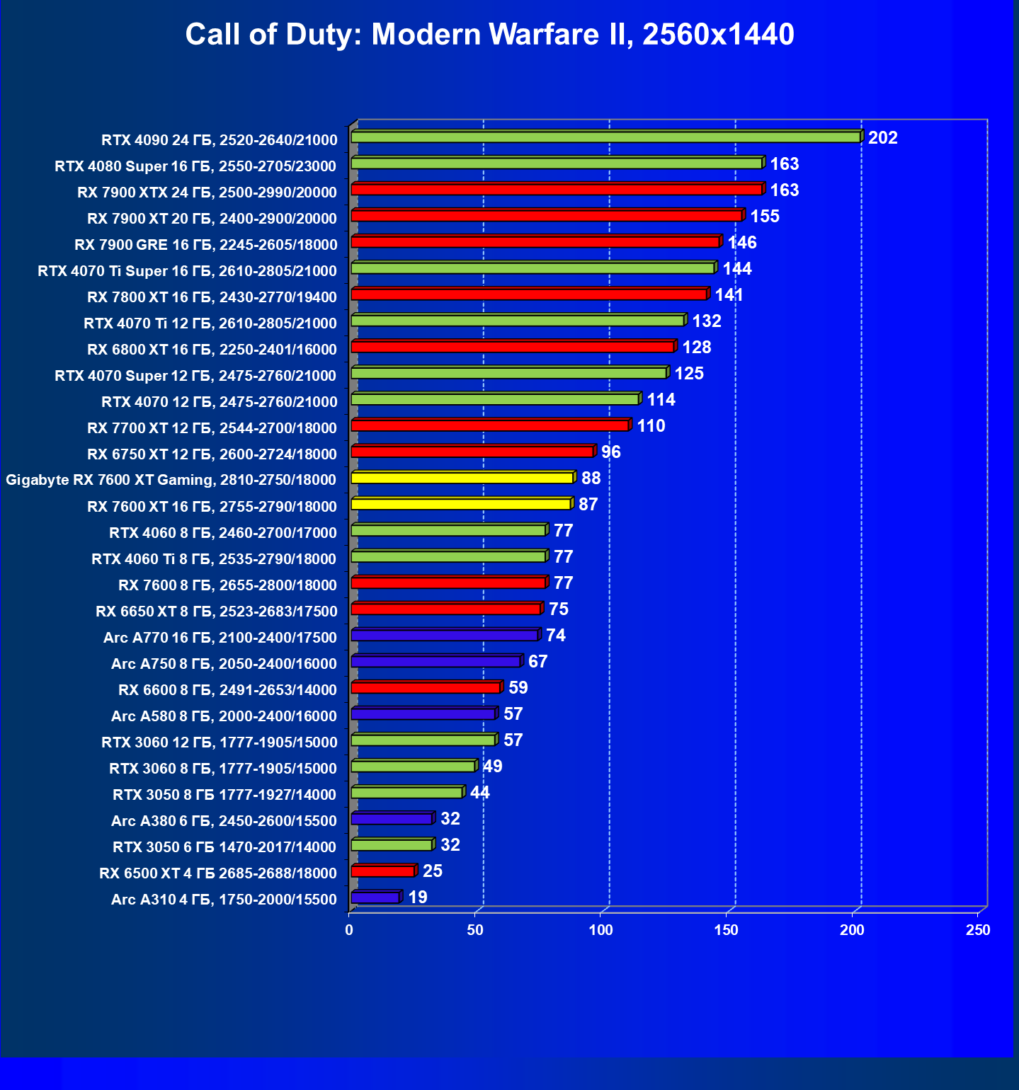 | 20 | Gigabyte RX 7600 XT Gaming, 2810—2750/18000 | 126 | 547 | 43 500 |