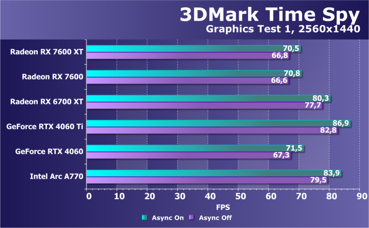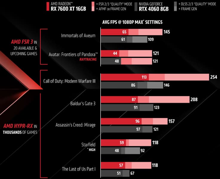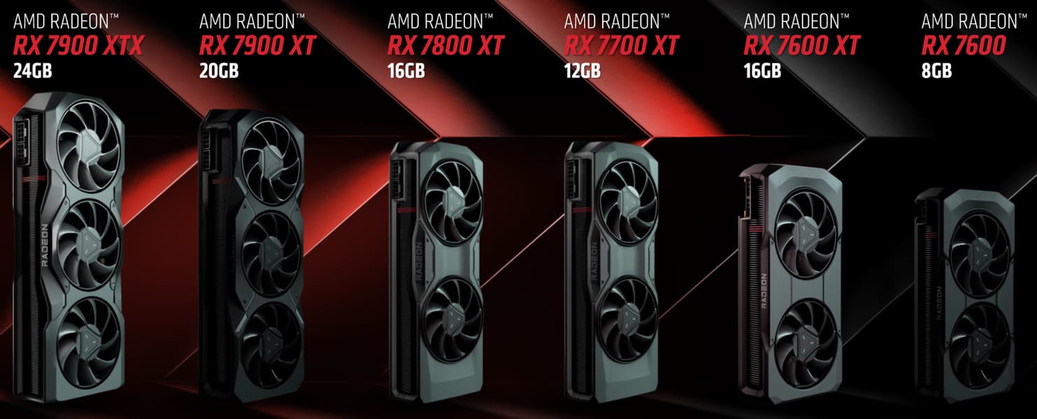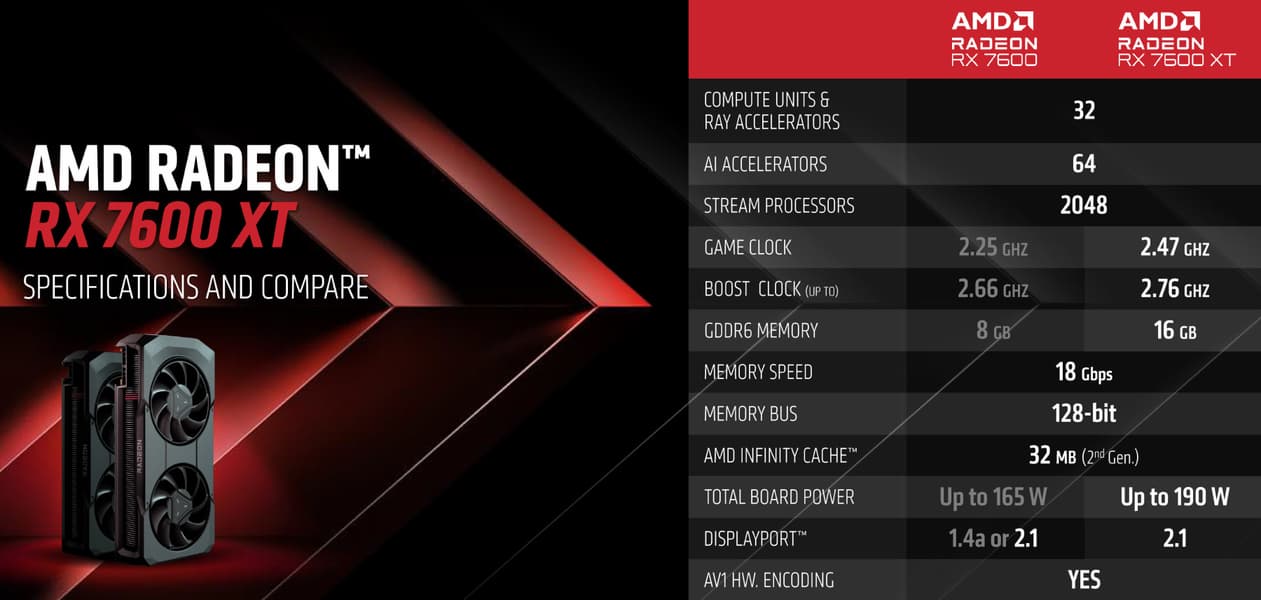 По сравнительной табличке хорошо видно, что отличия между Radeon RX 7600 и Radeon RX 7600 XT не слишком значительные: увеличены только частоты чипа и объем локальной памяти. Неудивительно, что Radeon RX 7600 XT с 16 ГБ памяти также предназначен для игры в разрешении Full HD (лишь иногда 2560×1440) при максимальных настройках качества, включая трассировку лучей — как и его младший собрат. Видеокарта нацелена на вероятный апгрейд пользователей с устаревшими игровыми системами. Все компании обращают достаточно много внимания на ценовой диапазон около $300, так как он является одним из самых массовых.