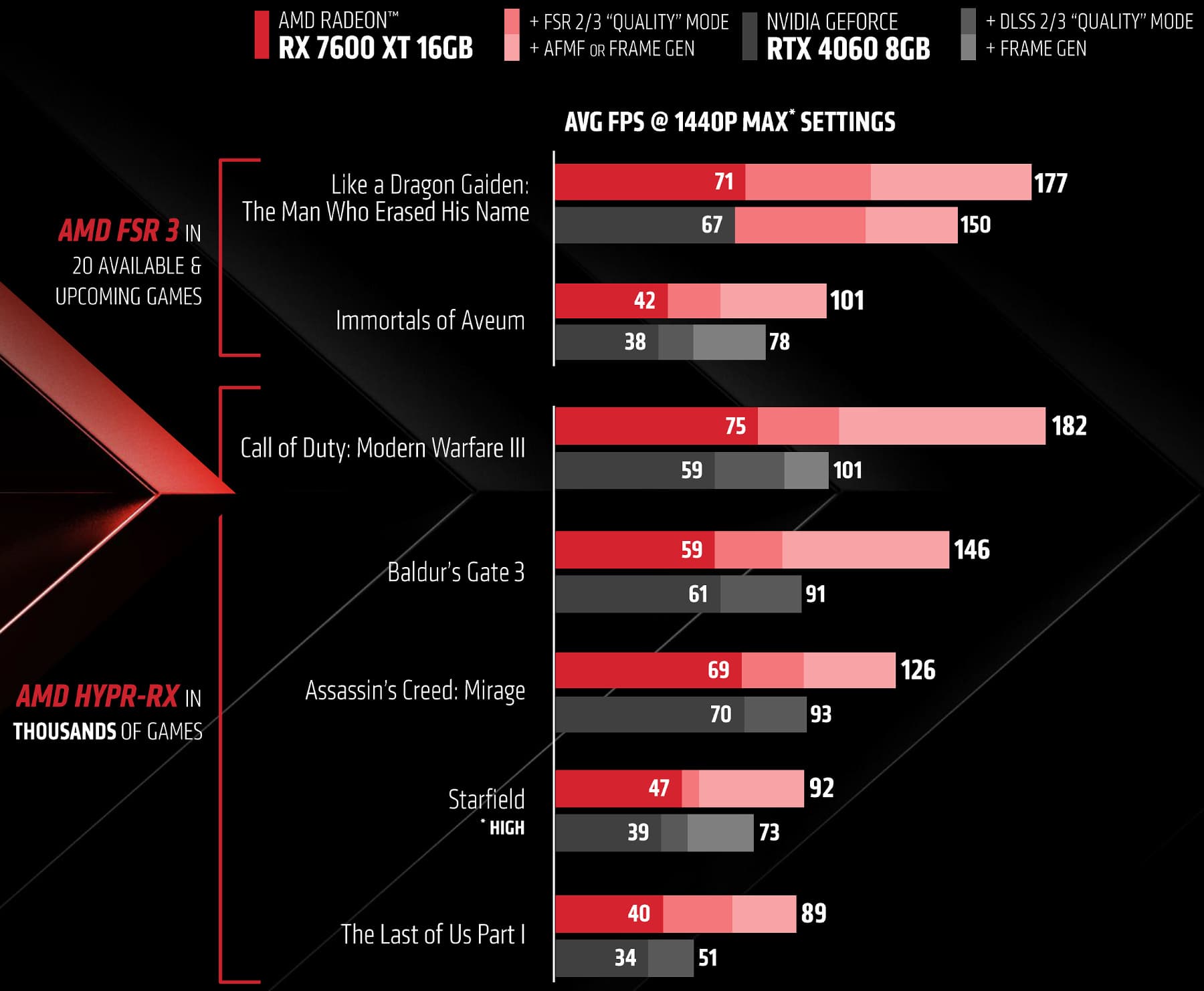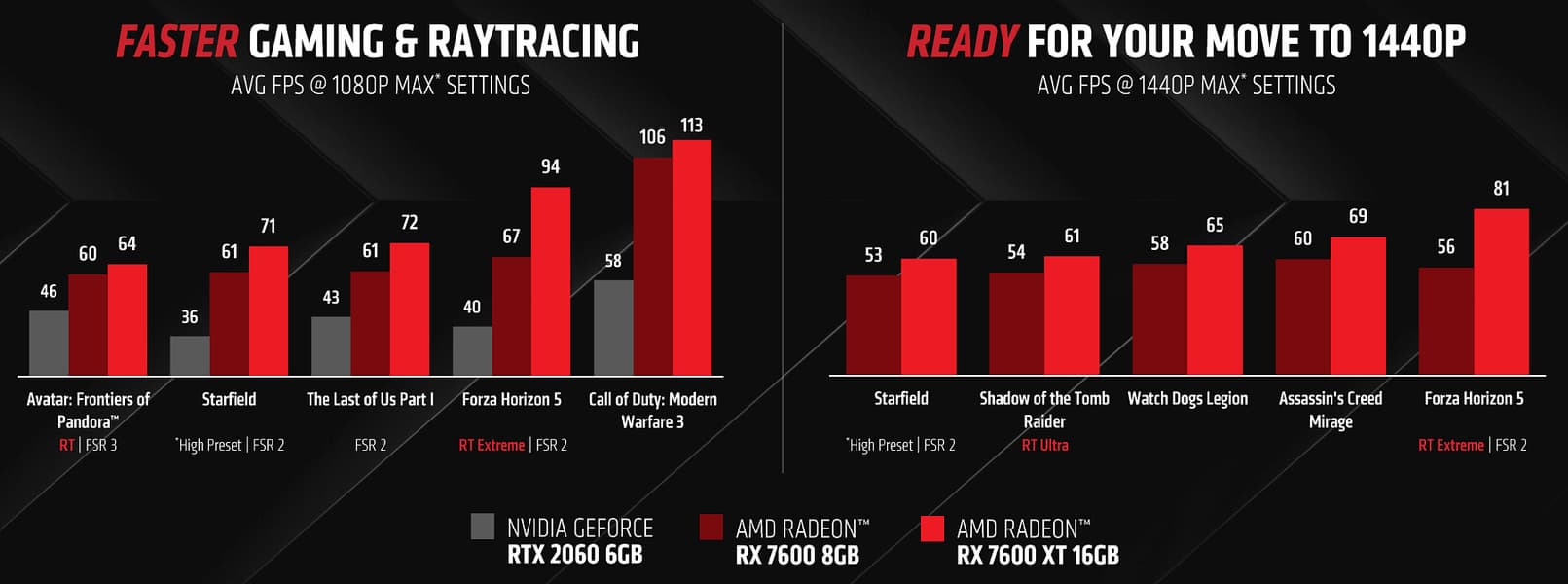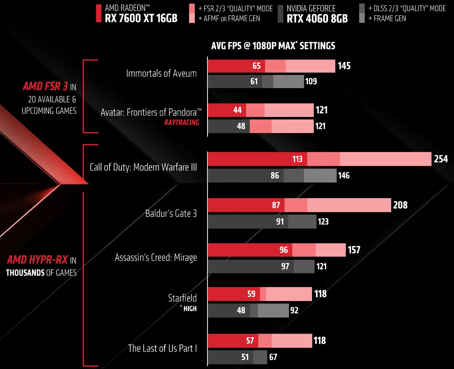 Вот такие приросты производительности получат владельцы GeForce RTX 2060 при замене на Radeon RX 7600 XT по данным AMD — ускорение более чем вдвое, да еще и включая играбельную трассировку лучей. А ведь GeForce RTX 2060 является довольно распространенной видеокартой, но в современных играх при высоких настройках даже в разрешении Full HD она зачастую уже не обеспечивает требуемую производительность. И новая видеокарта с более высоким уровнем производительности вполне может заставить задуматься об апгрейде. Правда, нужно учитывать, что в данных AMD используется технология FSR — рендеринг в меньшем разрешении и масштабирование его до более высокого, а изредка еще и генерация дополнительных кадров.