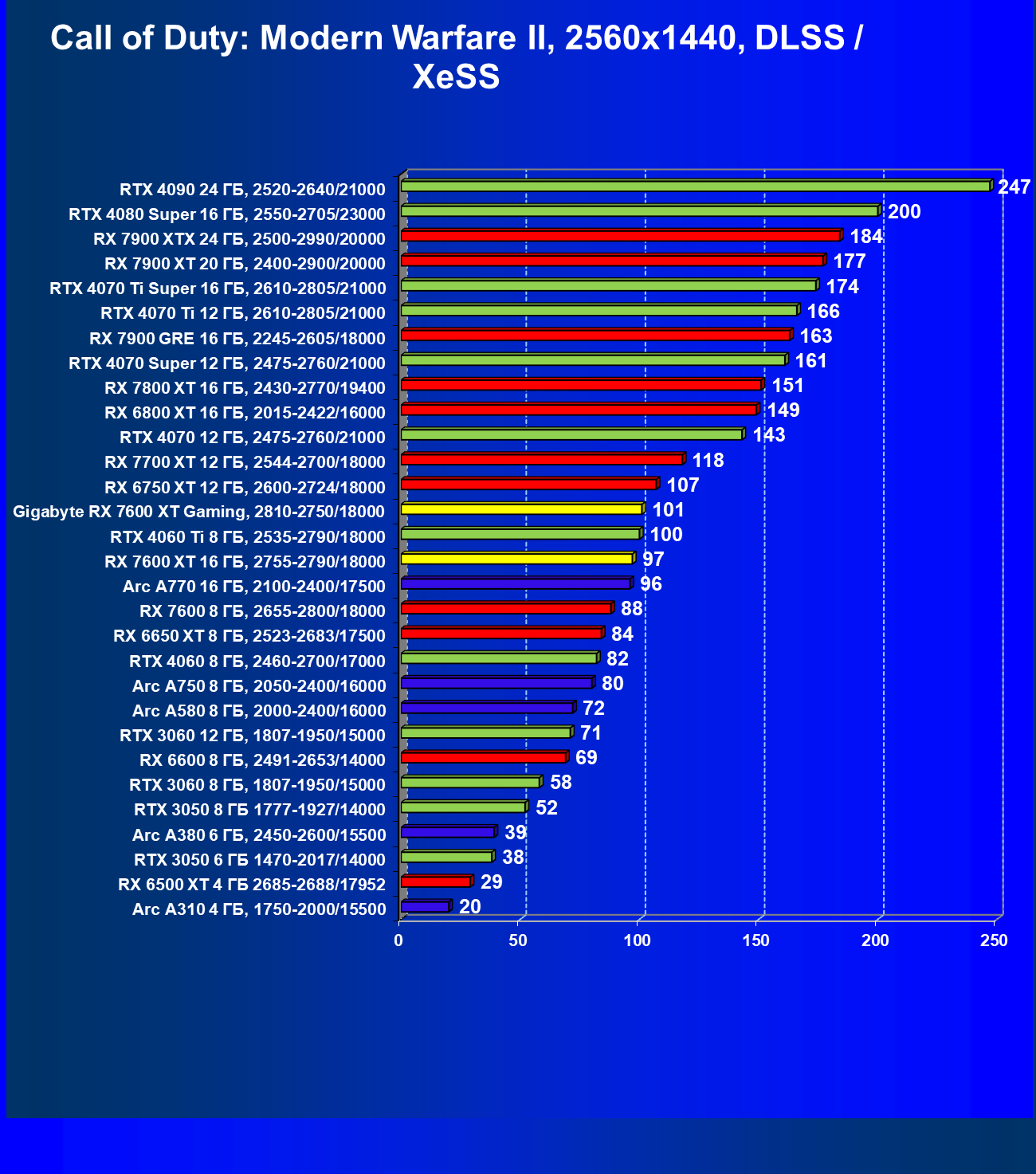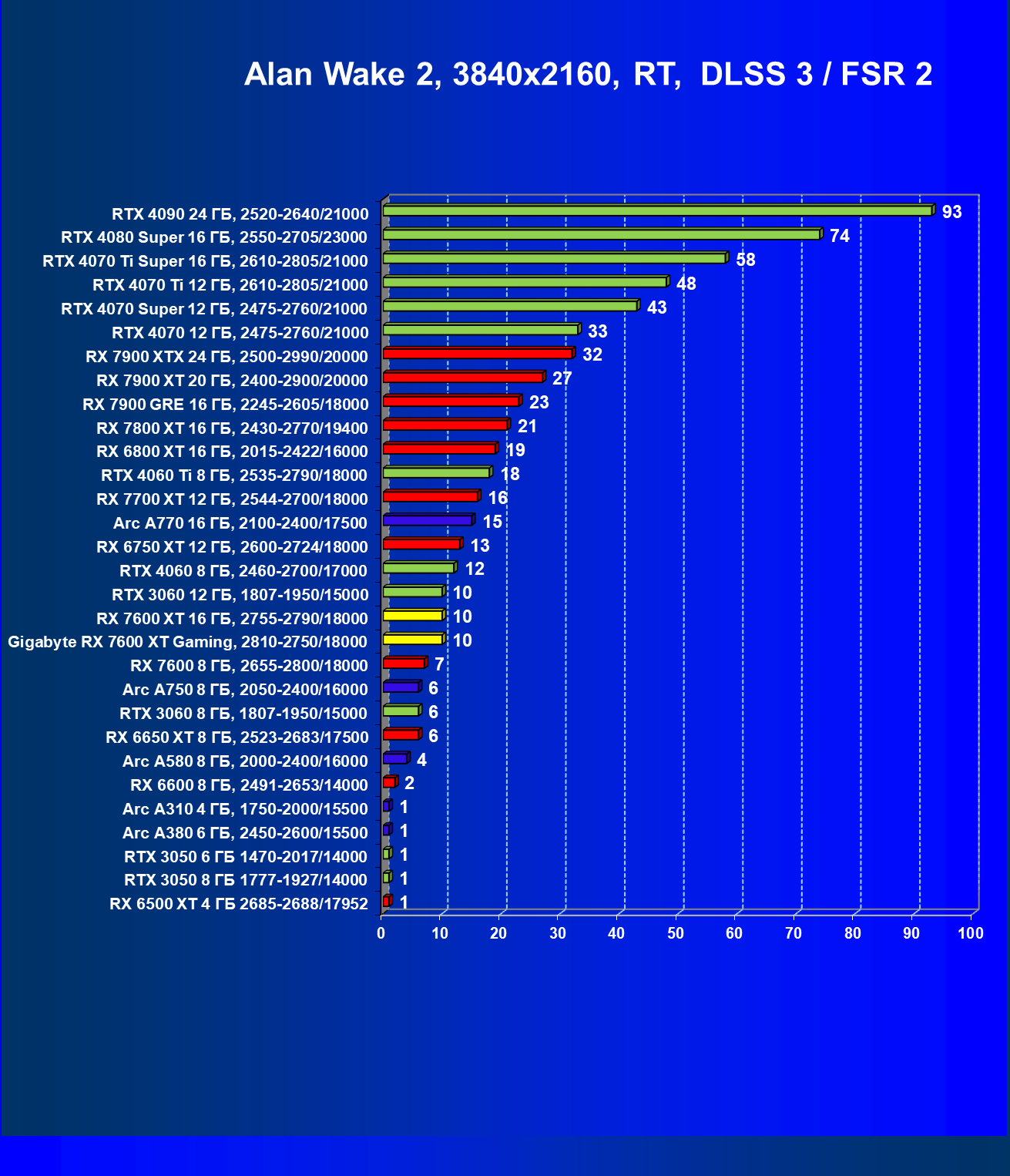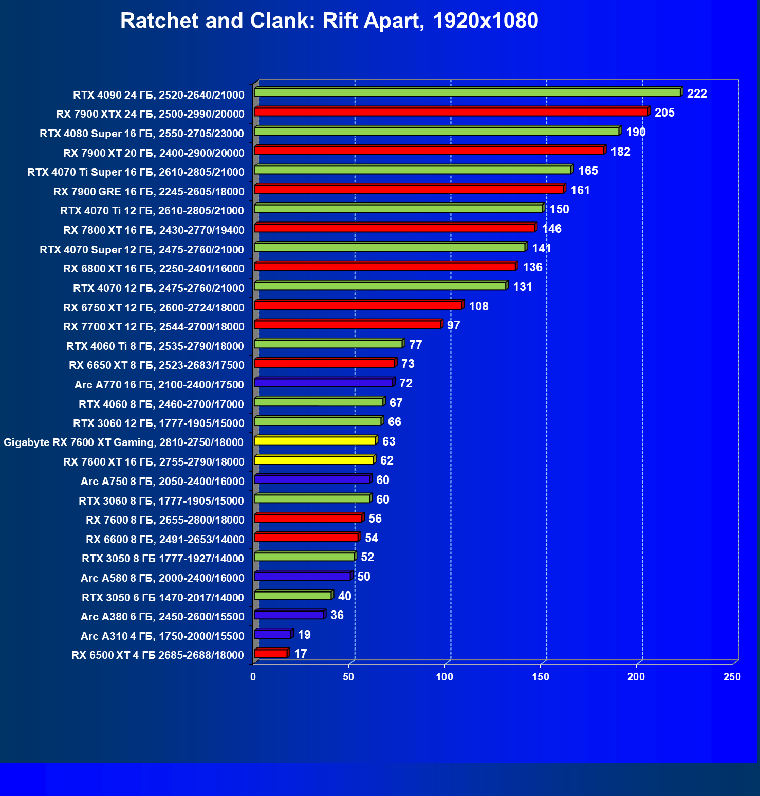 | 08 | Arc A770 16 ГБ, 2100—2400/17500 | 243 | 997 | 41 000 |