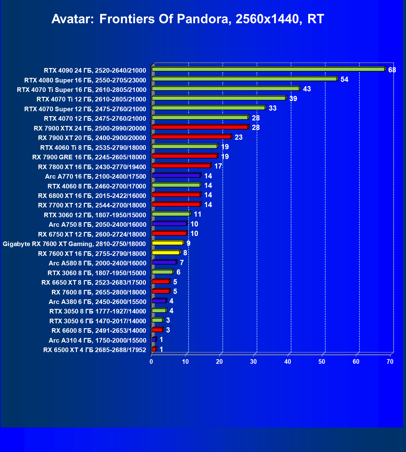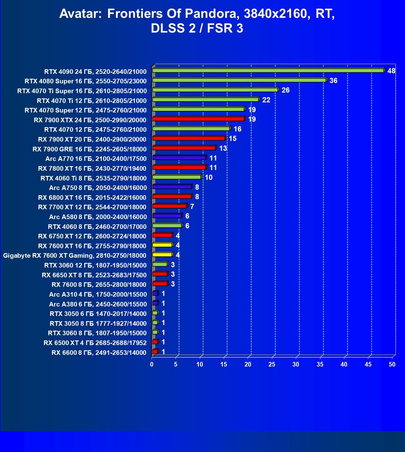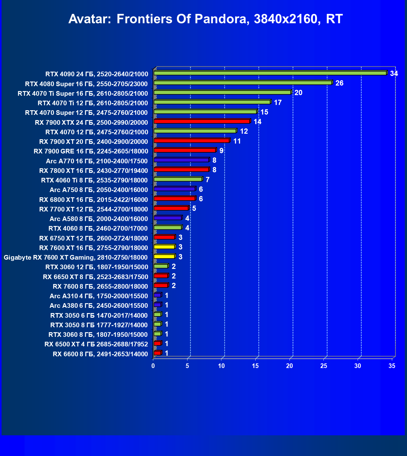 | 19 | Arc A750 8 ГБ, 2050—2400/16000 | 762 | 231 | 33 000 |