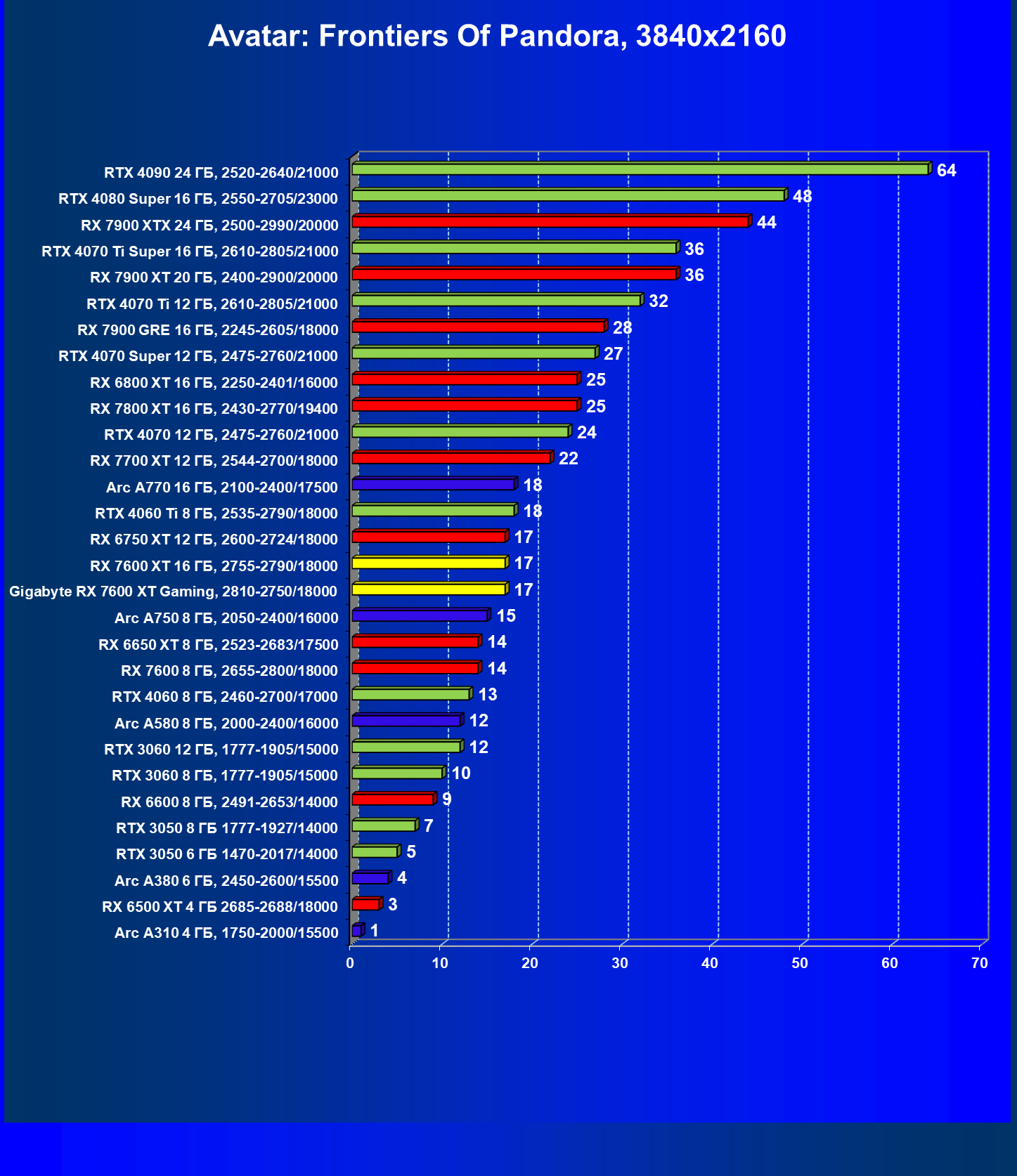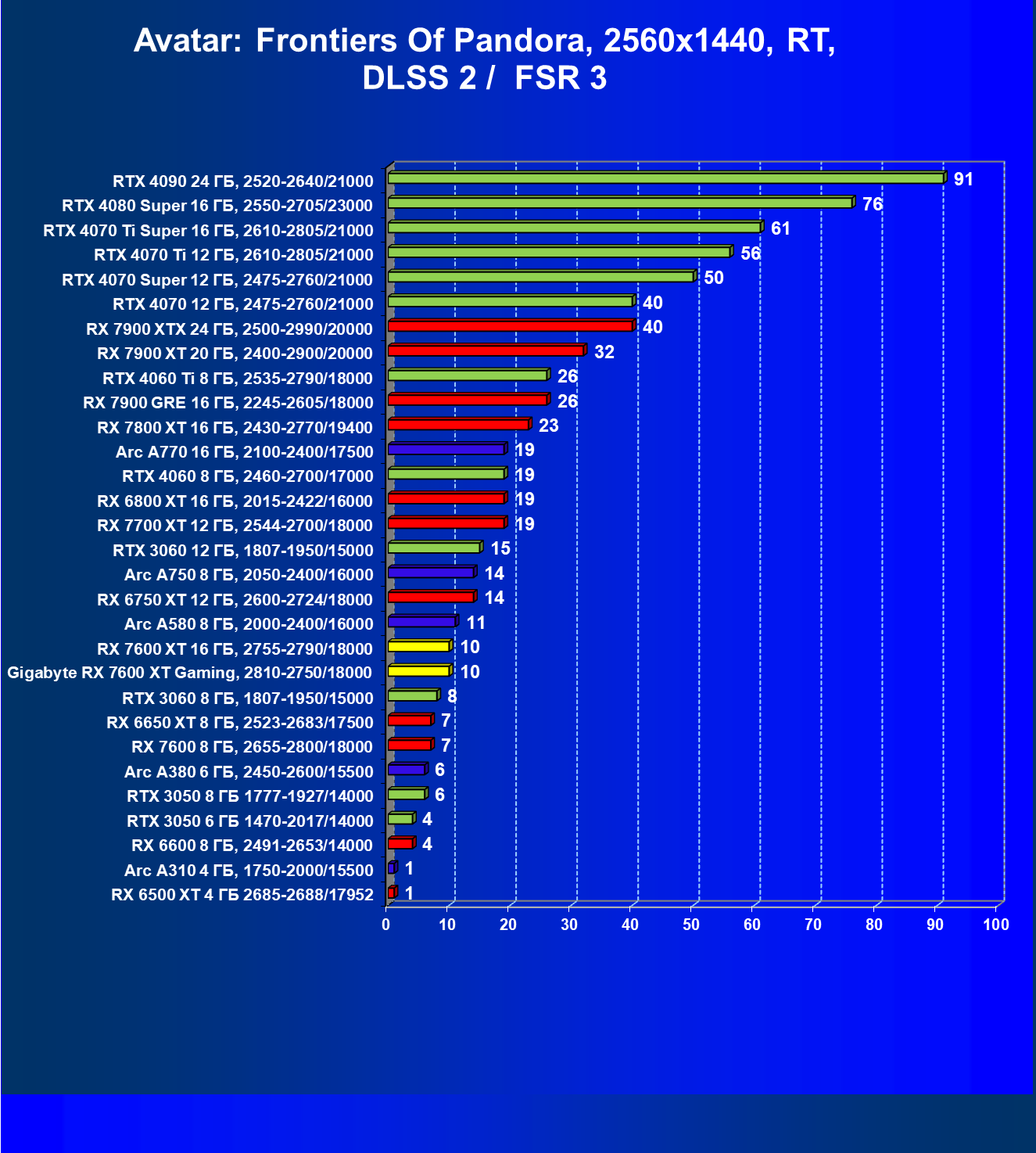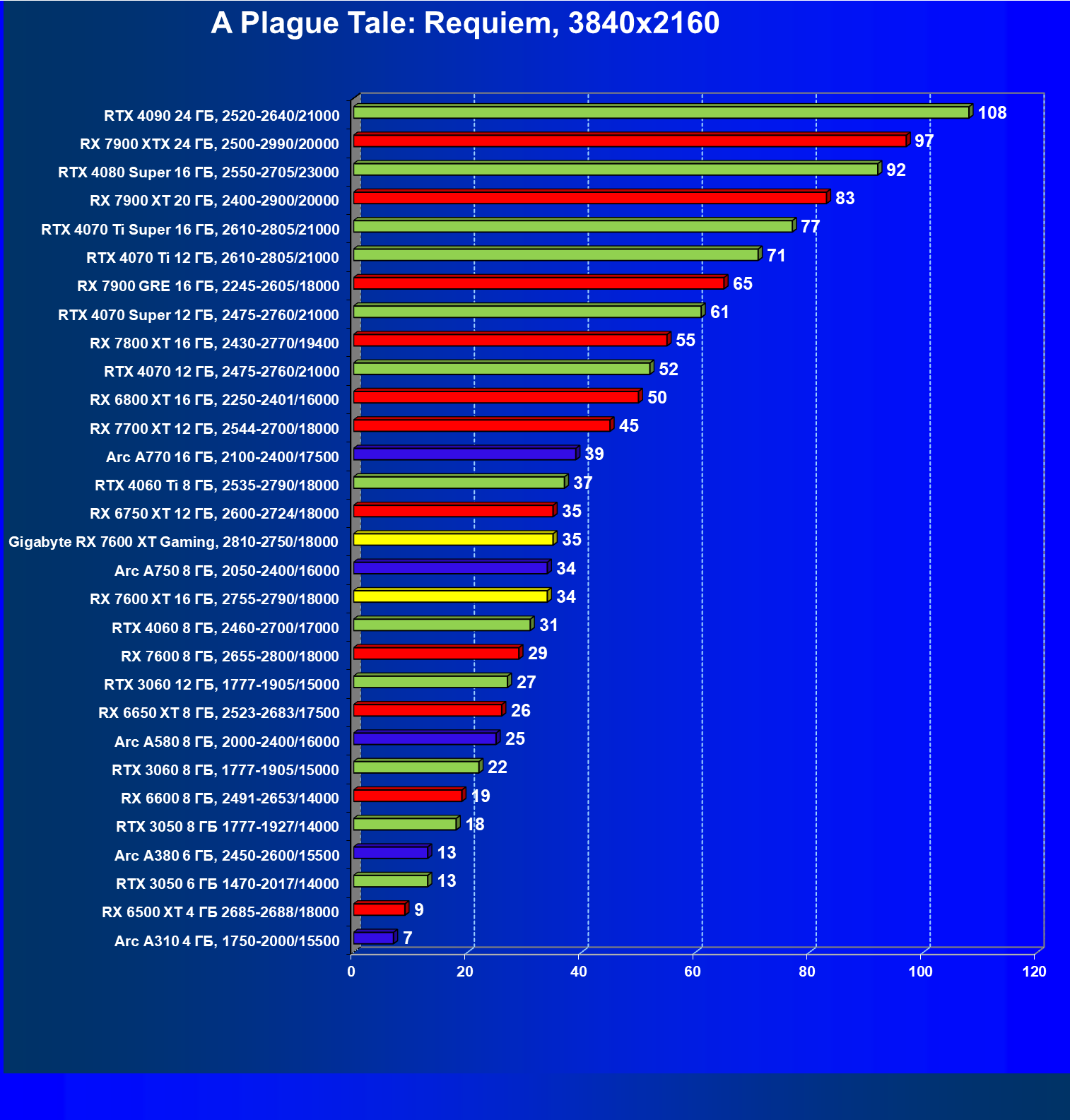 | 19 | Arc A750 8 ГБ, 2050—2400/16000 | 762 | 231 | 33 000 |
