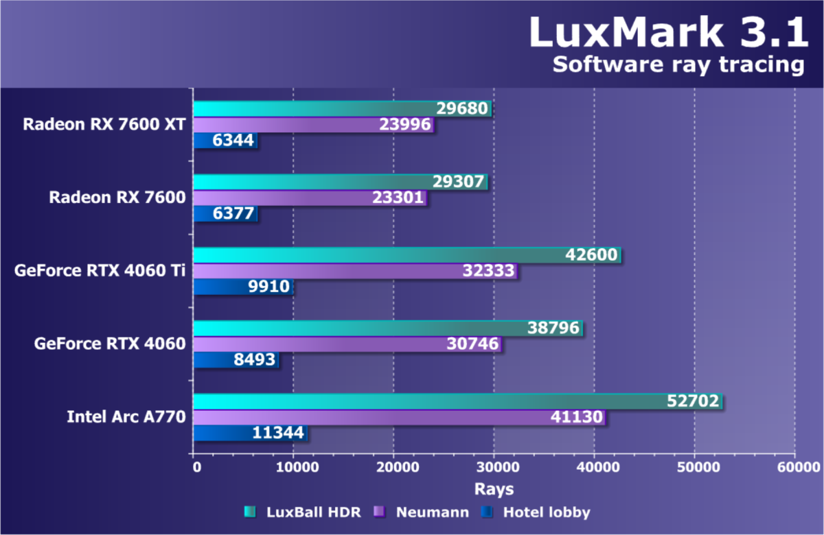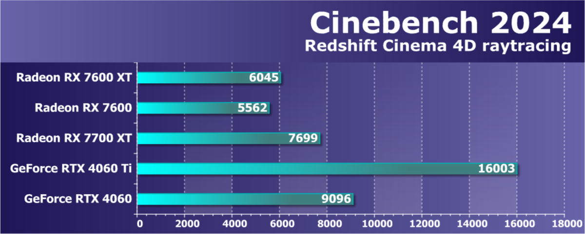 | 18 | RX 7600 XT 16 ГБ, 2755—2790/18000 | 779 | 181 | 43 000 |