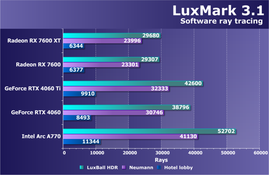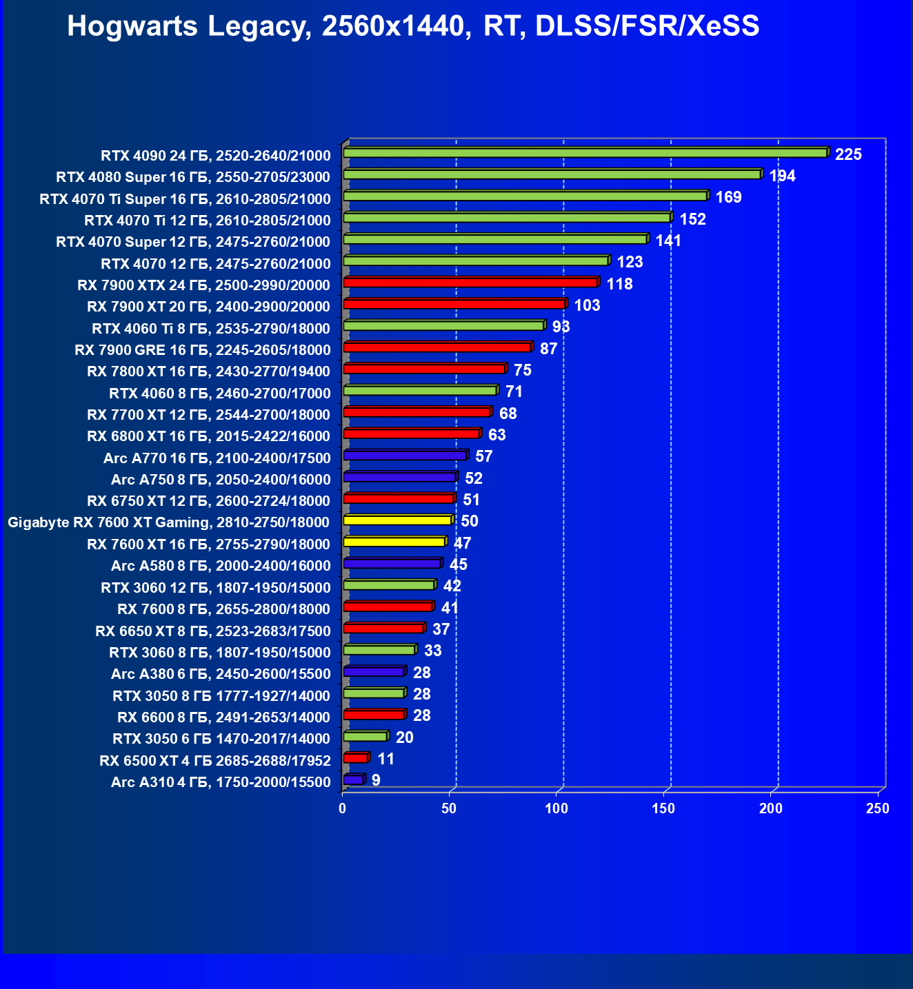 | 10 | Arc A750 8 ГБ, 2050—2400/16000 | 231 | 762 | 33 000 |