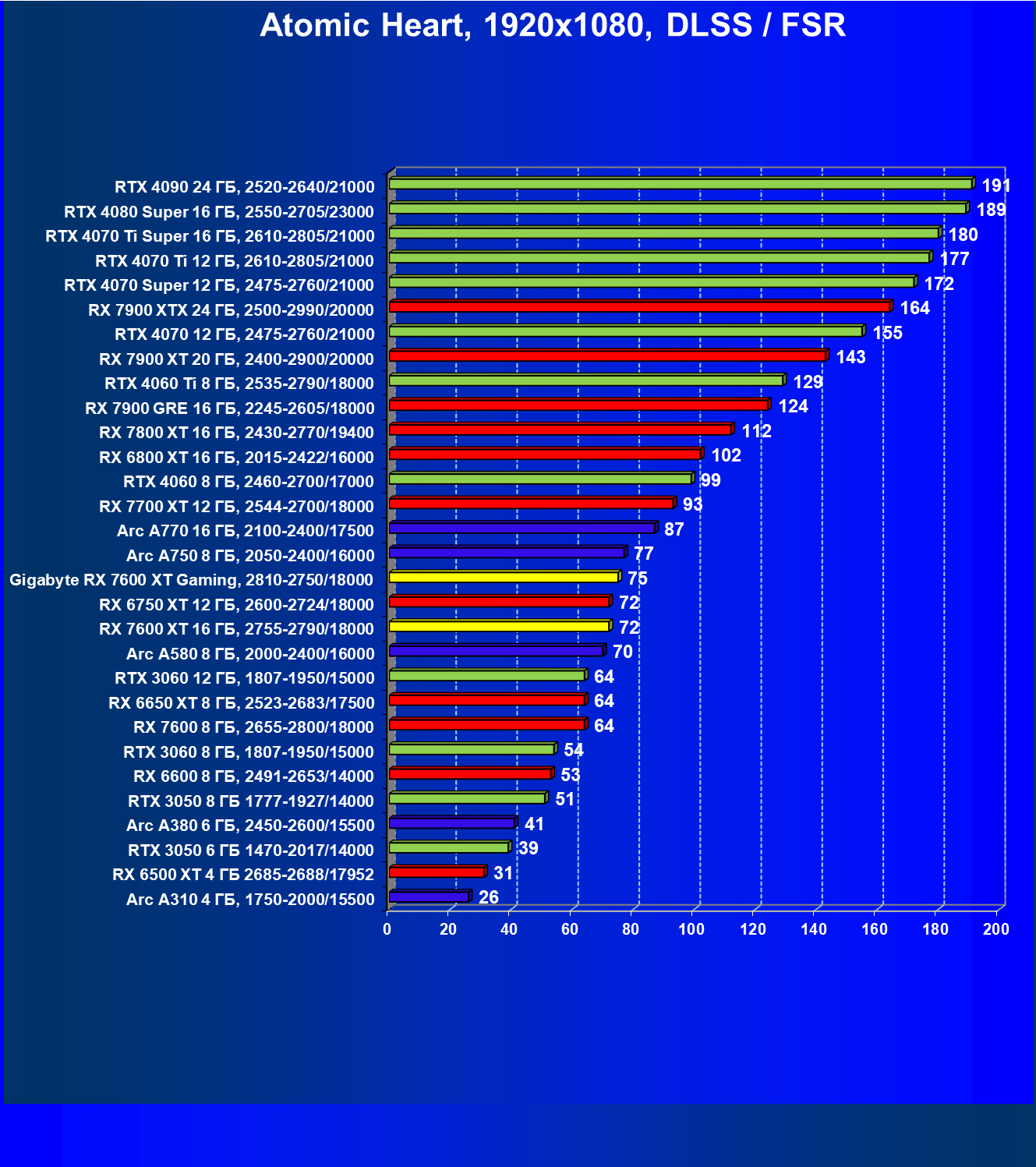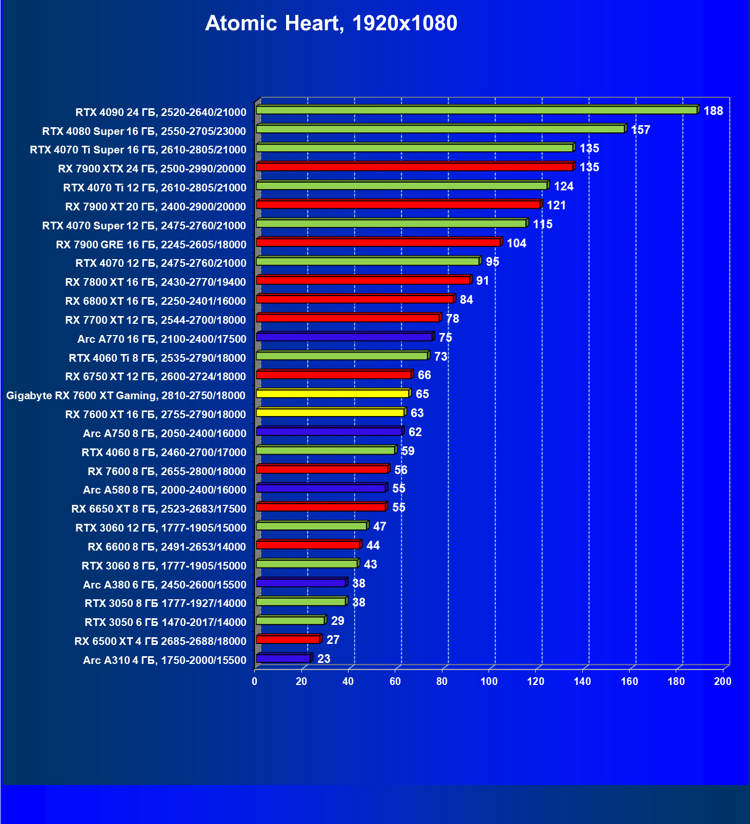 | 21 | RX 7600 8 ГБ, 2655—2900/17904 | 661 | 207 | 32 000 |