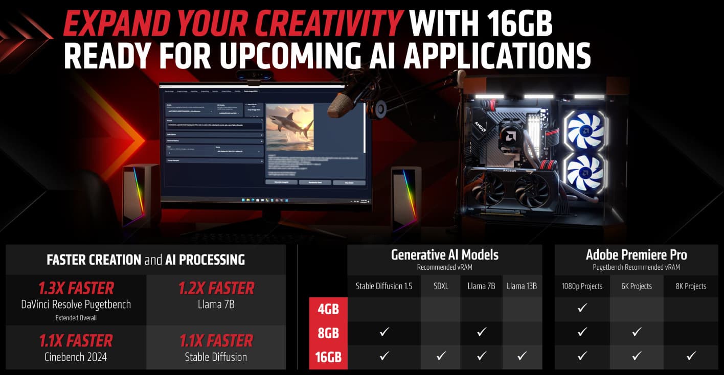 Но самый интересный вопрос касается объема видеопамяти. Исходя из ширины шины видеопамяти в 128 бит, выбор был между 8 и 16 ГБ, и меньший уже занят Radeon RX 7600. Так как AMD много говорит о важности объема видеопамяти для современных игр даже в сравнительно низких разрешениях и при не максимальных настройках качества, то на XT-вариант они решили поставить 16 ГБ. Чтобы удвоить объем видеопамяти, AMD сделала примерно то же самое, что и Nvidia в своей GeForce RTX 4060 Ti с 16 ГБ. Но, в отличие от конкурента, они добавили к цене не $100, а «всего лишь» $60. Решение в целом довольно спорное, ведь для бюджетной видеокарты объем в 8 ГБ до сих пор можно считать достаточным. В не самых оптимизированных играх может использоваться до 10-12 ГБ видеопамяти, но одного лишь увеличения объема памяти вряд ли будет достаточно для решения с таким уровнем вычислительной производительности. И всё же, 16 ГБ перспективнее, чем 8 ГБ или 12 ГБ видеопамяти у других решений этого уровня, если смотреть в будущее.