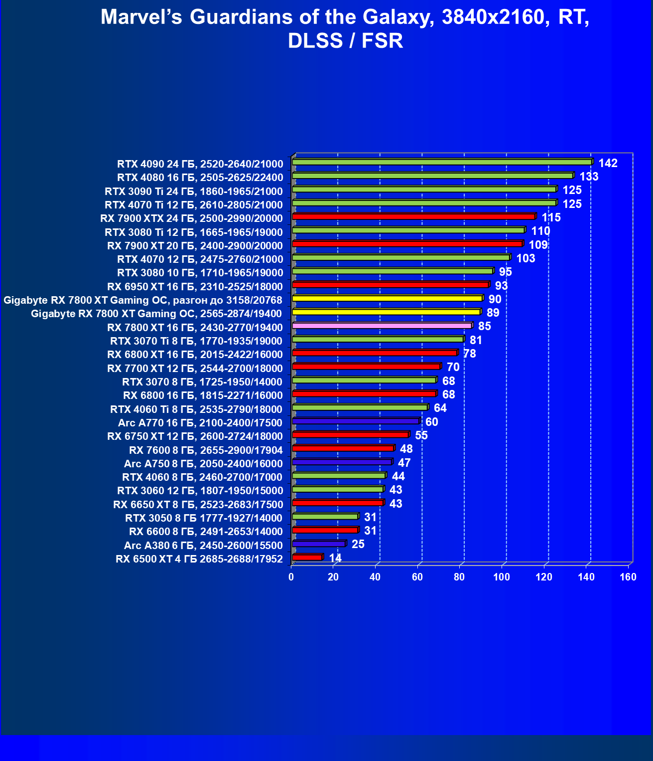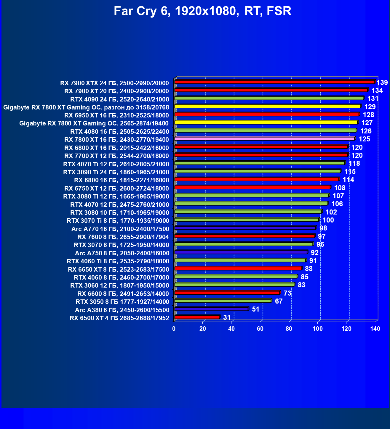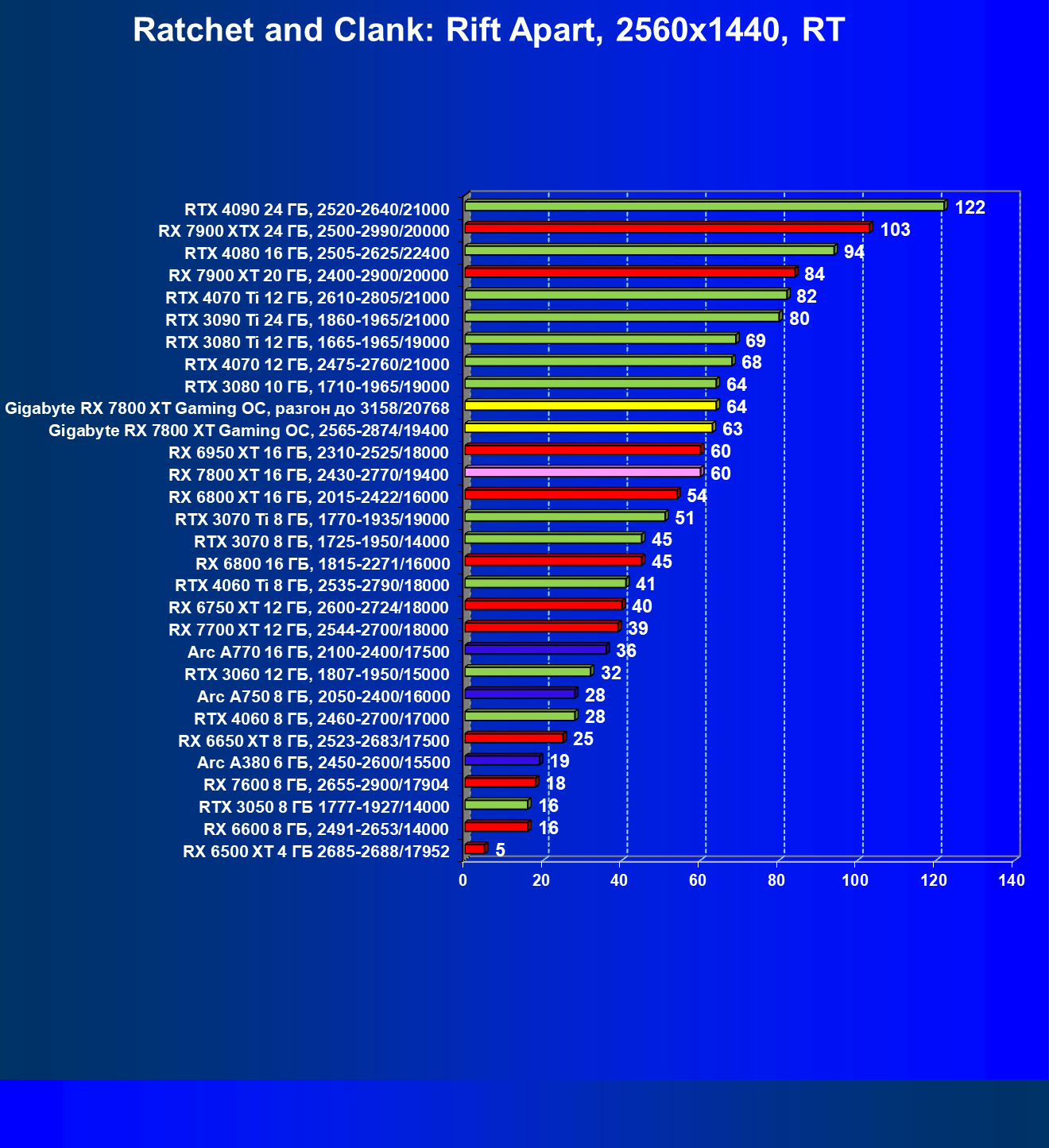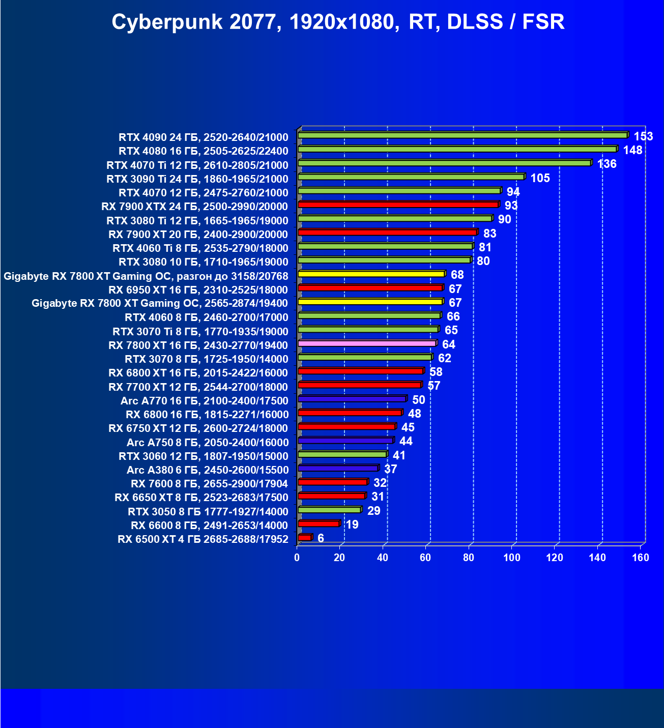 | 14 | RX 7800 XT 16 ГБ, 2430—2770/19400 | 86 | 543 | 63 000 |