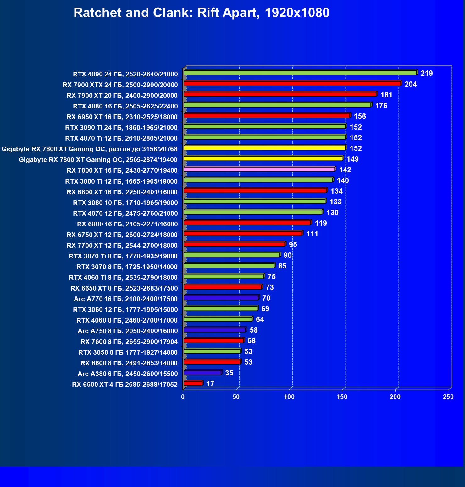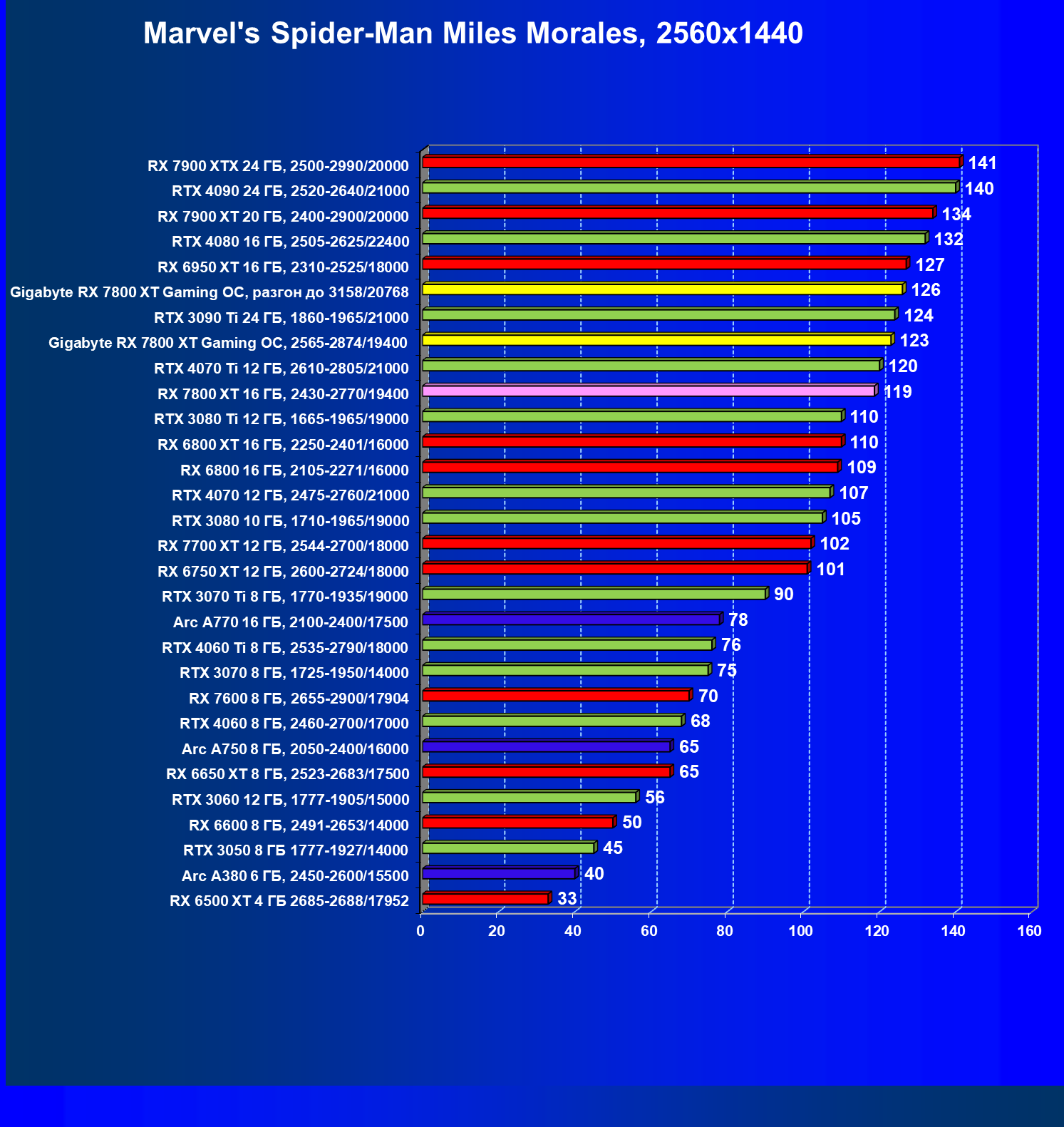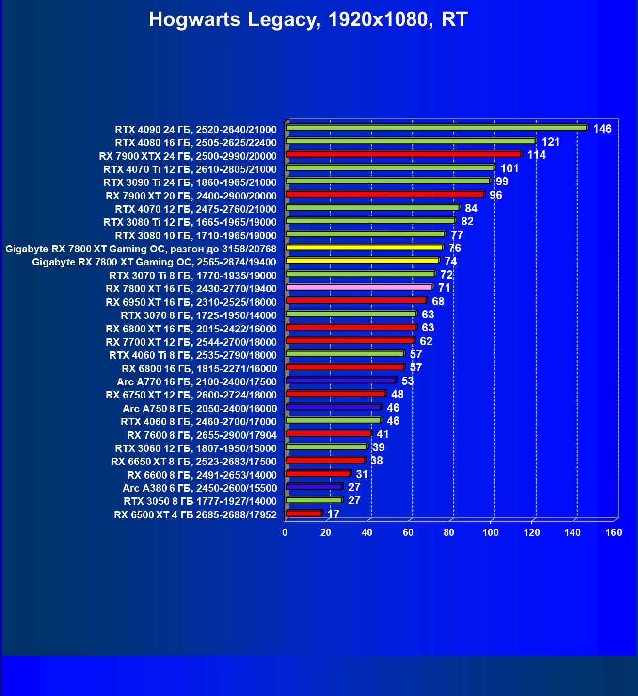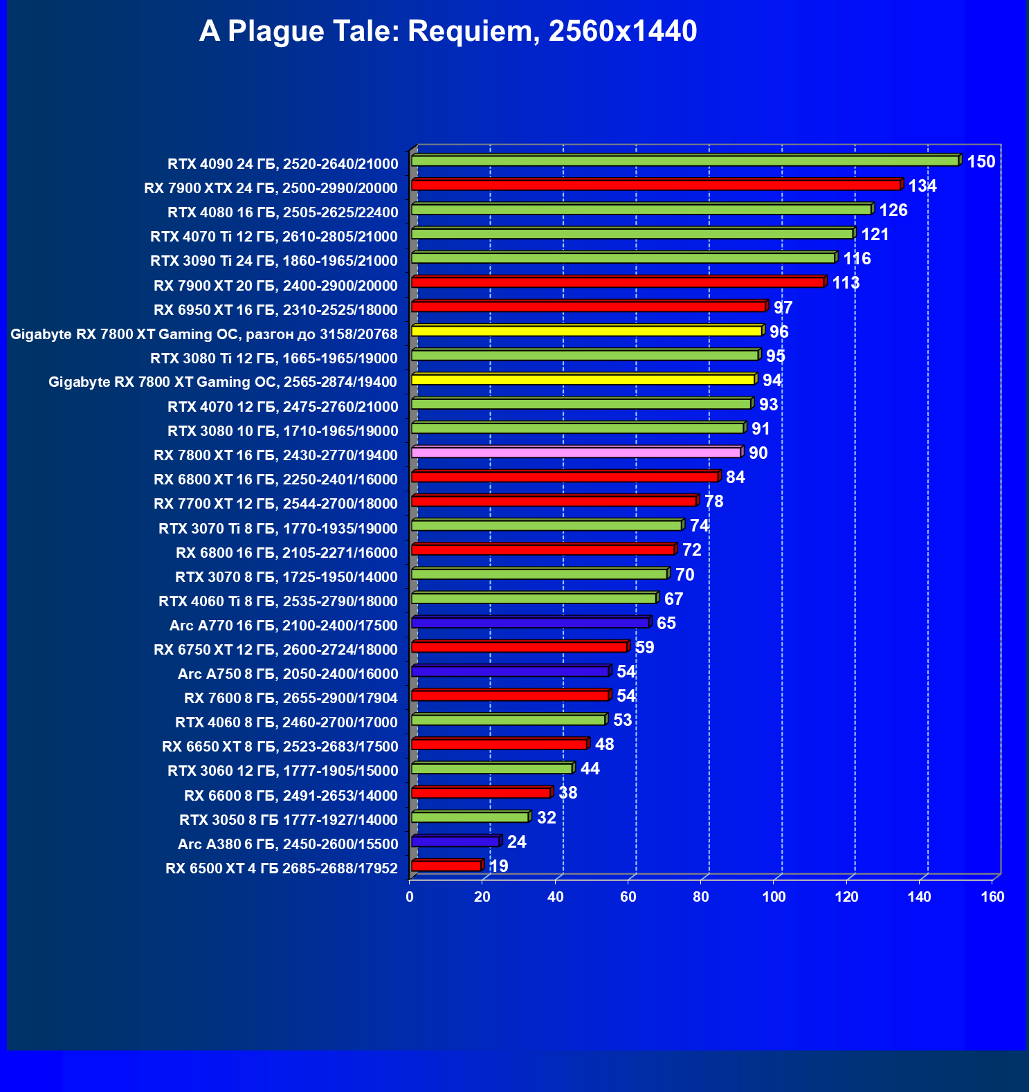 | 14 | RX 7800 XT 16 ГБ, 2430—2770/19400 | 86 | 543 | 63 000 |