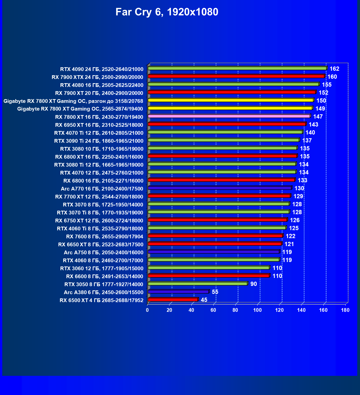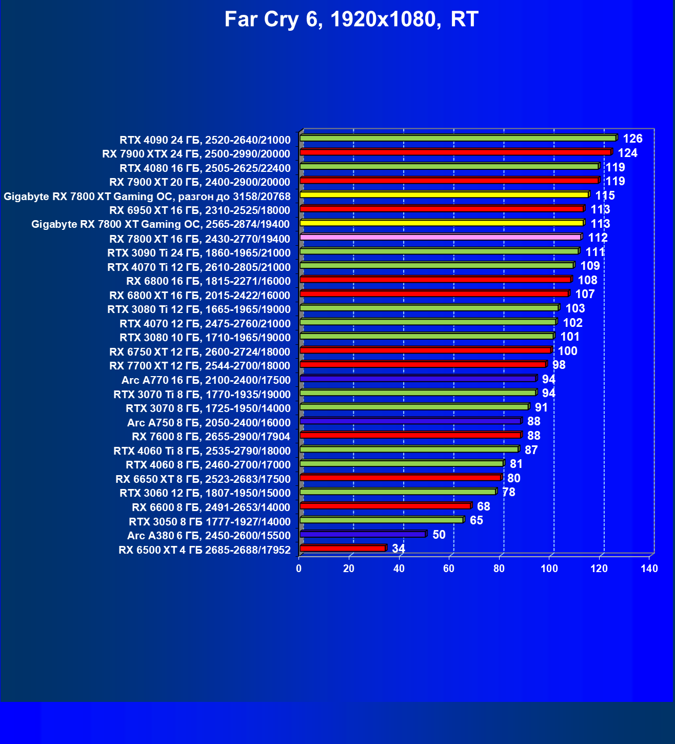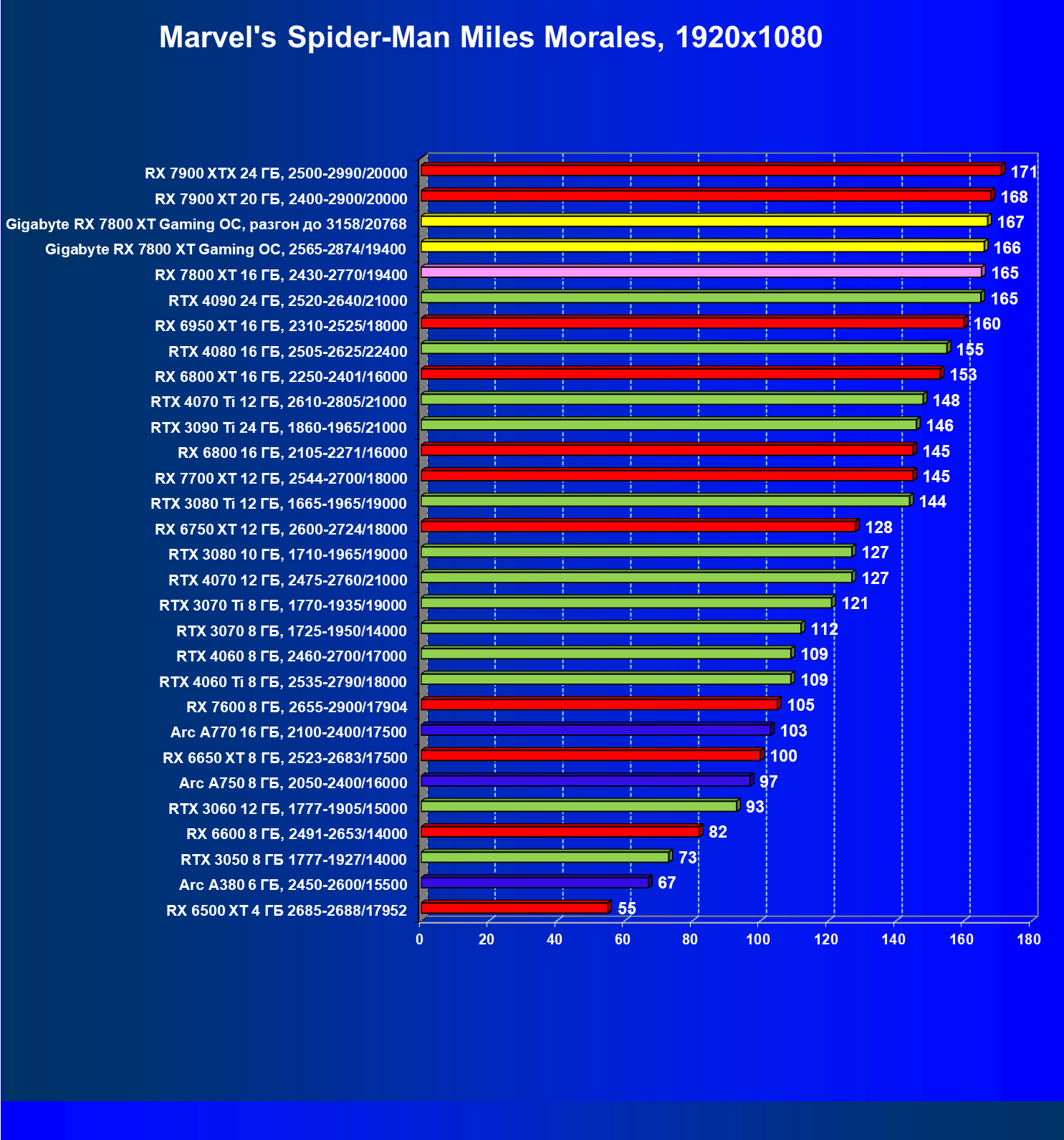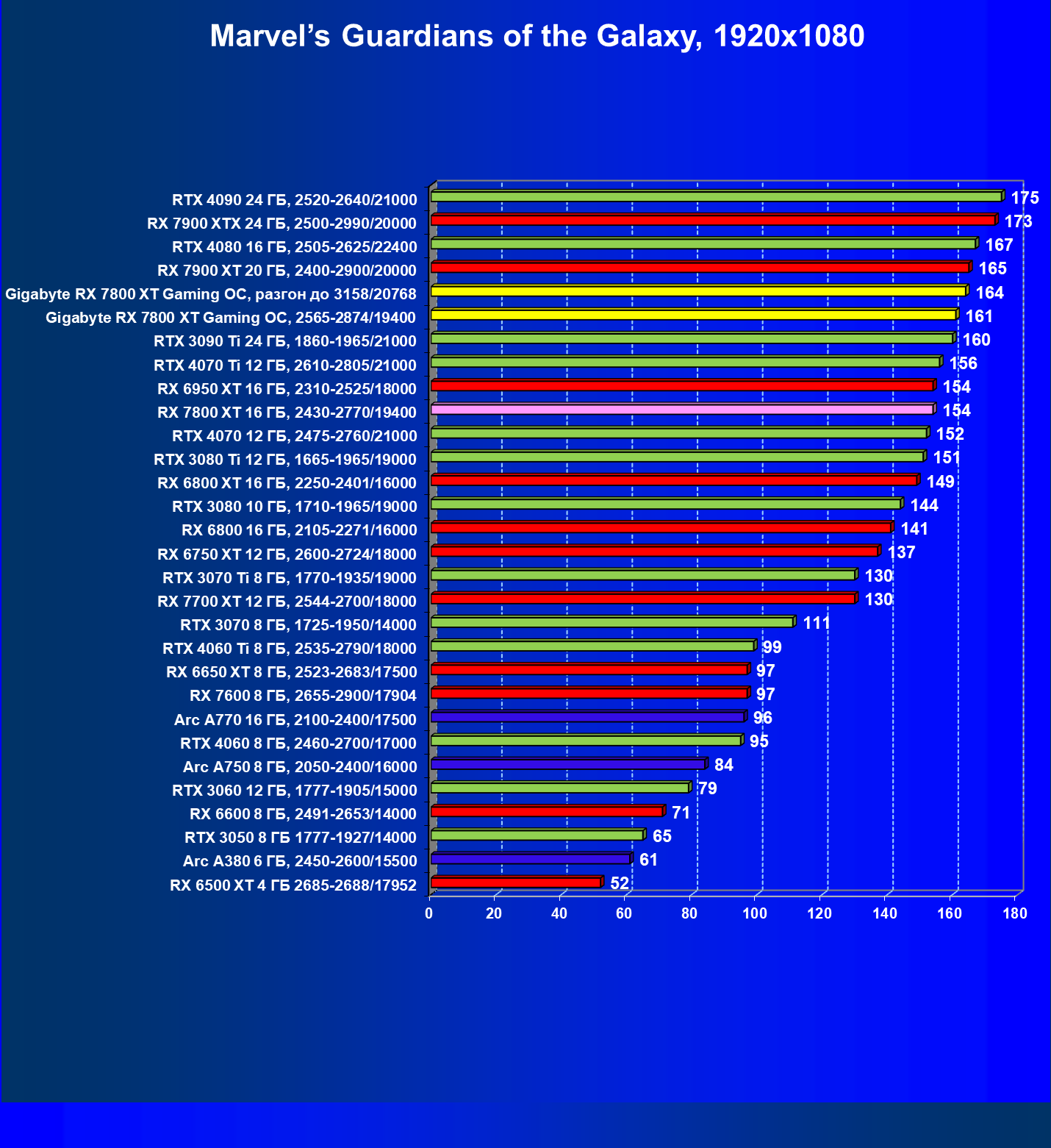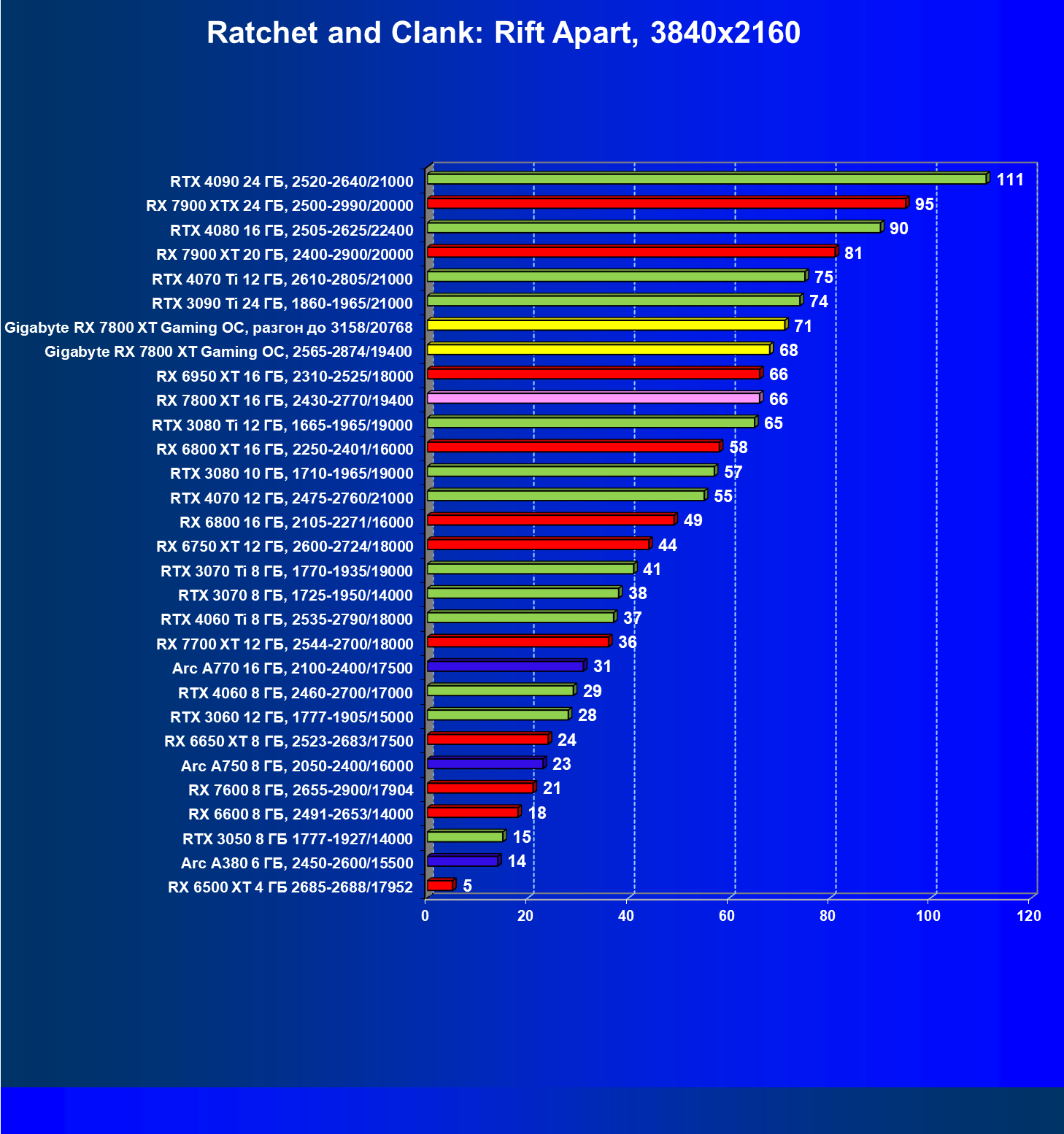 | 14 | RX 7800 XT 16 ГБ, 2430—2770/19400 | 86 | 543 | 63 000 |
