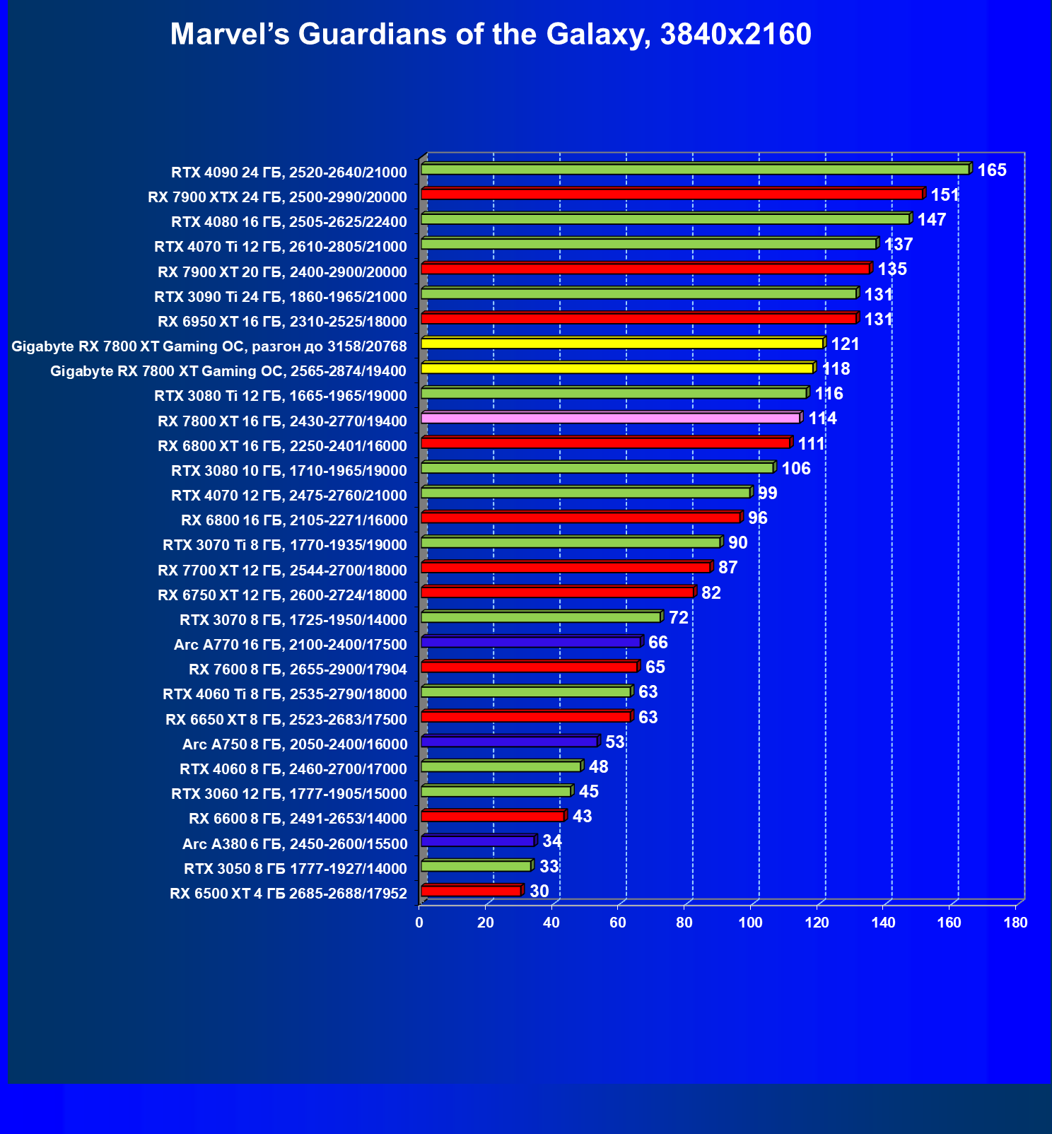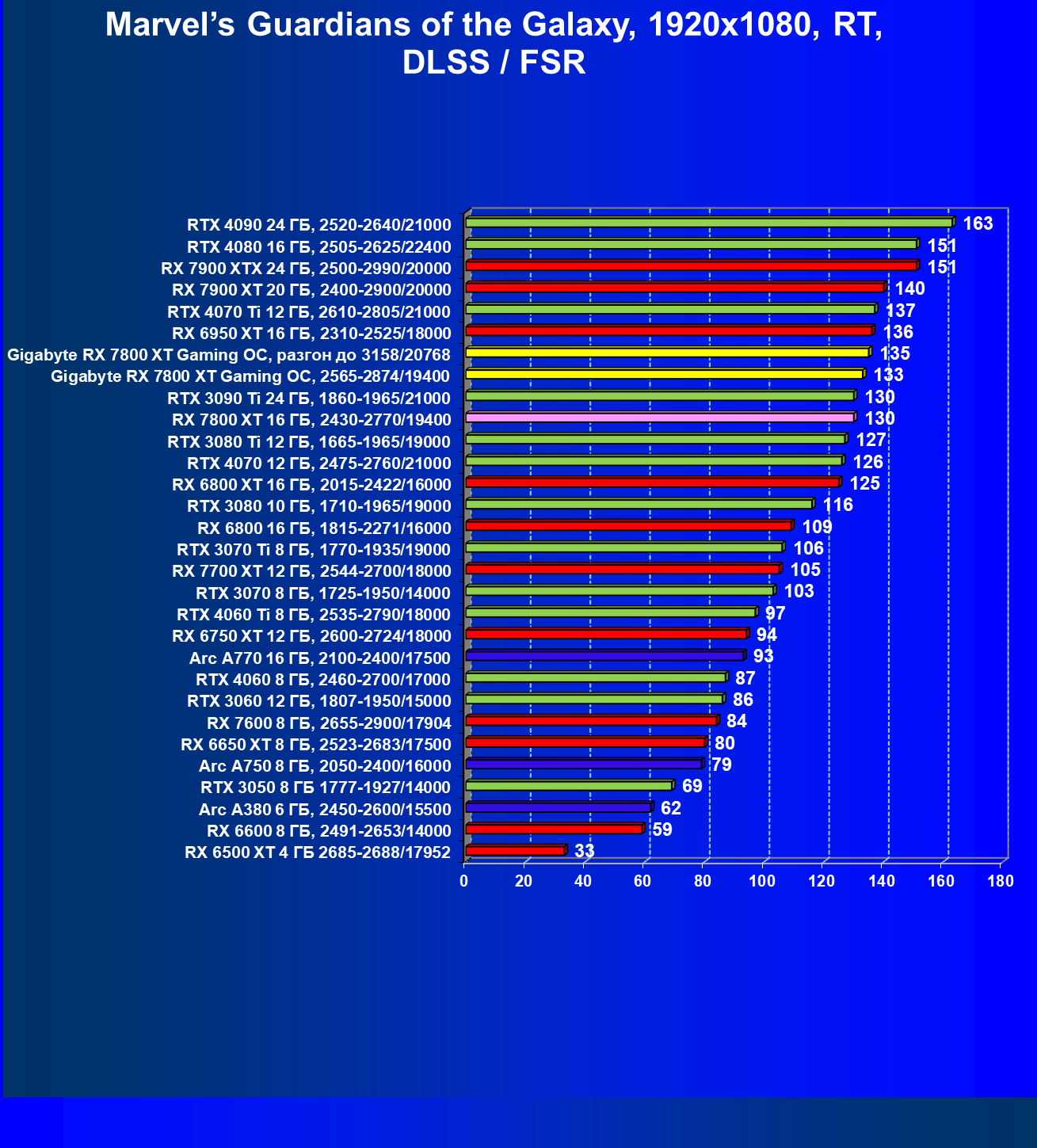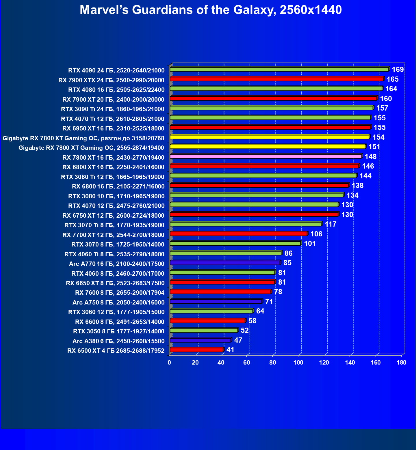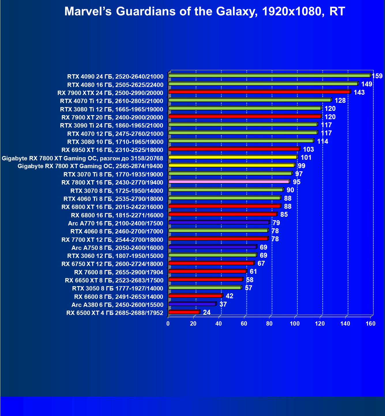 | 14 | RX 7800 XT 16 ГБ, 2430—2770/19400 | 86 | 543 | 63 000 |