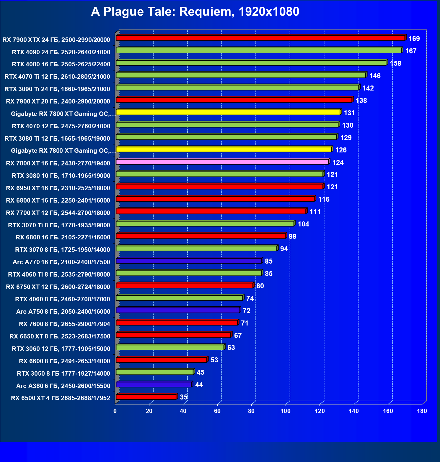 В целом всё логично: старенький GeForce RTX 3080 отстает ото всех новинок по производительности, но он уже успел существенно подешеветь, так что оказался лидером группы. Сразу за ним следует Radeon RX 7800 XT, в том числе в варианте карты Gigabyte, опережая GeForce RTX 4070 и по производительности, и по стоимости на нашем рынке (на момент подготовки обзора).
