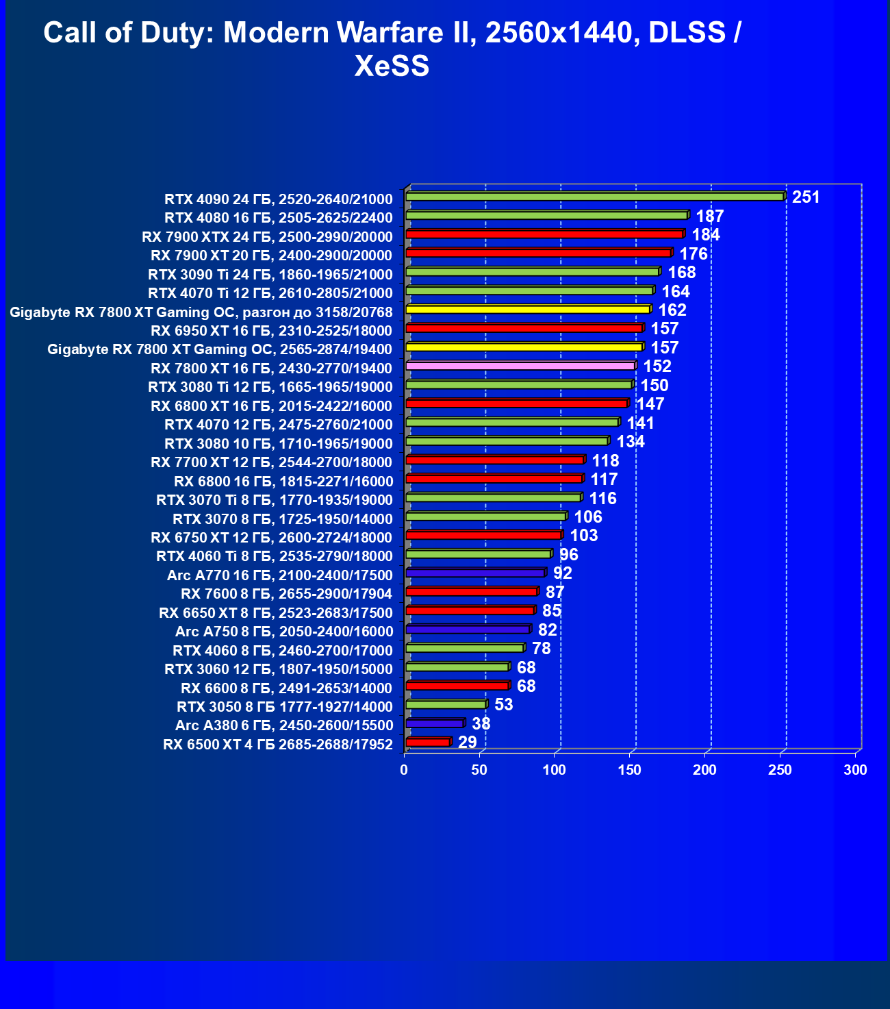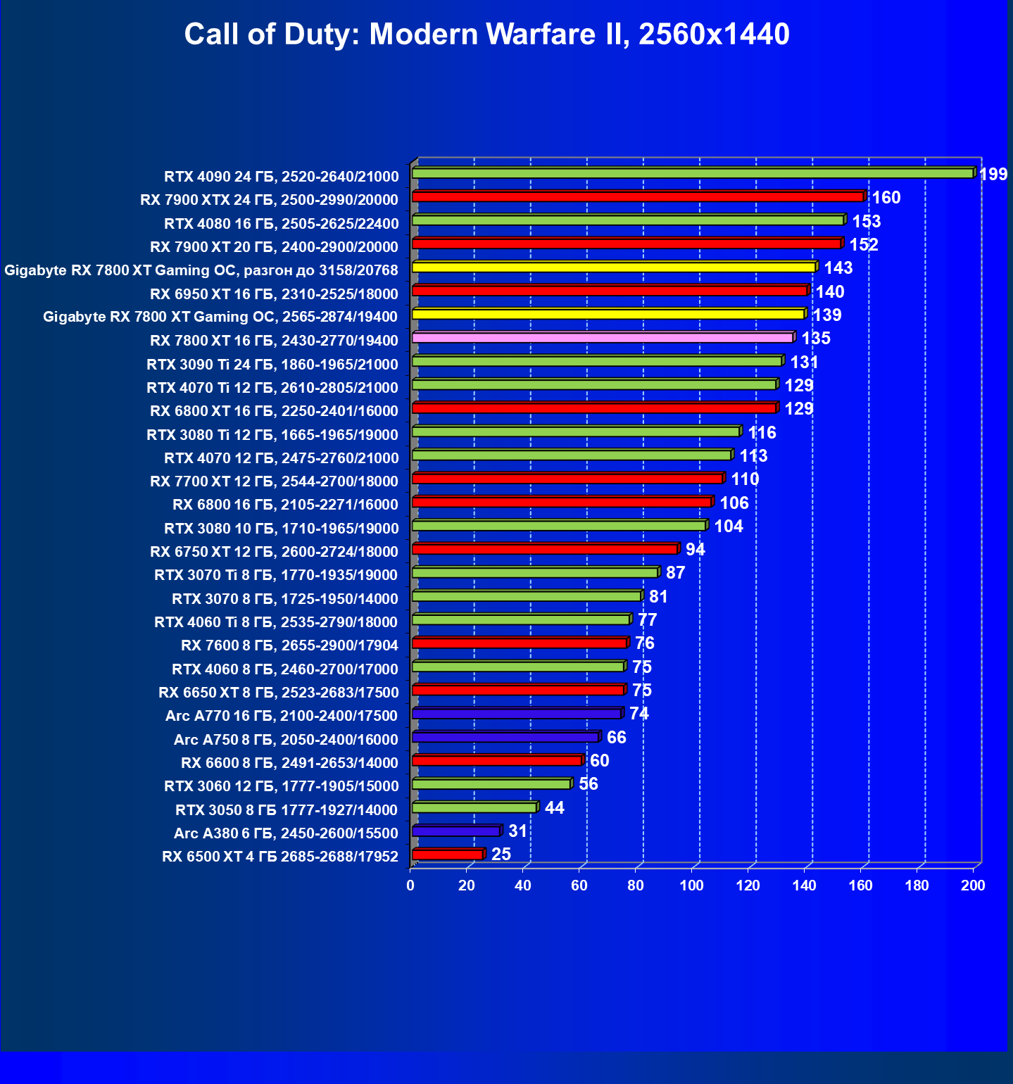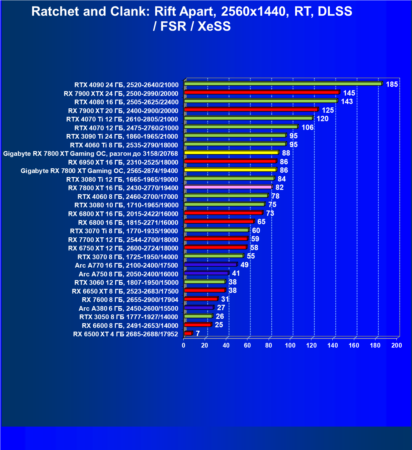 | 11 | Gigabyte RX 7800 XT, 2565—2874/19400 | 88 | 562 | 64 000 |