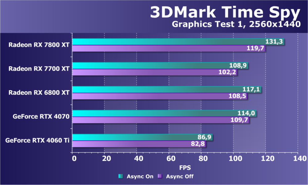 В качестве прямого конкурента для новинки мы взяли GeForce RTX 4070, но нужно учитывать, что она стоит на 20% дороже. Поэтому мы добавили в список еще и RTX 4060 Ti, хотя эта видеокарта уже явно заметно дешевле и также не соперничает напрямую с рассматриваемой нами сегодня моделью. Такое сравнение сразу с двумя соперниками Nvidia поможет нам понять, насколько RX 7800 XT хороша против близких по цене конкурирующих моделей.