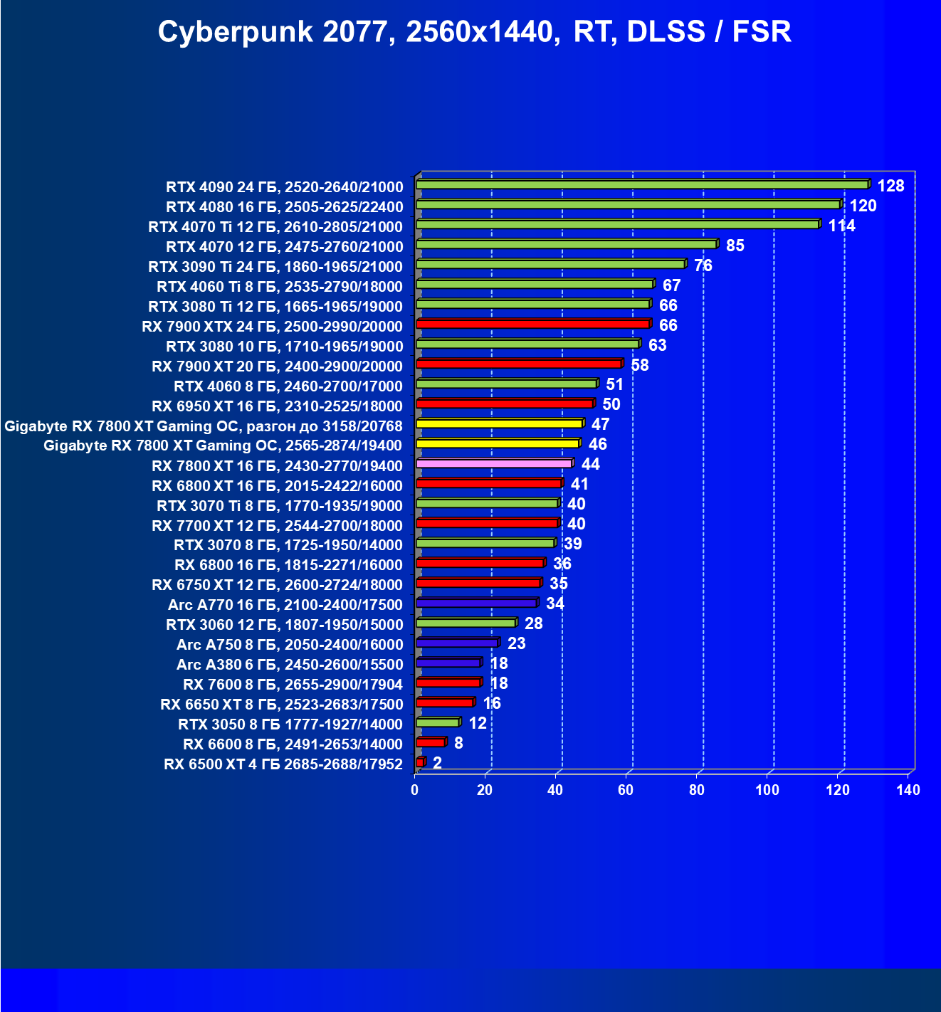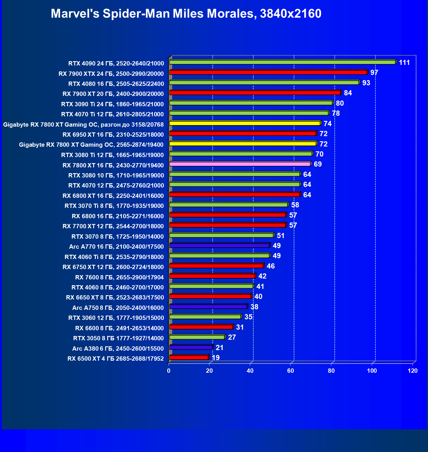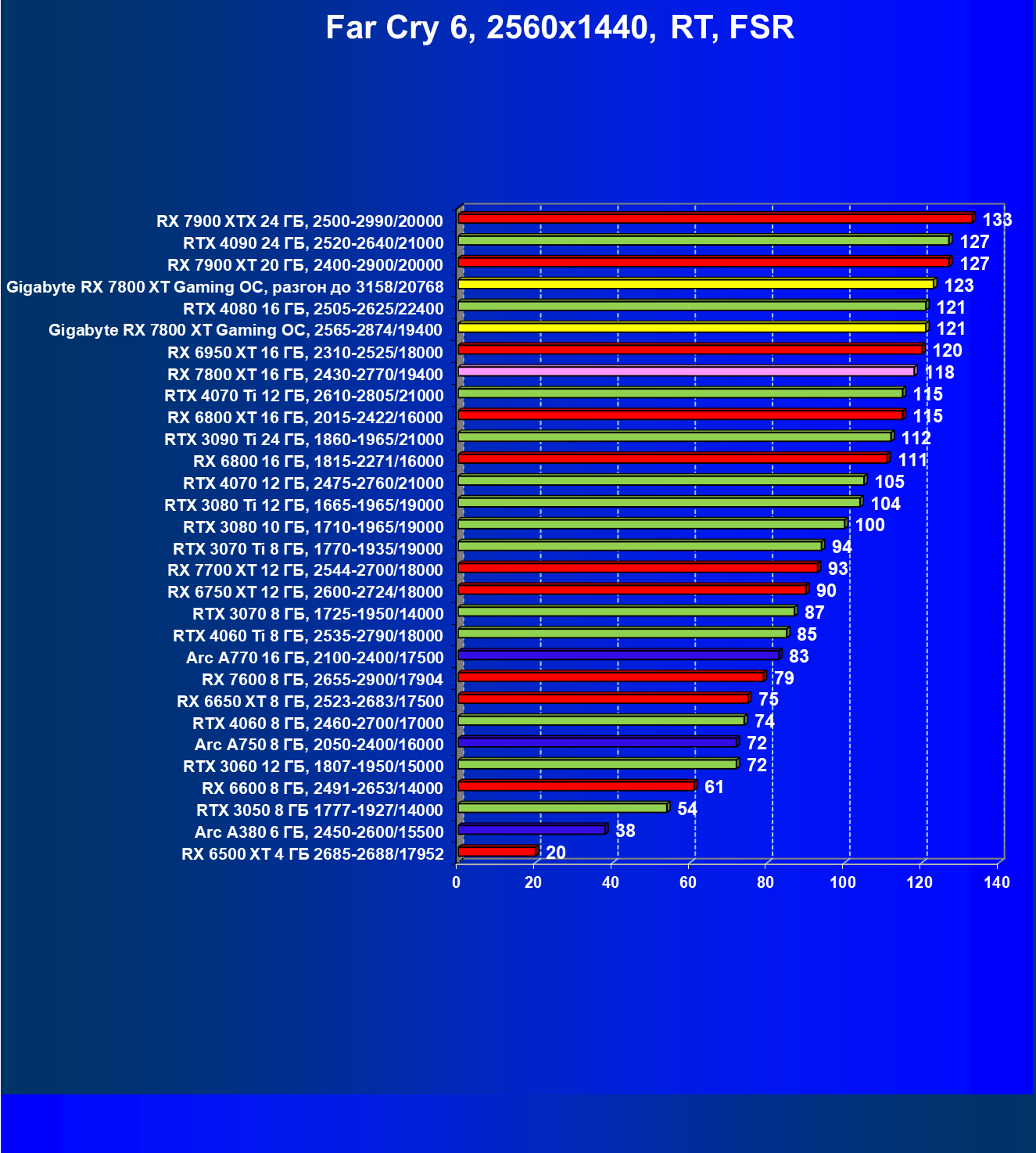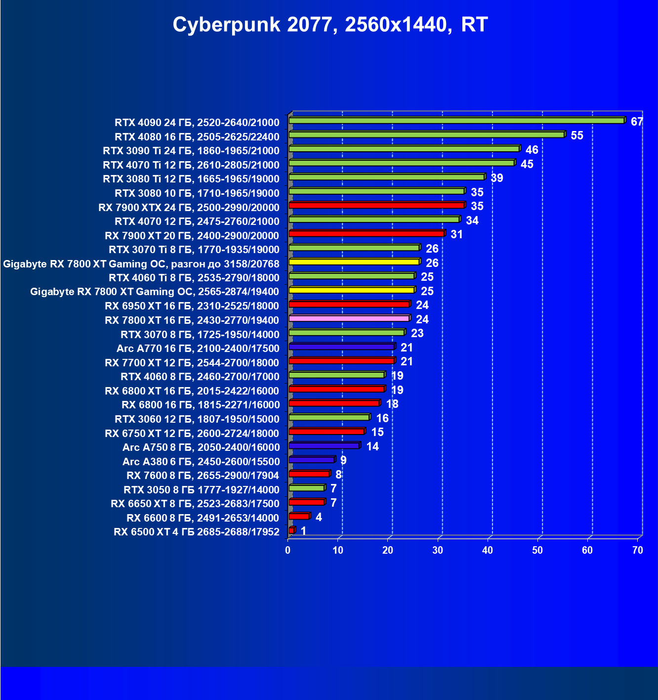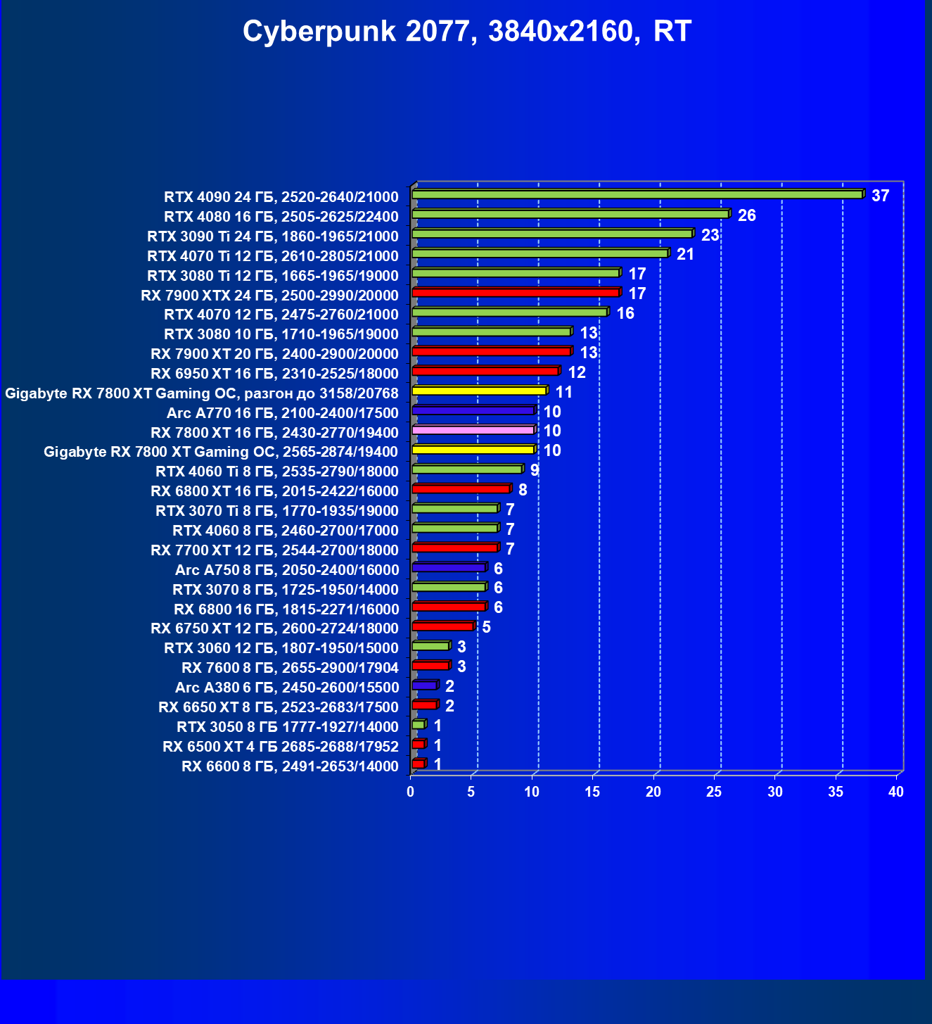 | 11 | RX 7800 XT 16 ГБ, 2430—2770/19400 | 543 | 86 | 63 000 |