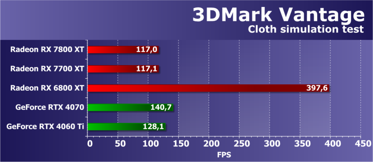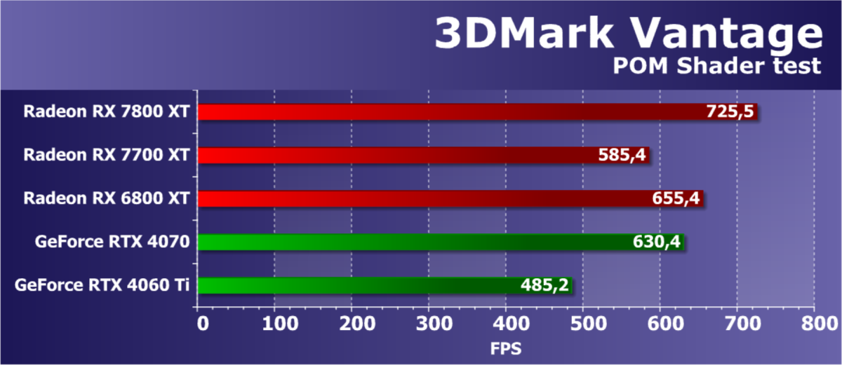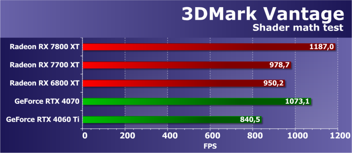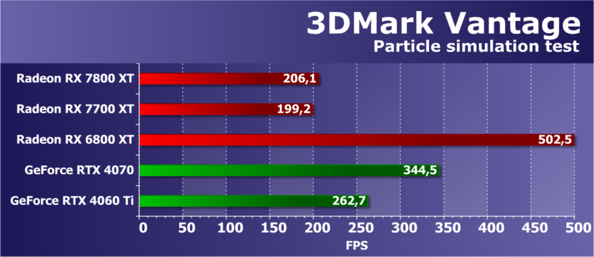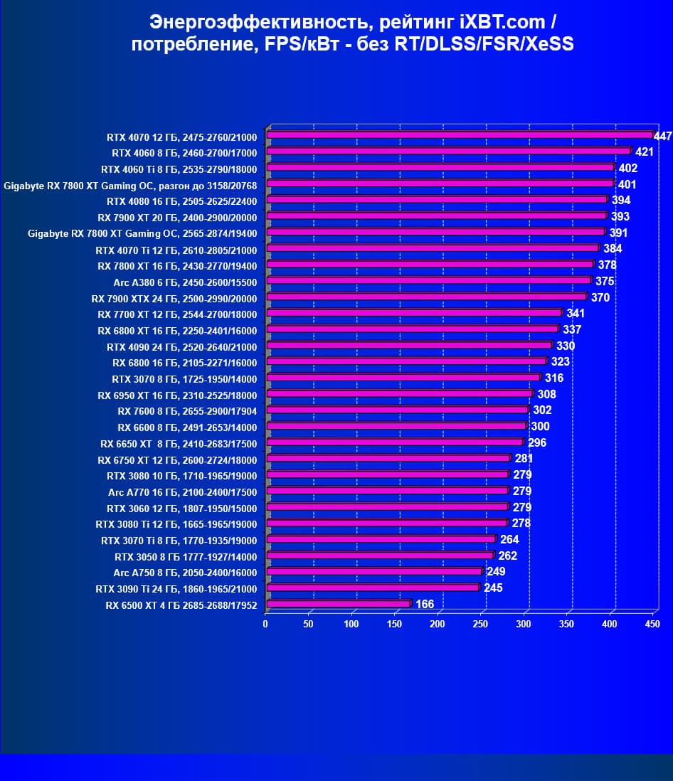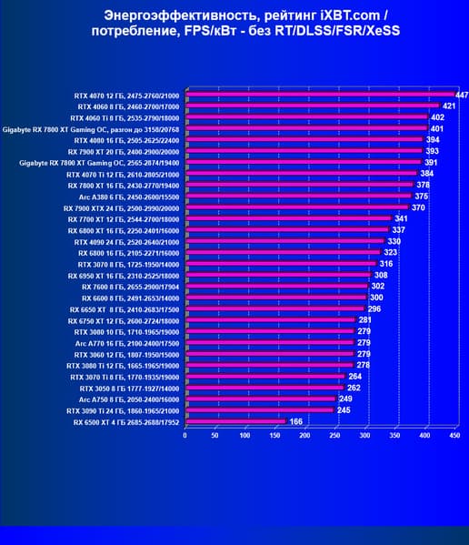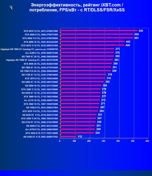 Если посмотреть на энергоэффективность, то GeForce RTX 4070 опять в лидерах, и тому же Radeon RX 7800 XT до него далековато.