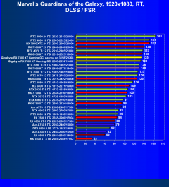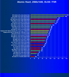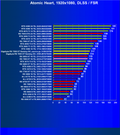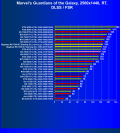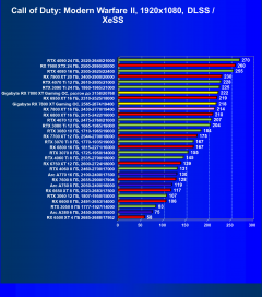 Рейтинг составлен по 9 тестам, в которых используется технология трассировки лучей и одновременно технология Nvidia DLSS, AMD FSR или Intel XeSS. Этот рейтинг нормирован по самому слабому ускорителю в данной группе — Radeon RX 6500 XT (то есть сочетание скорости и функций Radeon RX 6500 XT приняты за 100%).