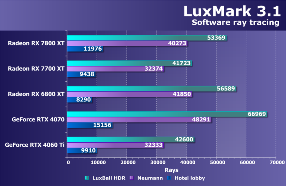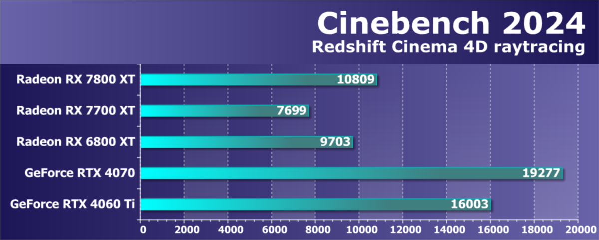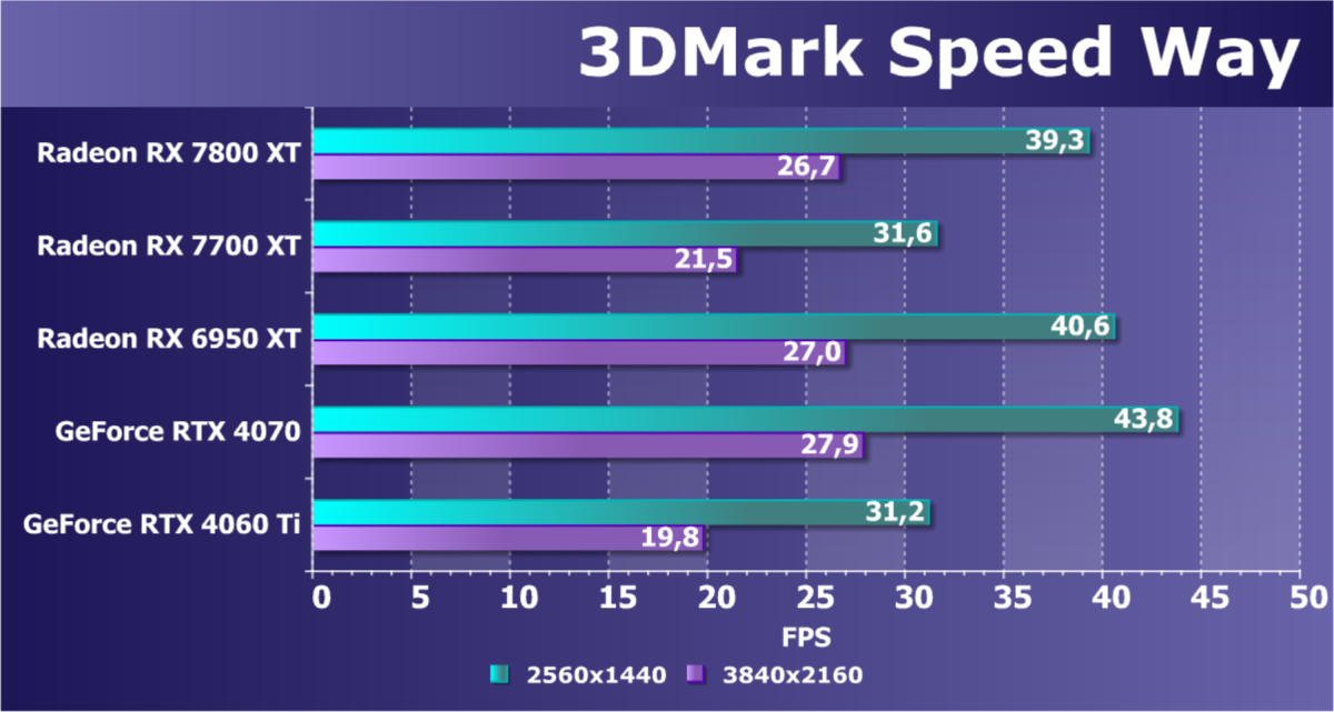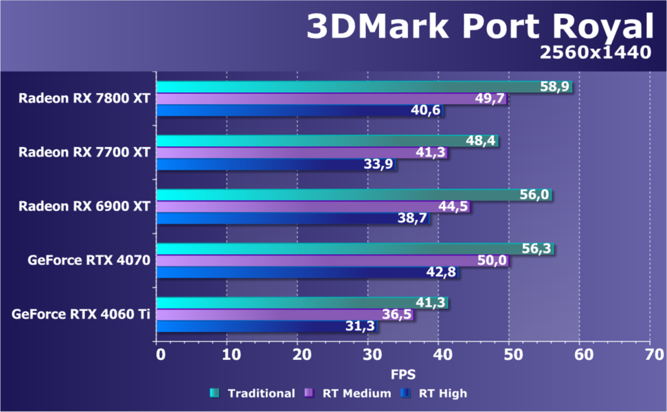 Radeon RX 7800 XT в играх без трассировки лучей обеспечит отменный комфорт в разрешениях от 1080p до 2160p (4K) включительно. Он опережает своего предшественника Radeon RX 6800 XT и вполне может заменить и его, и Radeon RX 6900 XT. Новый ускоритель конкурирует с GeForce RTX 3080 Ti, а также, хотя и менее успешно, с GeForce RTX 4070 Ti, будучи значительно быстрее, чем GeForce RTX 4070.
