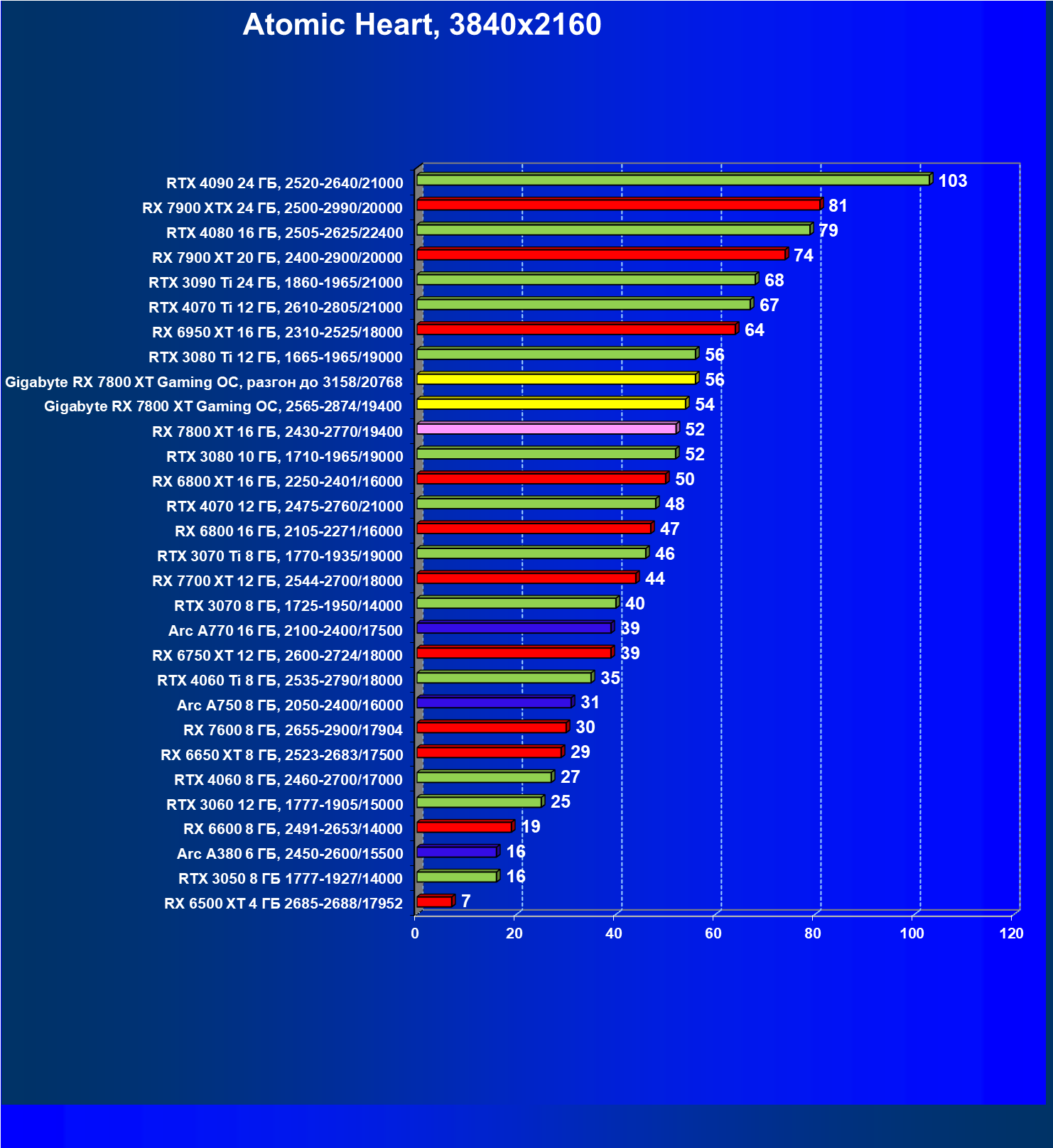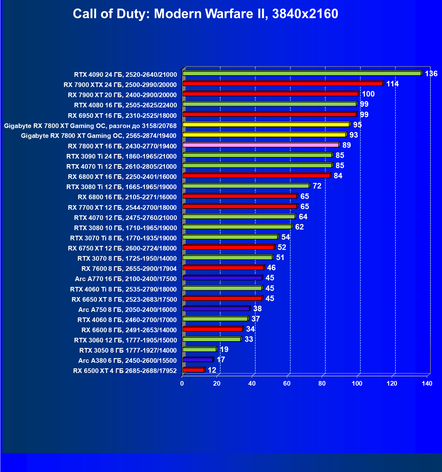 | 14 | Gigabyte RX 7800 XT, 2565—2874/19400 | 120 | 770 | 64 000 |