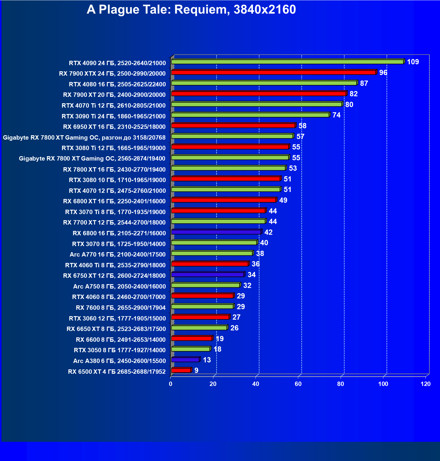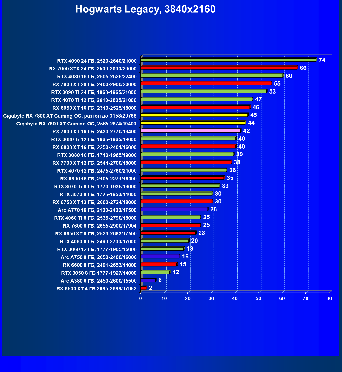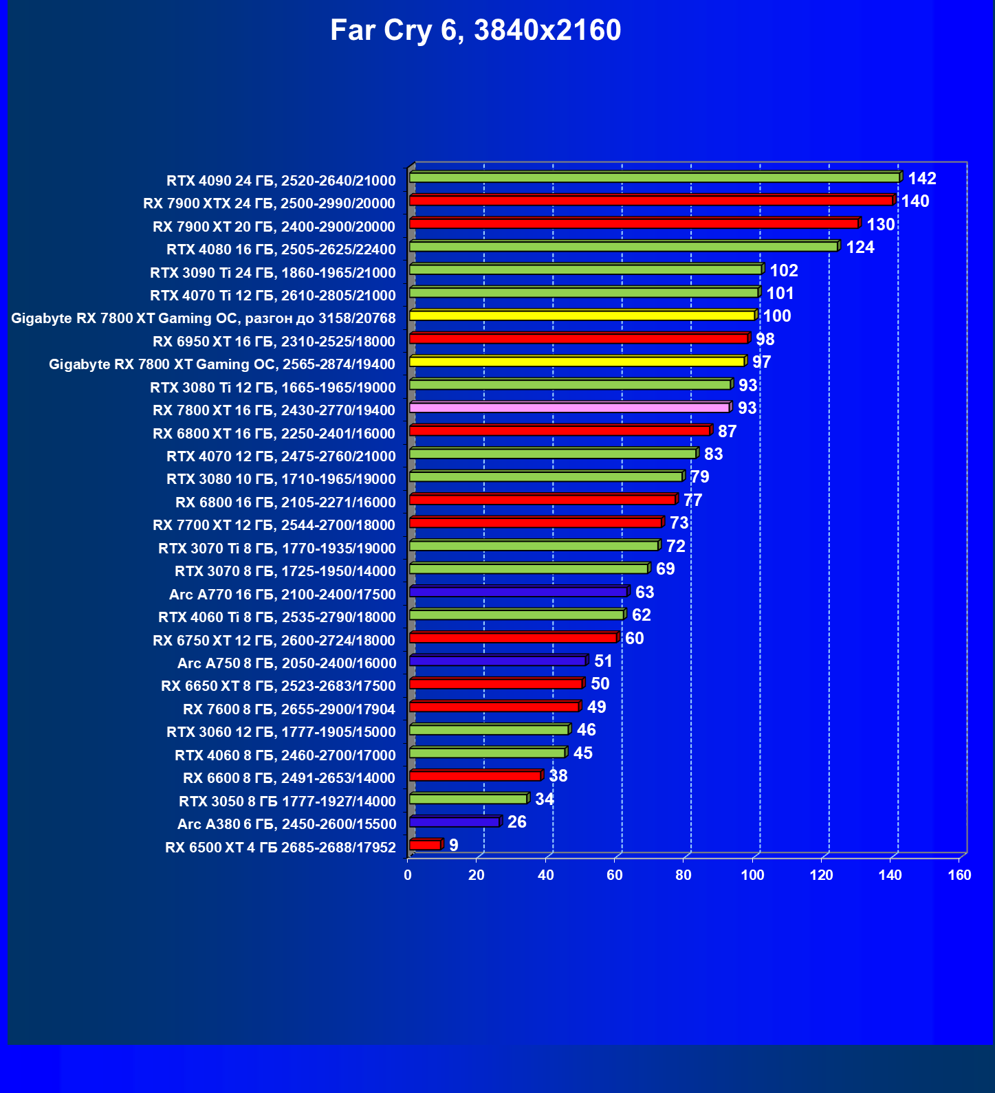 | 11 | Gigabyte RX 7800 XT, 2565—2874/19400 | 770 | 120 | 64 000 |