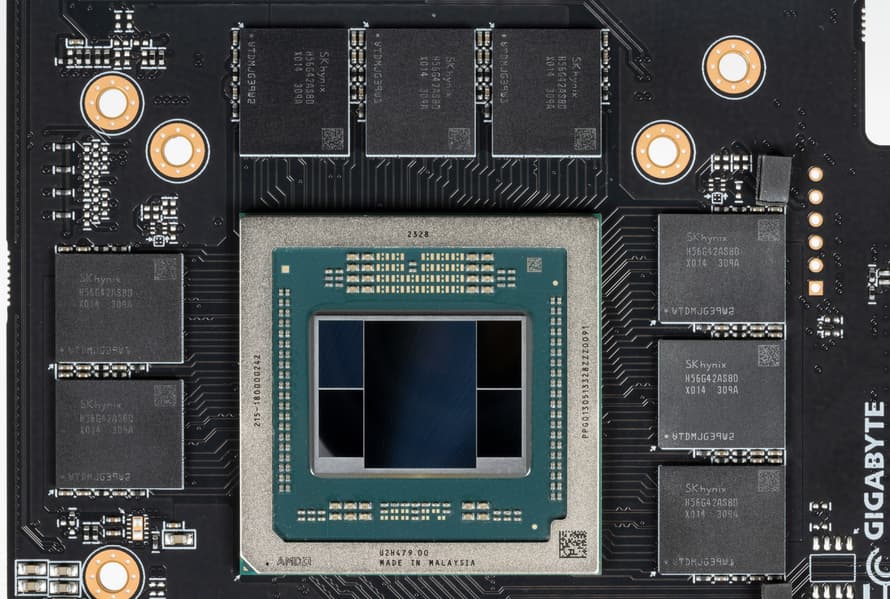 Основной вычислительный кристалл GCD использует техпроцесс EUV 5 нм и содержит все основные блоки графического процессора, площадь основного чиплета Navi 31 составляет 300 мм², а Navi 32 — 200 мм². Кристаллы MCD производятся при помощи техпроцесса DUV 6 нм той же TSMC и имеют площадь в 37,5 мм² каждый — они одинаковы для Navi 31 и 32. Поэтому Navi 31 имеет общую суммарную площадь 525 мм², а Navi 32 — чуть меньше 350 мм². И это довольно много, так как площадь монолитного графического процессора AD104, на котором основана видеокарта GeForce RTX 4070 с близкой ценой, составляет всего лишь 294 мм². Общее количество транзисторов в Navi 32 равно 28,1 млрд, когда в тот же AD104 поместили уже 35,8 млрд транзисторов.