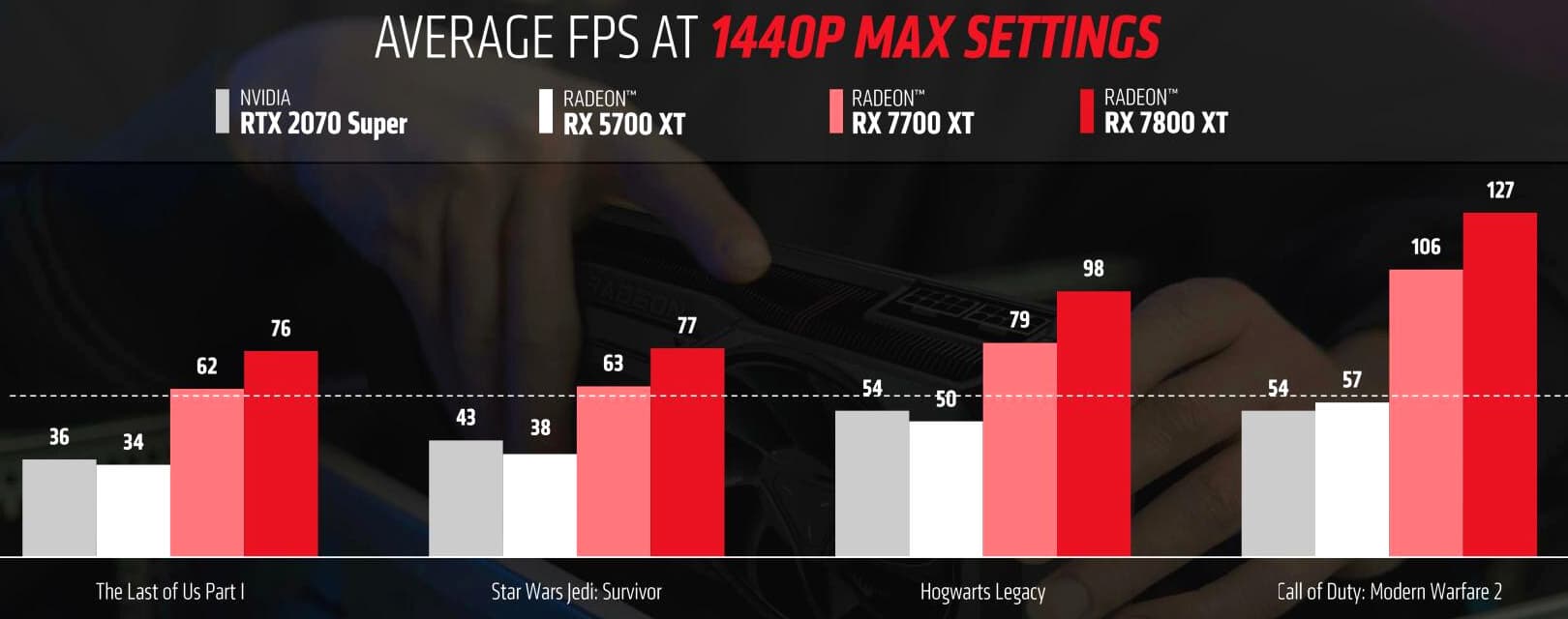 Можно рассматривать обе новые видеокарты AMD как вариант для модернизации игровых систем с GPU предыдущих поколений, ведь они значительно производительнее как Radeon RX 5700 XT, так и GeForce RTX 2070 Super (по данным самой AMD). Radeon RX 7800 XT — отличная видеокарта для любых игр при разрешении 2560×1440, почти во всех проектах она с легкостью даст 60 кадров в секунду или более, и это при максимальных настройках — разве что кроме самых требовательных современных игр с применением трассировки лучей.