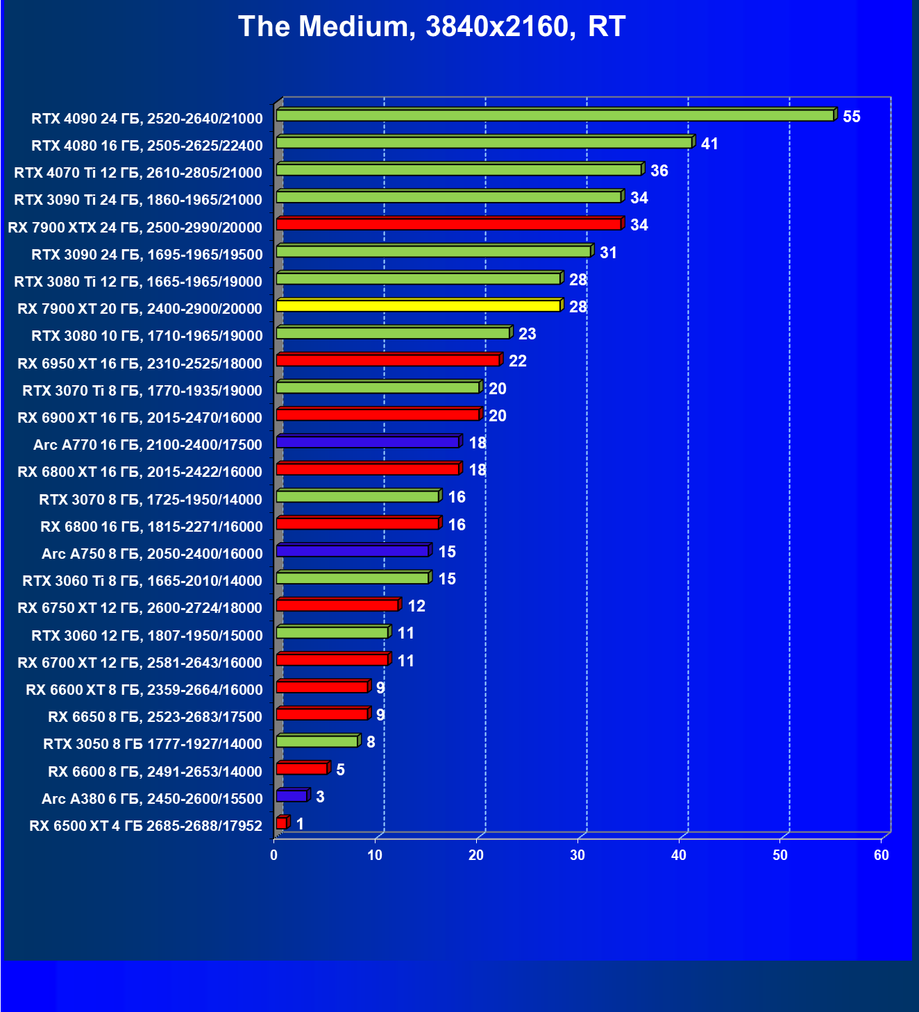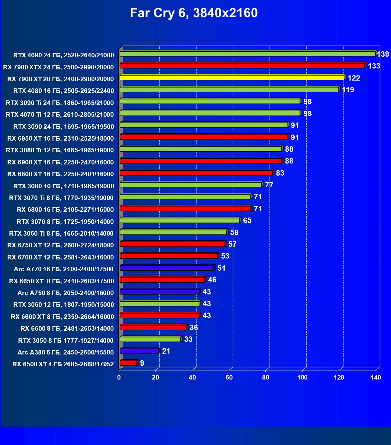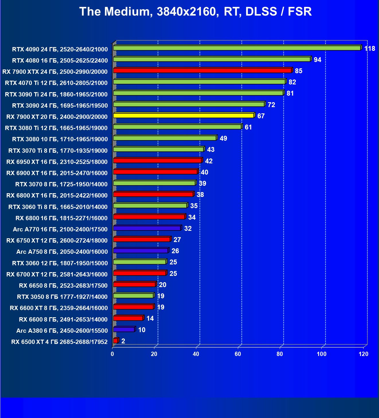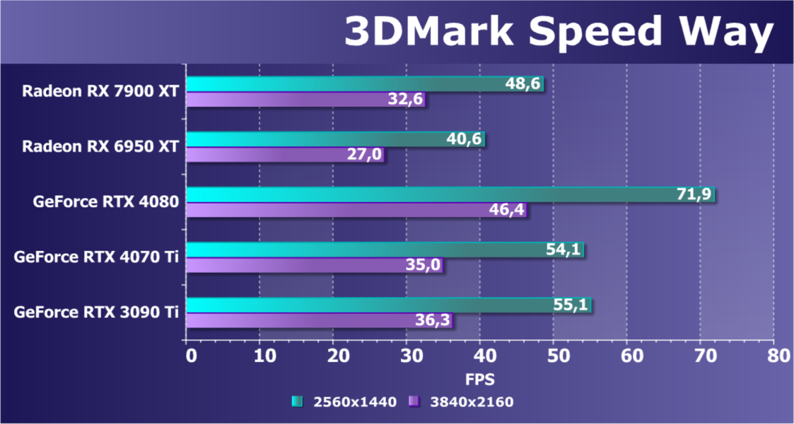 Здесь всё понятно: в разрешениях 1080p (Full HD) и 1440p (2.5K) новинка AMD выступает на уровне флагманов последних поколений и обеспечивает полный комфорт в играх с максимальными настройками графики. В 2160p (4K) Radeon RX 7900 XT близок по производительности к GeForce RTX 3090 Ti и GeForce RTX 4070 Ti.