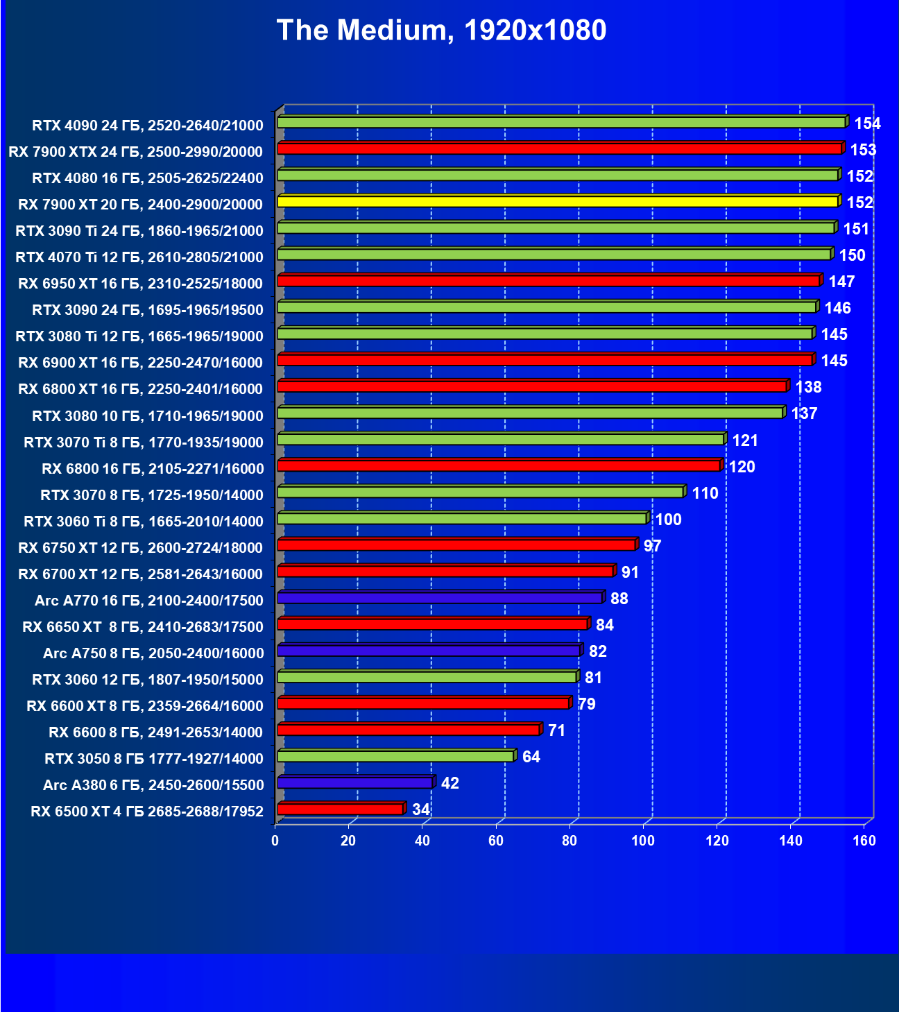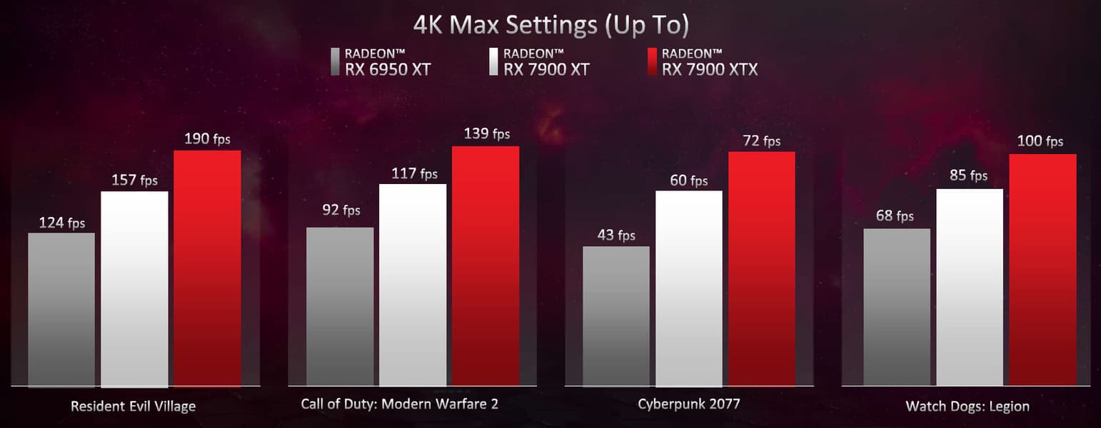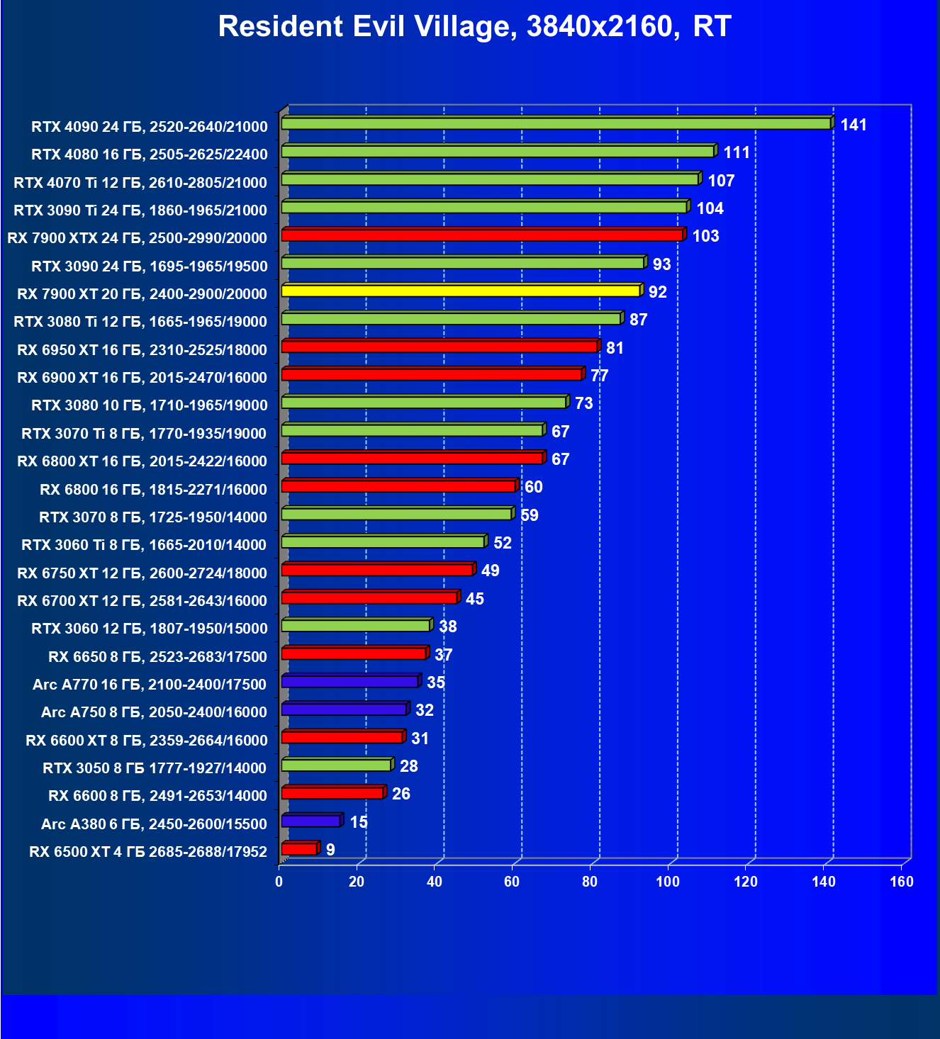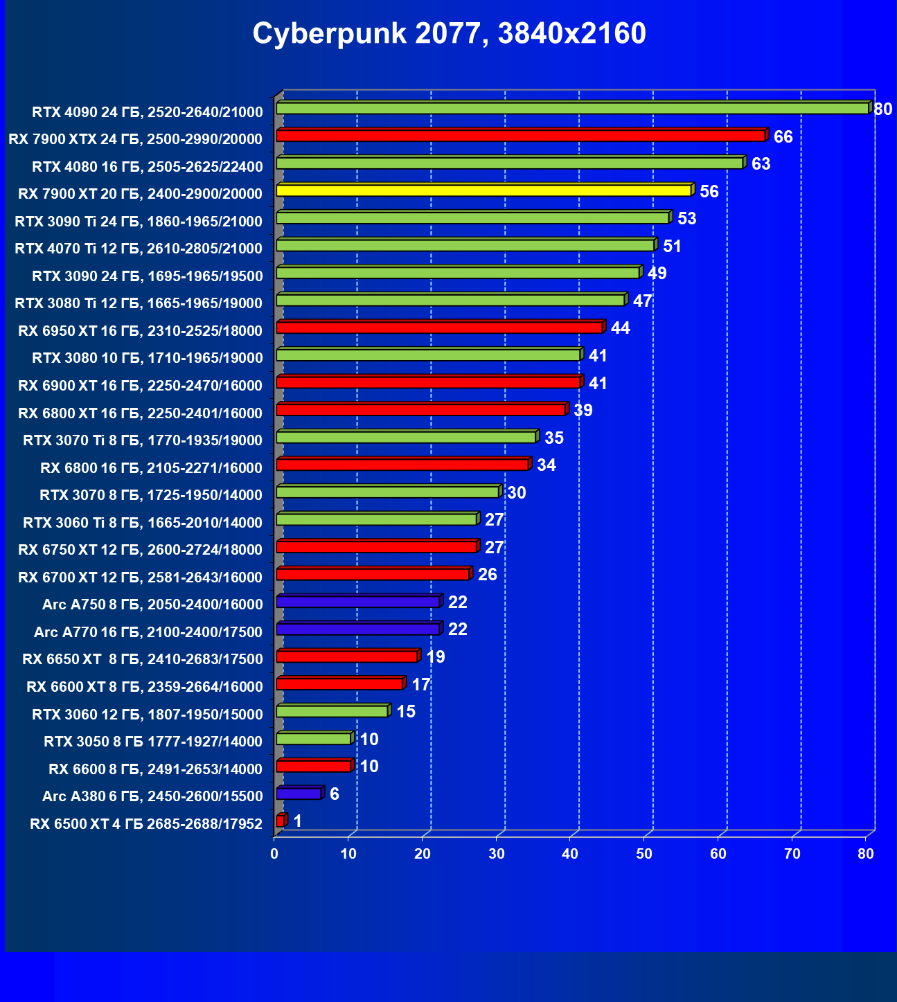 Здесь всё понятно: в разрешениях 1080p (Full HD) и 1440p (2.5K) новинка AMD выступает на уровне флагманов последних поколений и обеспечивает полный комфорт в играх с максимальными настройками графики. В 2160p (4K) Radeon RX 7900 XT близок по производительности к GeForce RTX 3090 Ti и GeForce RTX 4070 Ti.