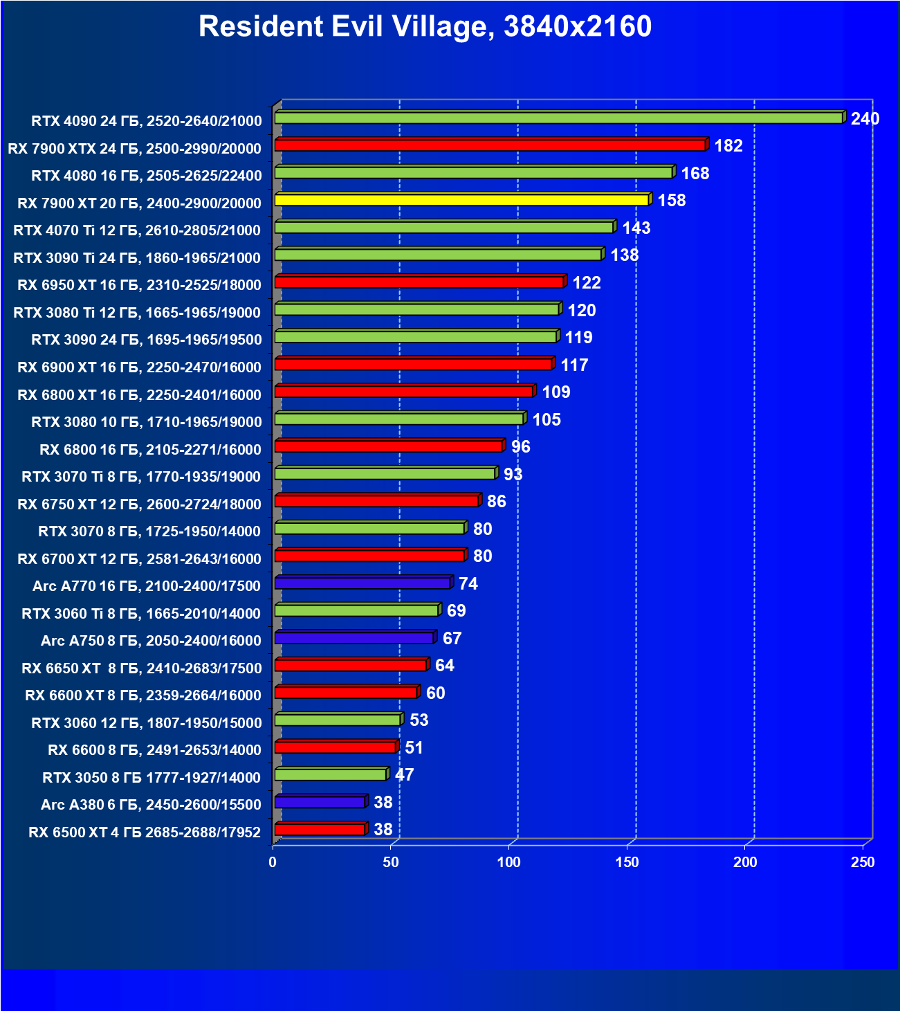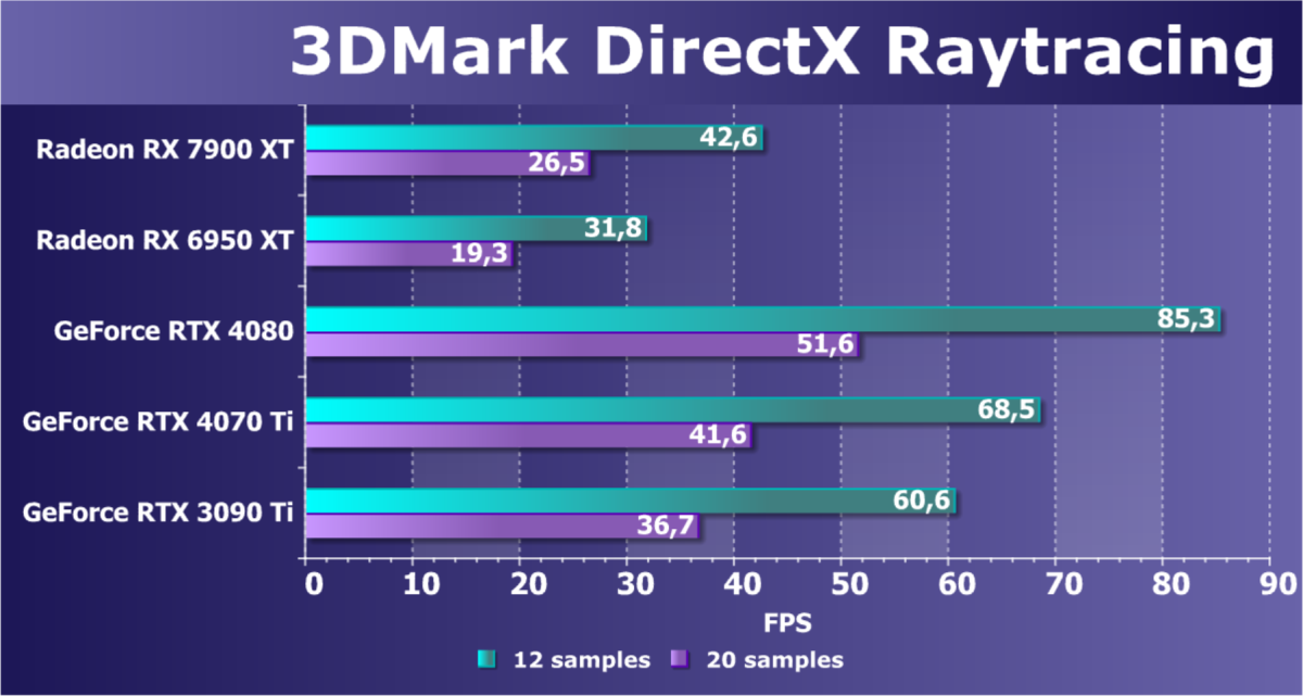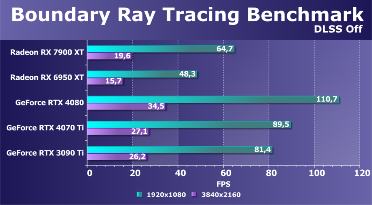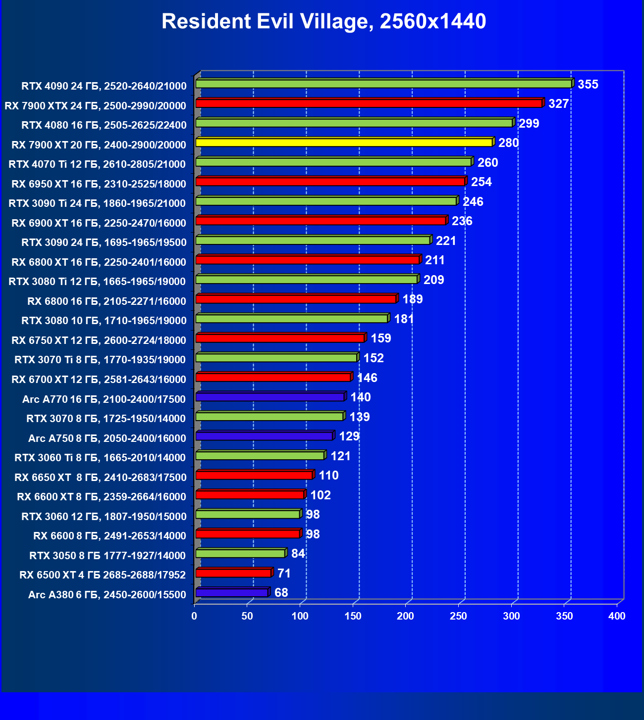 Здесь всё понятно: в разрешениях 1080p (Full HD) и 1440p (2.5K) новинка AMD выступает на уровне флагманов последних поколений и обеспечивает полный комфорт в играх с максимальными настройками графики. В 2160p (4K) Radeon RX 7900 XT близок по производительности к GeForce RTX 3090 Ti и GeForce RTX 4070 Ti.