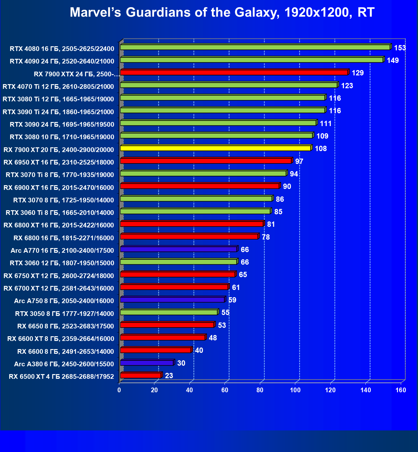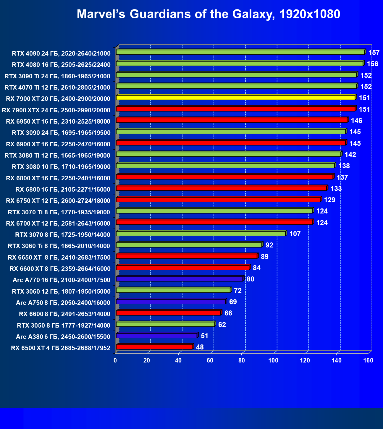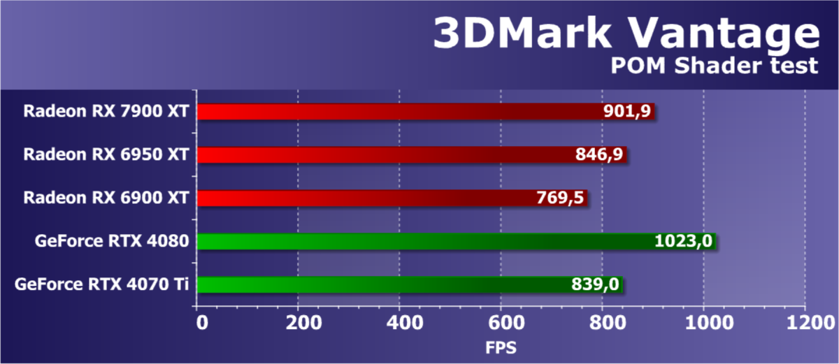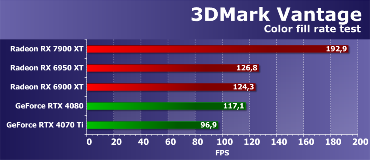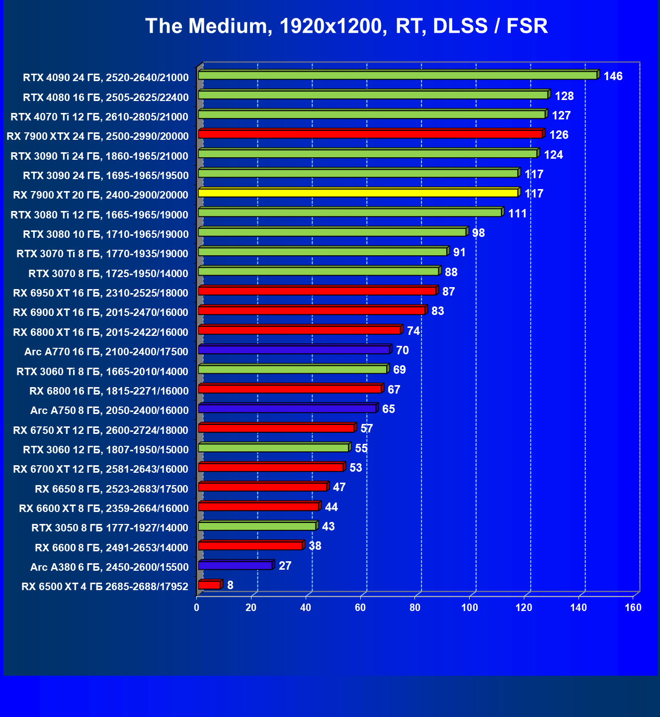 В целом по всем тестам и разрешениям Radeon RX 7900 XT опережает конкурента в лице GeForce RTX 4070 Ti на 3,5%, однако он и чуть дороже. А вот предыдущий флагман AMD — Radeon RX 6950 XT — отстал от Radeon RX 7900 XT уже почти на 10% (при этом Radeon RX 7900 XT в новом поколении — не самый топовый продукт). Еще более дорогой GeForce RTX 4080 логично оказывается выше всех в этом рейтинге.