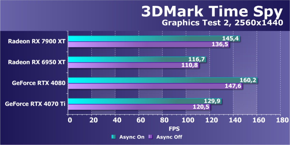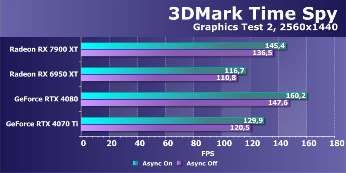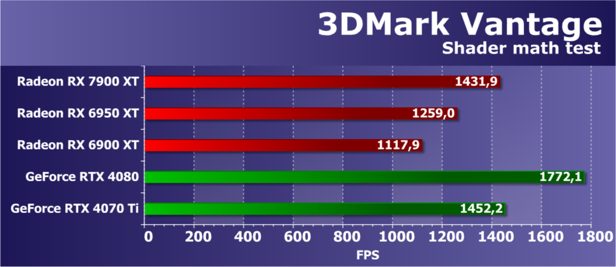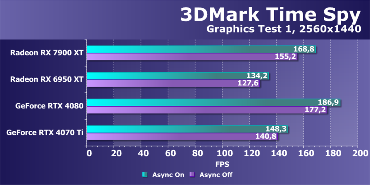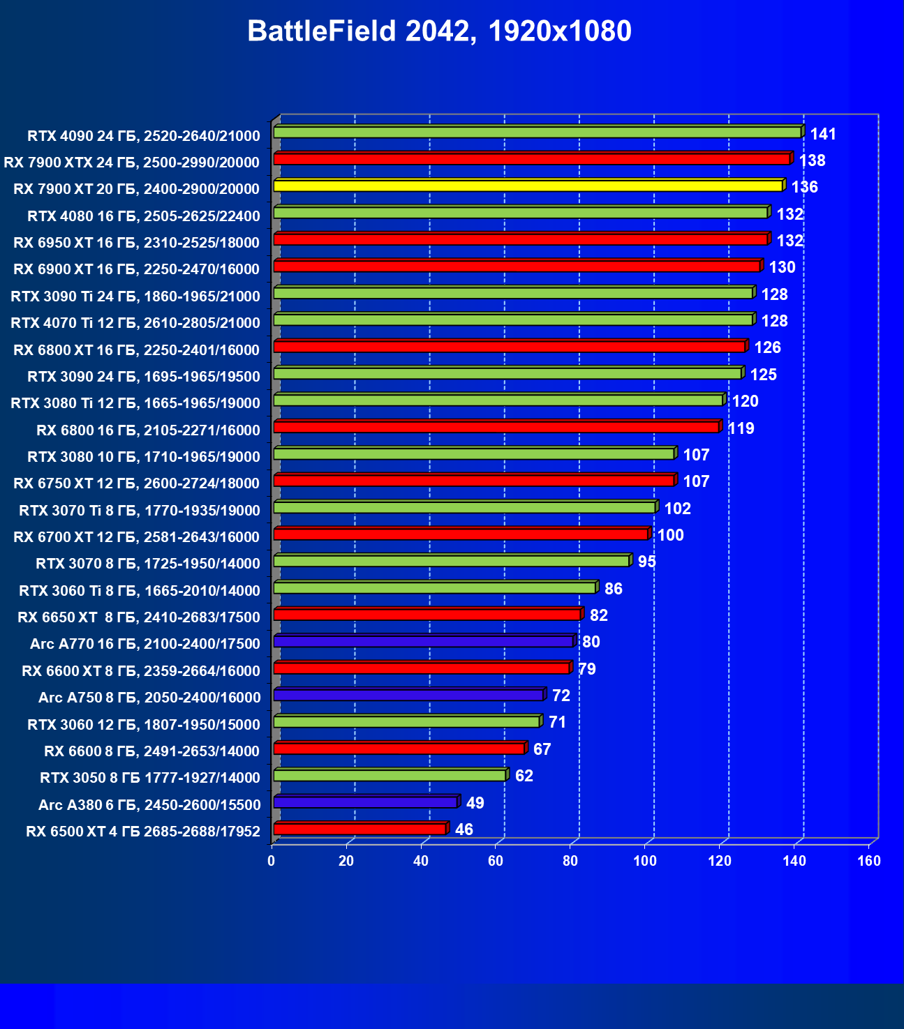 В целом по всем тестам и разрешениям Radeon RX 7900 XT опережает конкурента в лице GeForce RTX 4070 Ti на 3,5%, однако он и чуть дороже. А вот предыдущий флагман AMD — Radeon RX 6950 XT — отстал от Radeon RX 7900 XT уже почти на 10% (при этом Radeon RX 7900 XT в новом поколении — не самый топовый продукт). Еще более дорогой GeForce RTX 4080 логично оказывается выше всех в этом рейтинге.