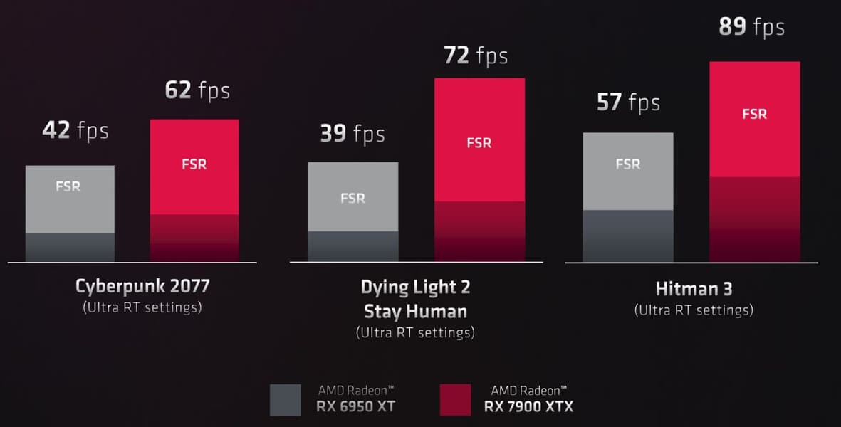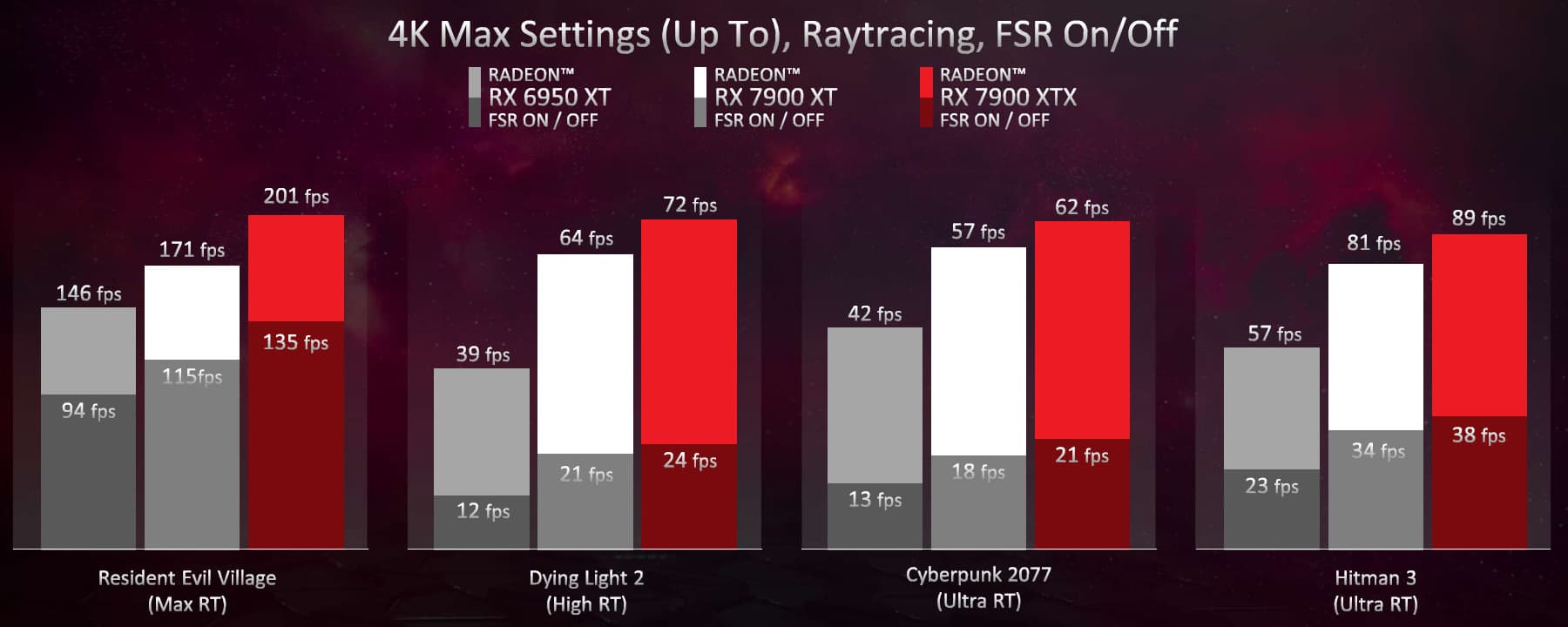 И если раньше семейству Radeon RX 6000 даже поддержка FSR не сильно помогала поднять производительность при включении RT, то у Radeon RX 7000 в этом плане всё намного лучше. Да, пока падение FPS всё же более сильное, чем у Nvidia GeForce RTX, однако Radeon RX 7900 XT даже в 4K может выдавать очень хорошие показатели производительности при использовании трассировки лучей и FSR.