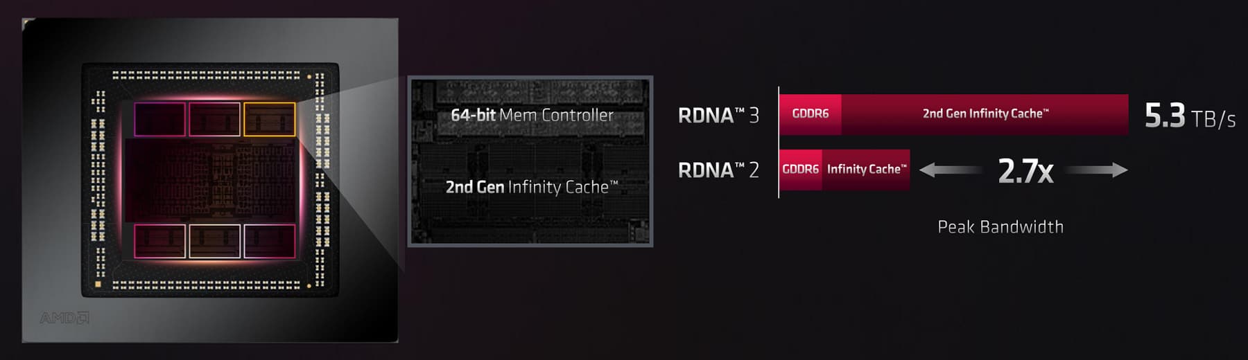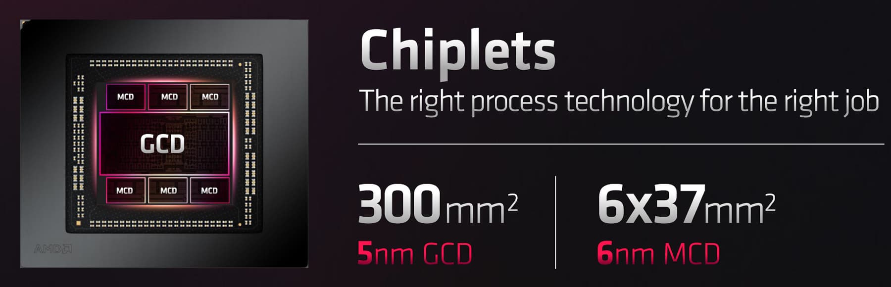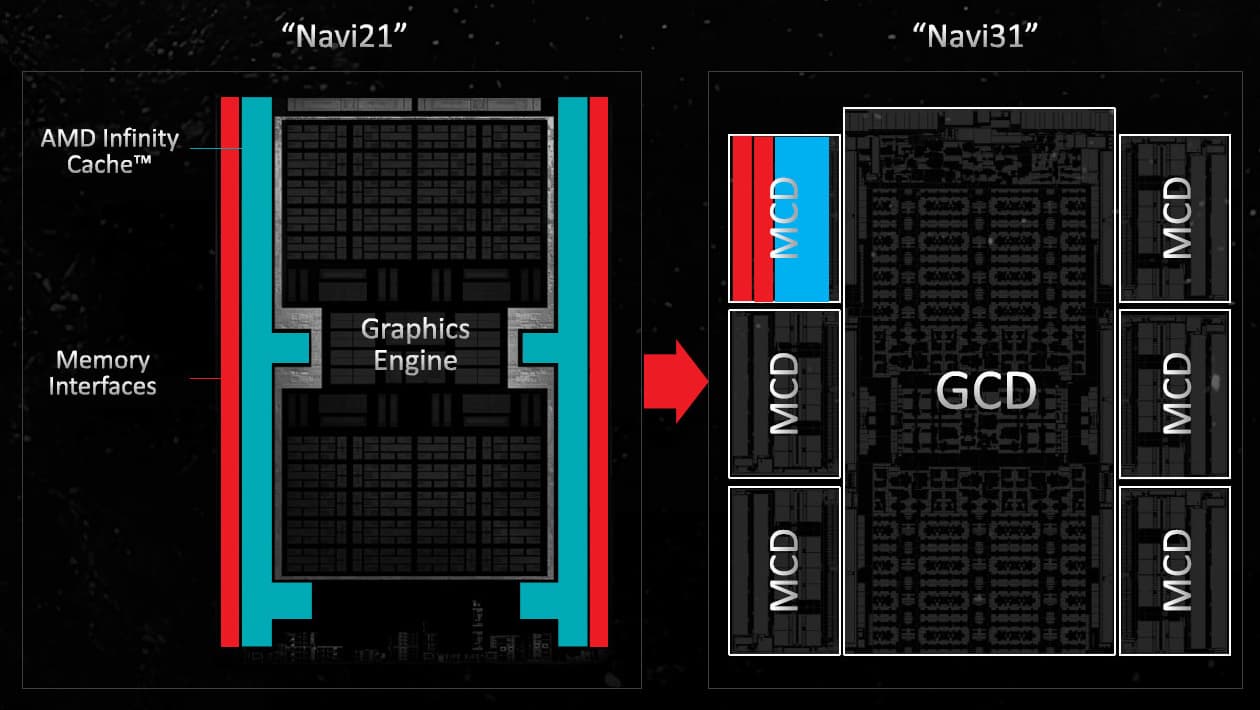 Компания AMD решила использовать чиплетную конфигурацию в Navi 31 (кодовое имя графических процессоров серии Radeon RX 7900) для того, чтобы достичь лучшей производительности при сохранении относительно невысокой сложности кристаллов (а значит, и меньшей себестоимости) — этот подход отличается от больших GPU, которые делает Nvidia. Инженеры AMD отделили некоторые участки, которые вполне можно перенести на более проверенный и менее дорогой техпроцесс, такие как кэш-память третьего уровня Infinity Cache и контроллеры GDDR6-памяти, и перенесли их с большого основного кристалла на шесть маленьких — memory cache die (MCD), что можно увидеть на схематическом изображении GPU.