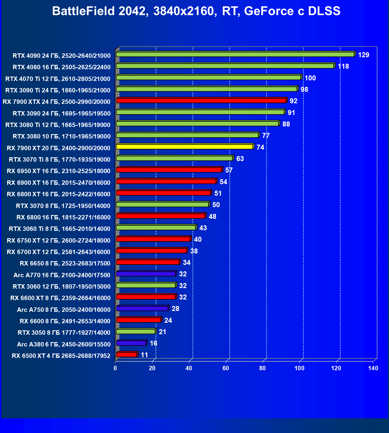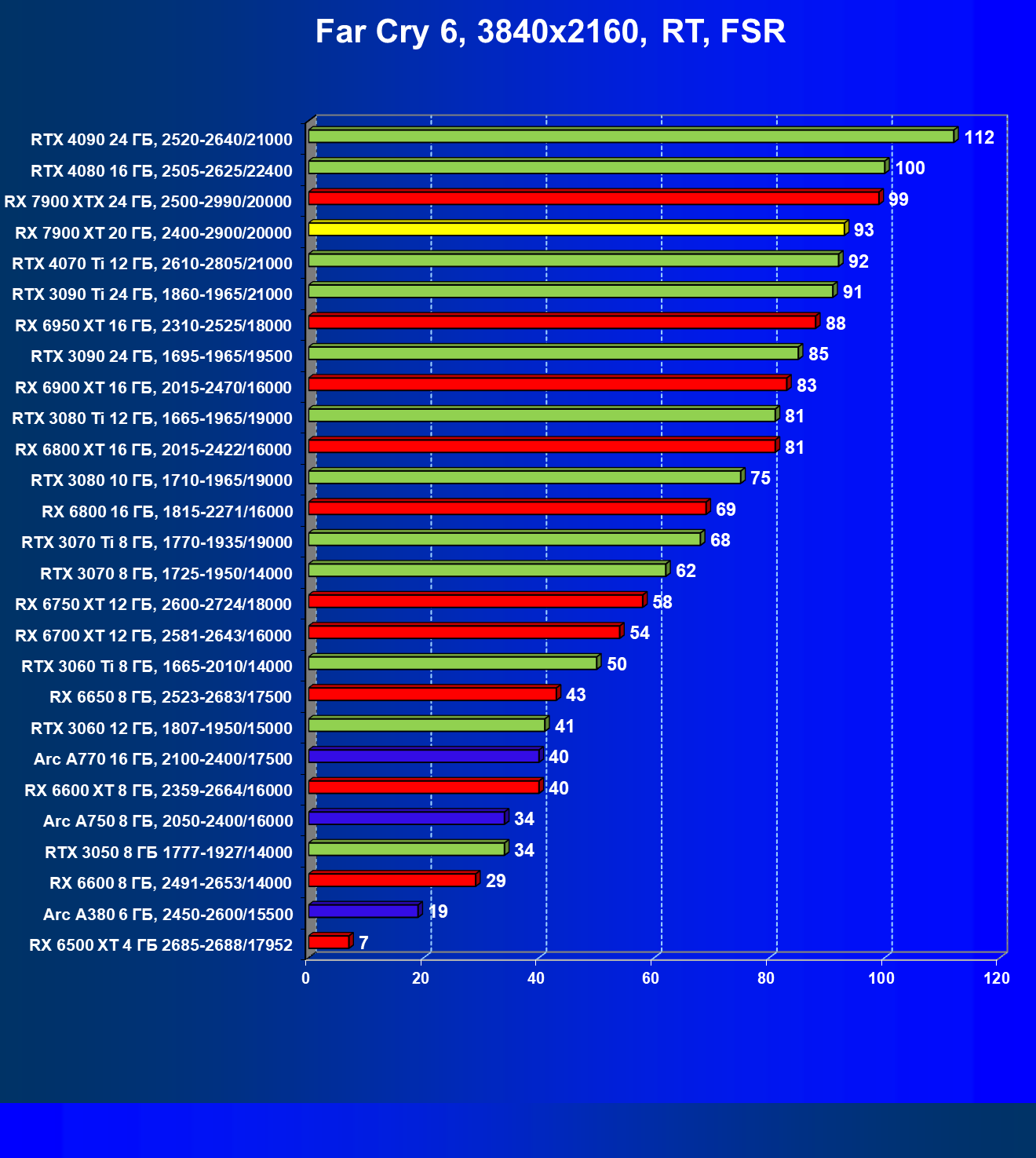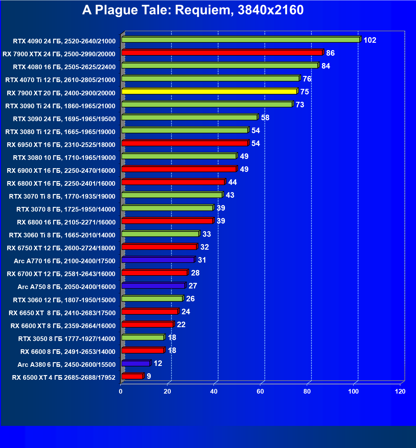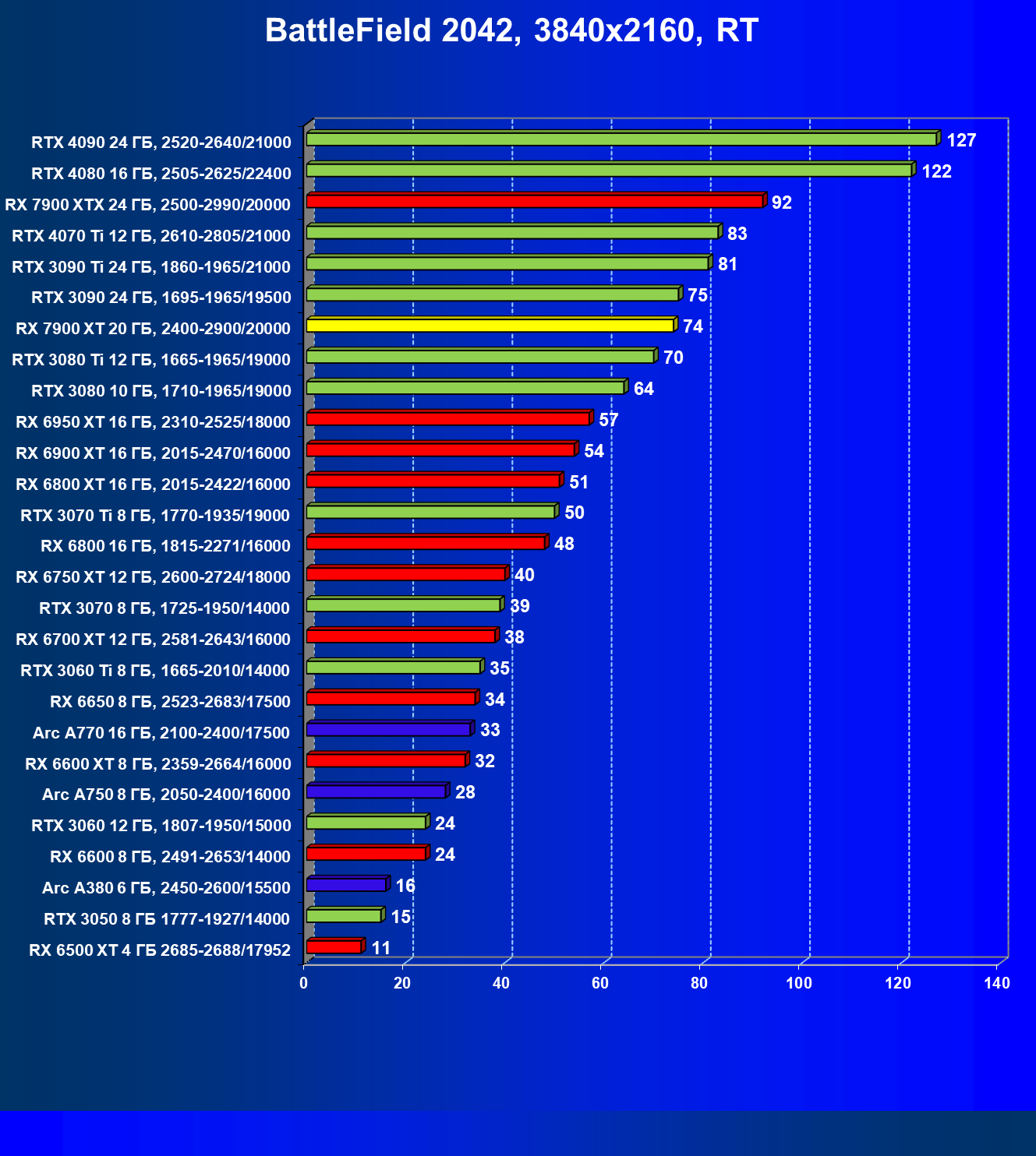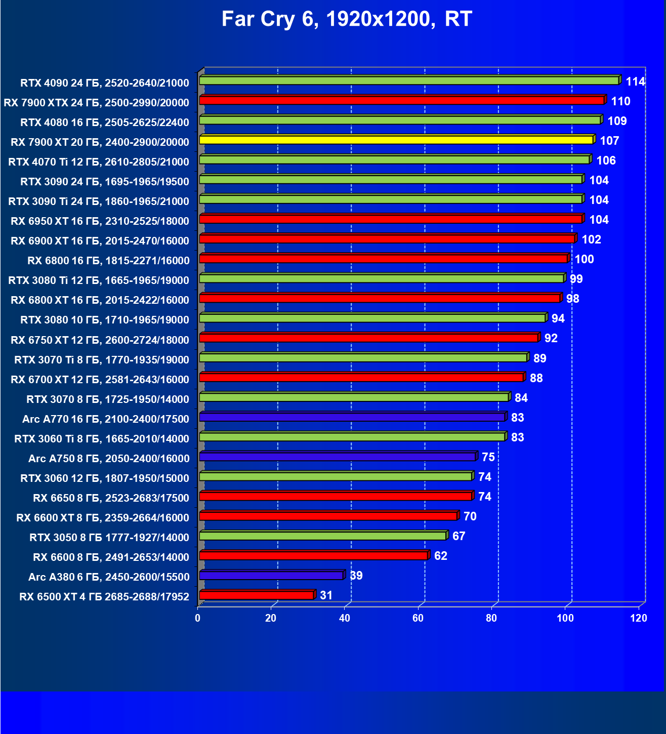| 17 | RX 7900 XT 20 ГБ, 2400—2900/20000 | 124 | 1112 | 90 000 |