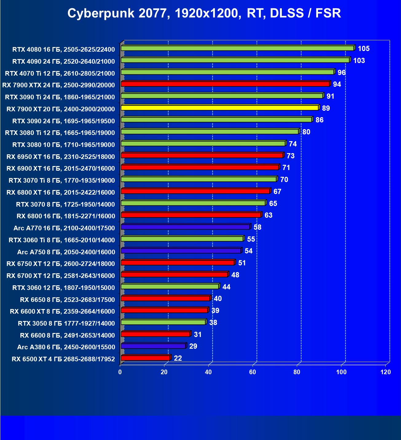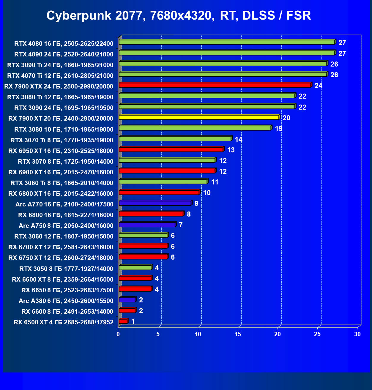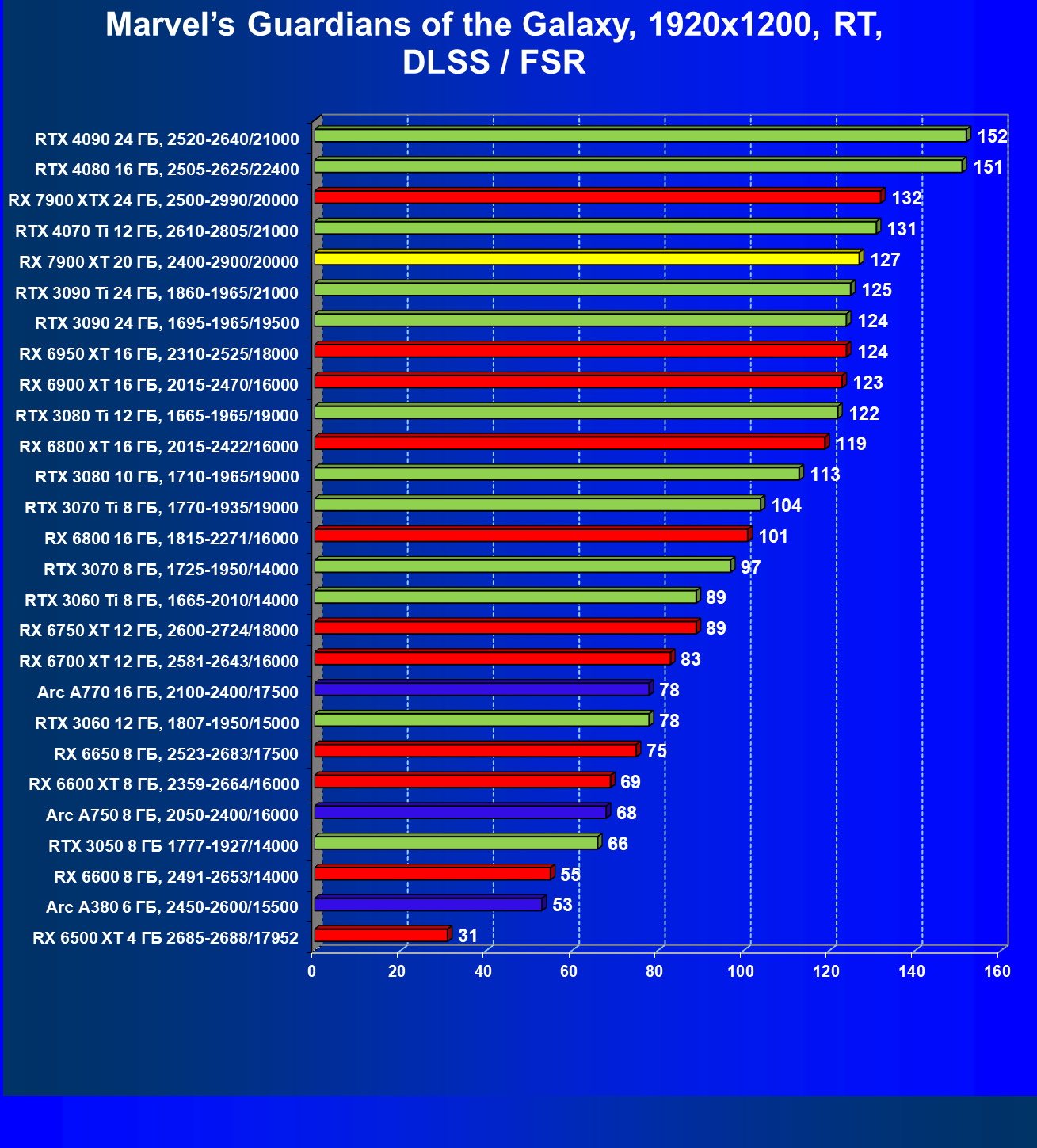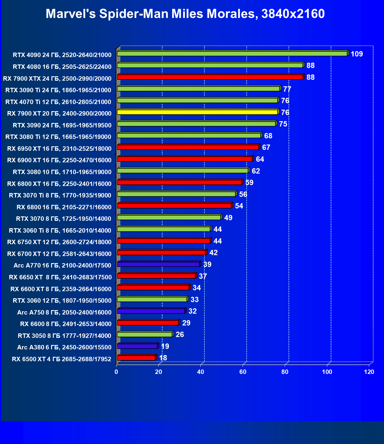 | 17 | RX 7900 XT 20 ГБ, 2400—2900/20000 | 124 | 1112 | 90 000 |