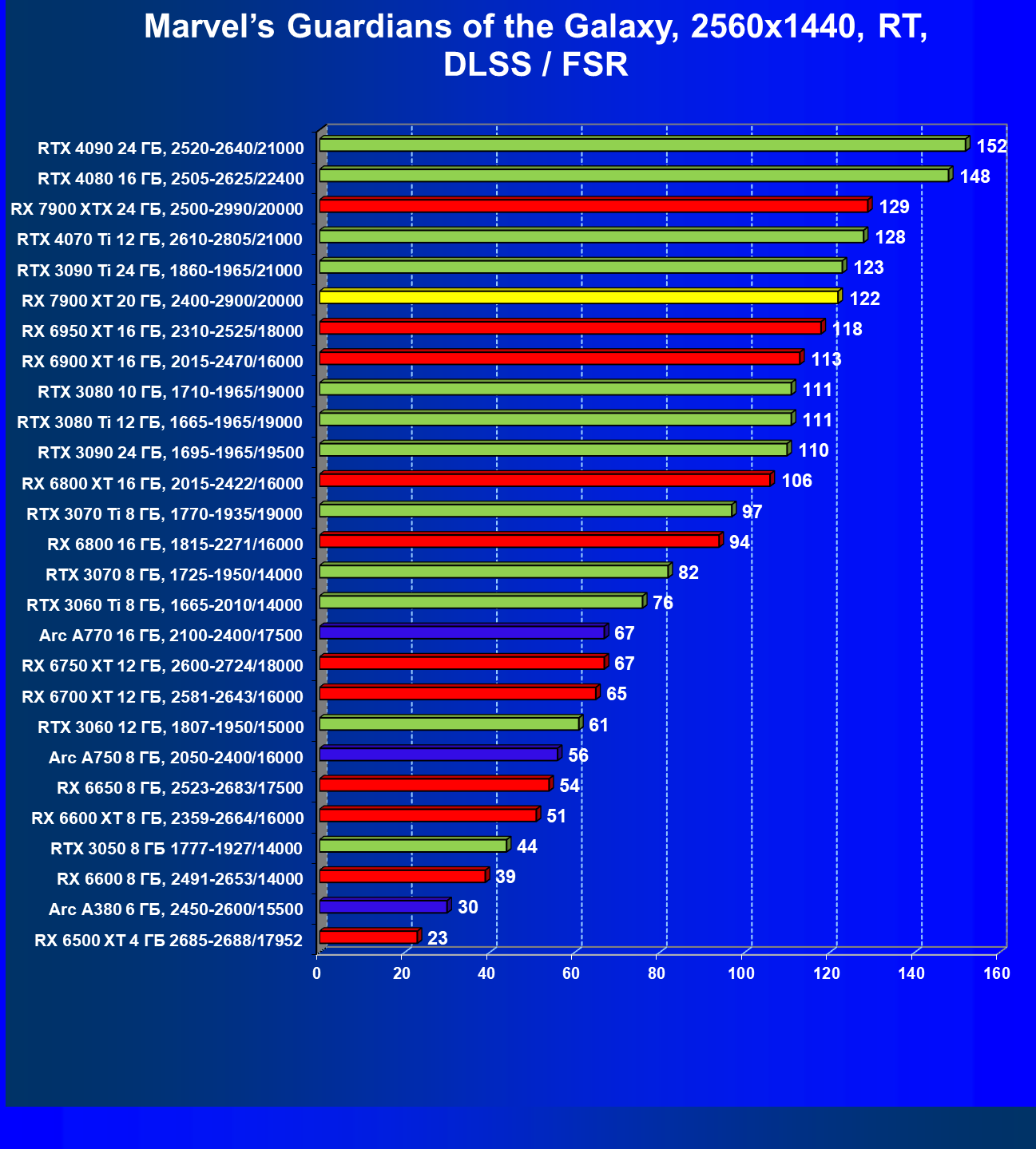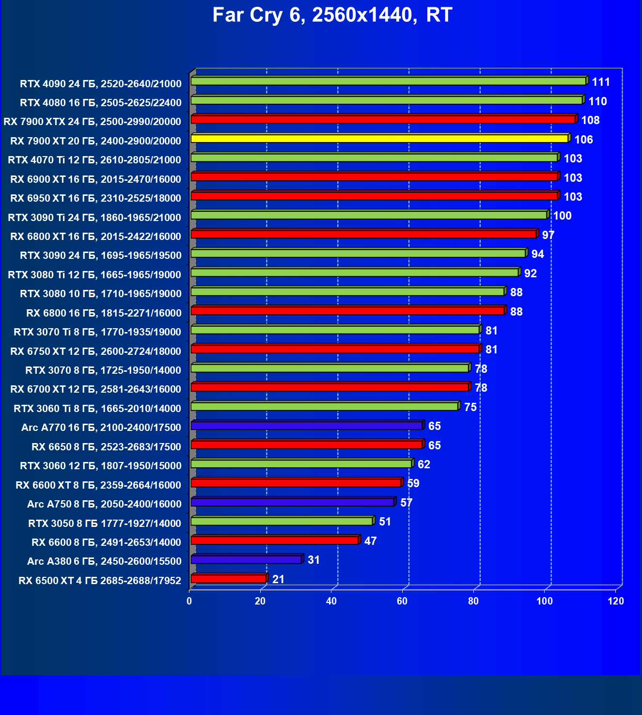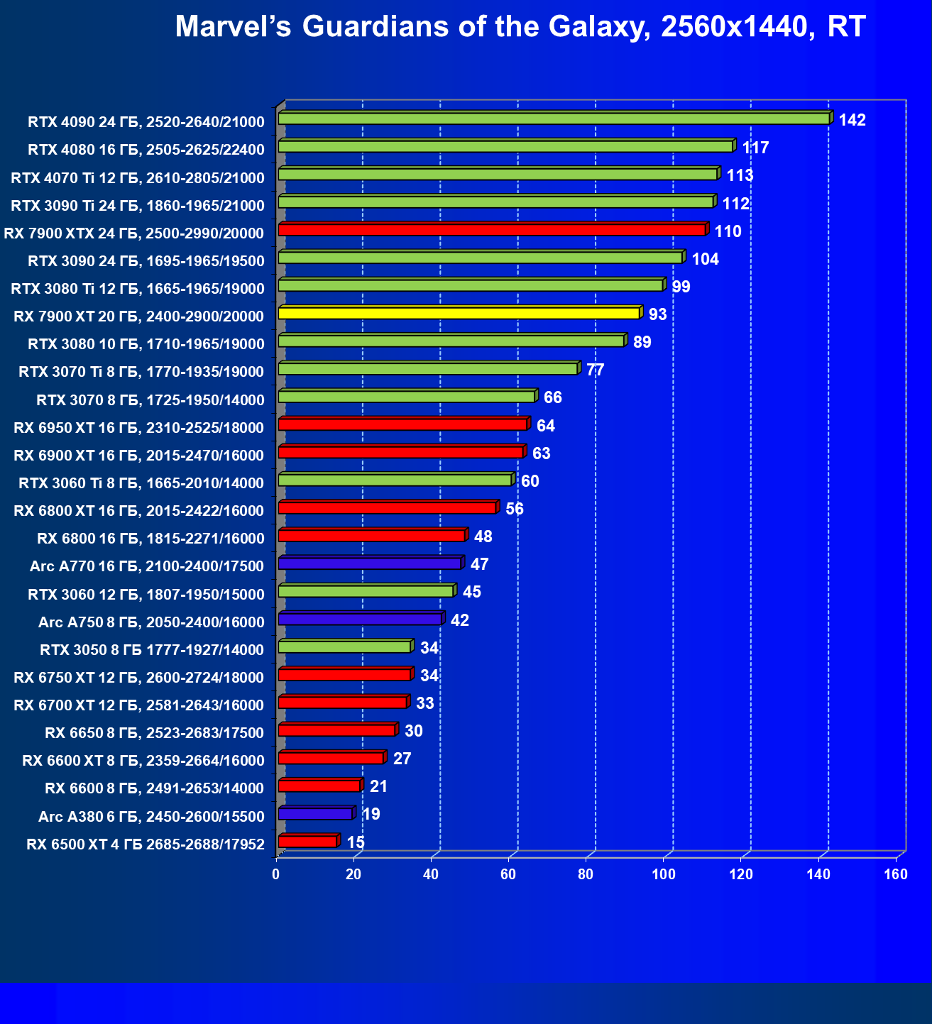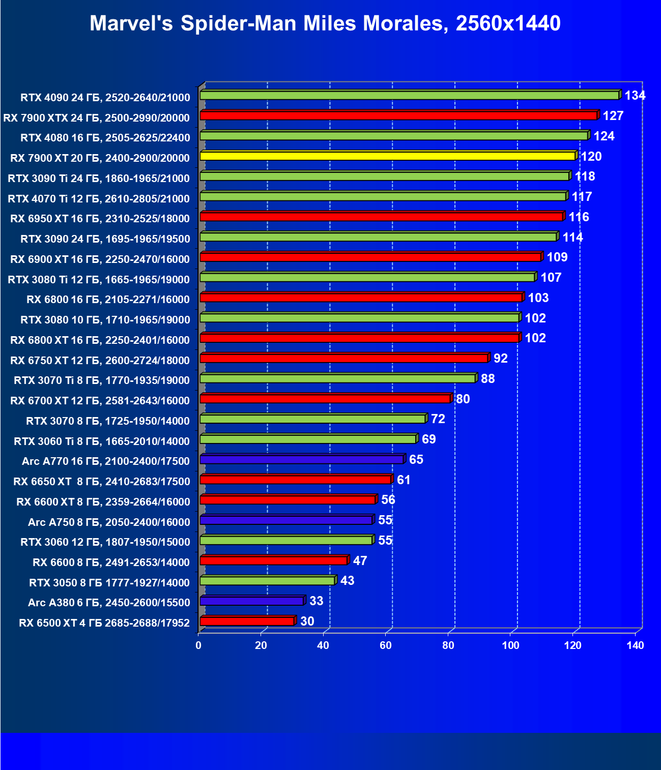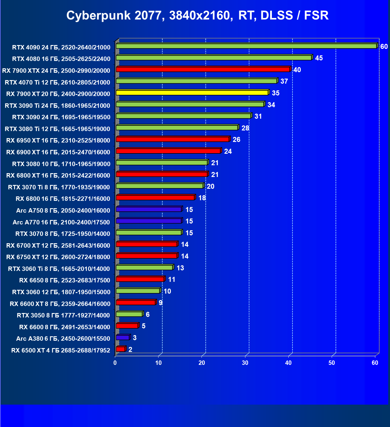 | 17 | RX 7900 XT 20 ГБ, 2400—2900/20000 | 124 | 1112 | 90 000 |