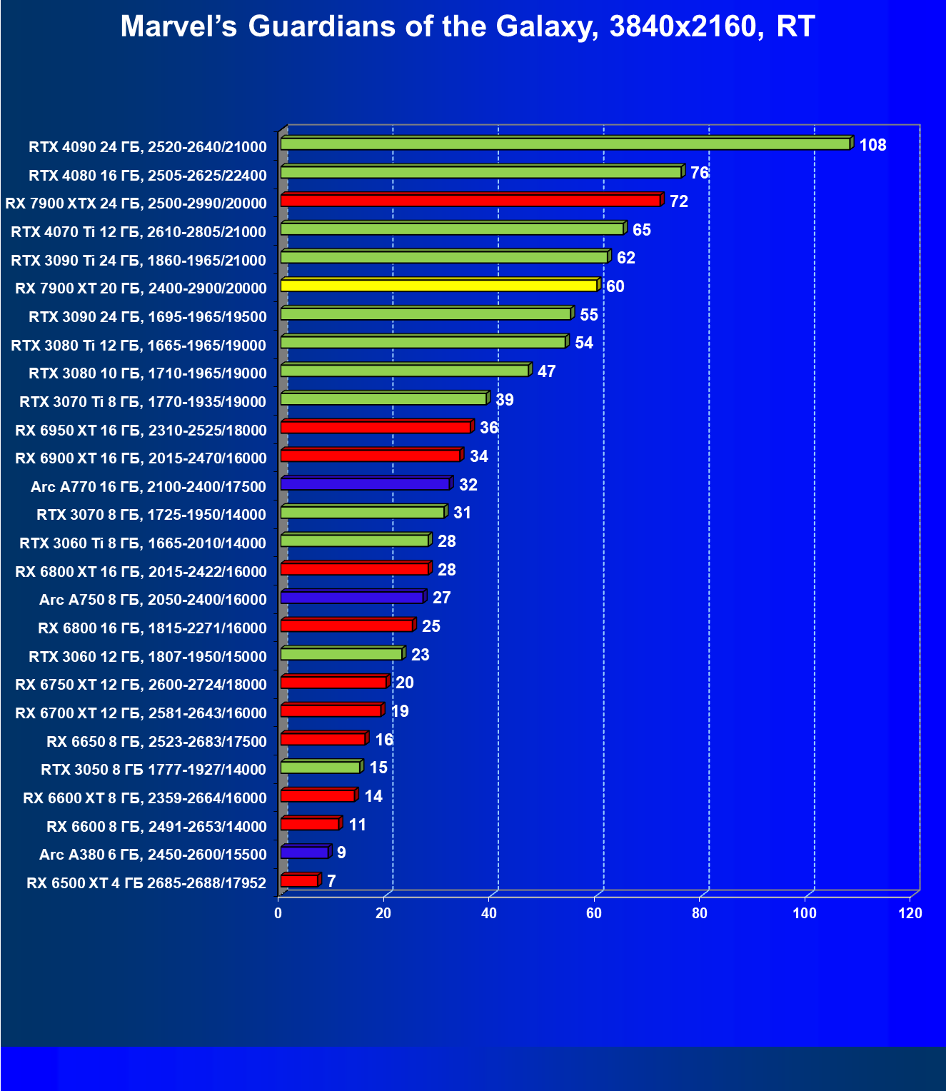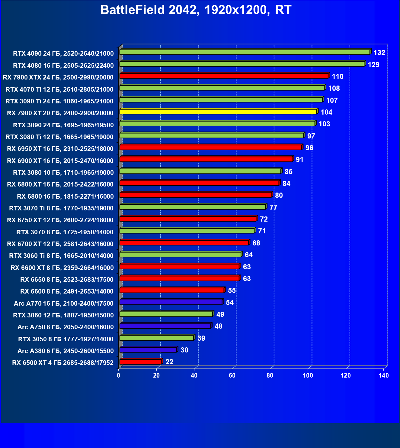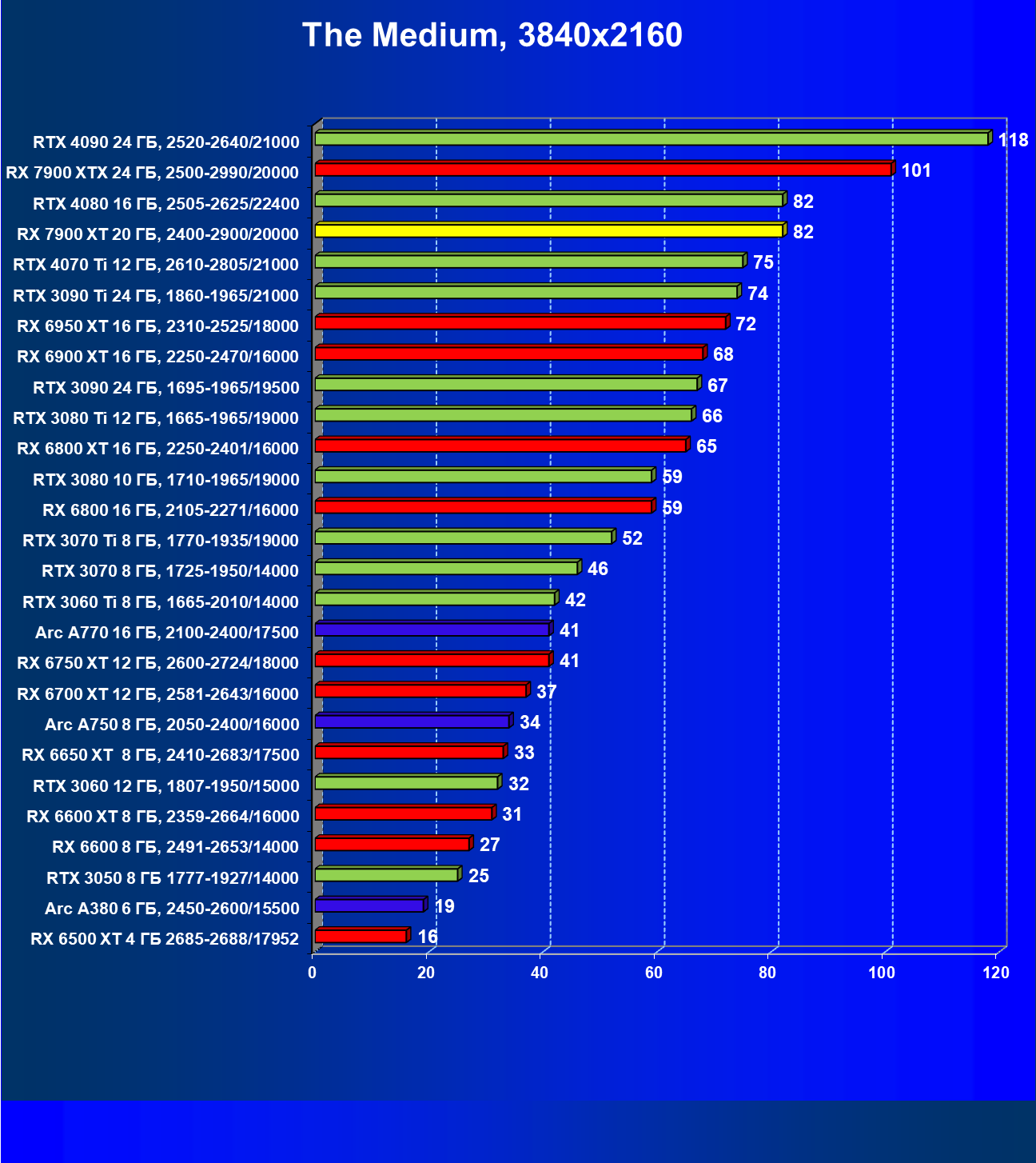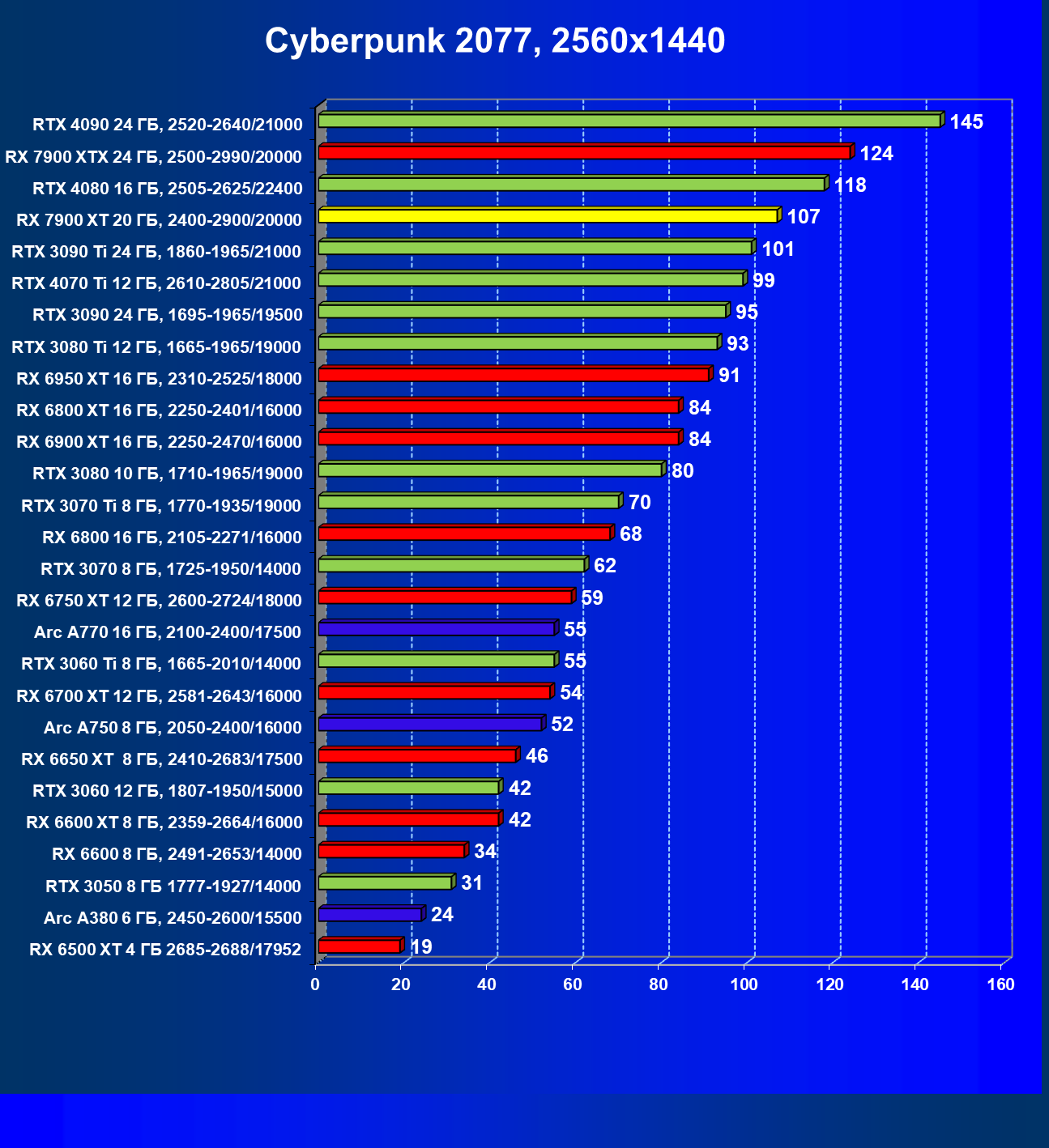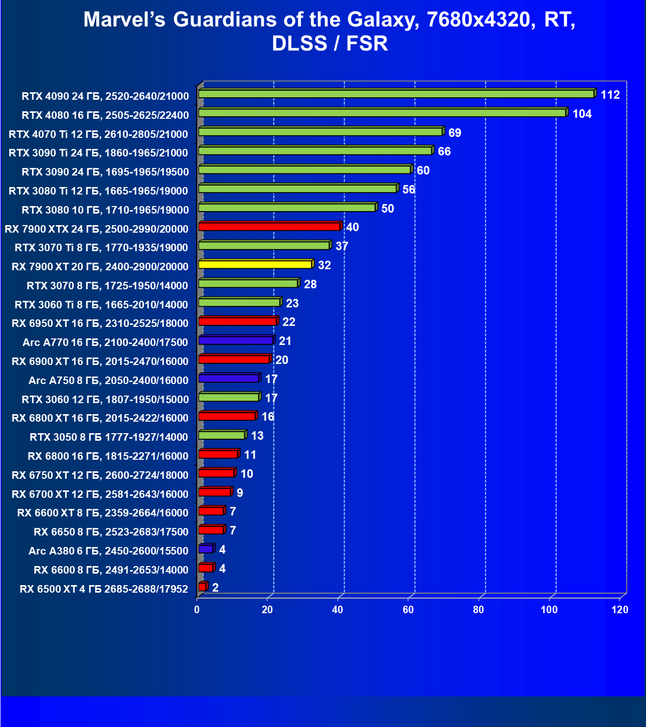 | 17 | RX 7900 XT 20 ГБ, 2400—2900/20000 | 124 | 1112 | 90 000 |