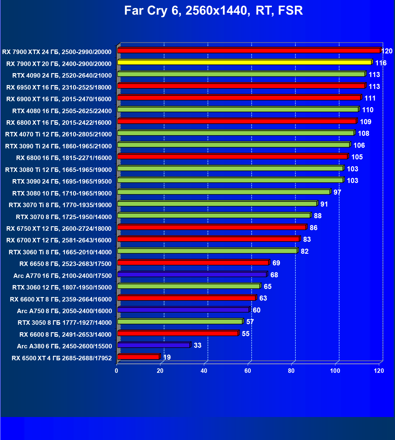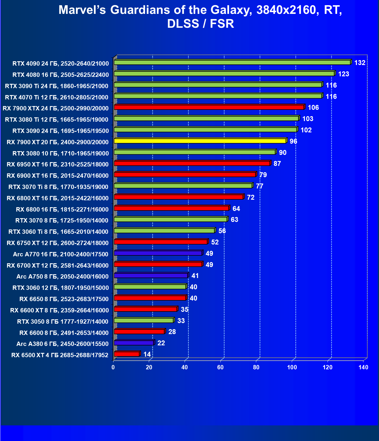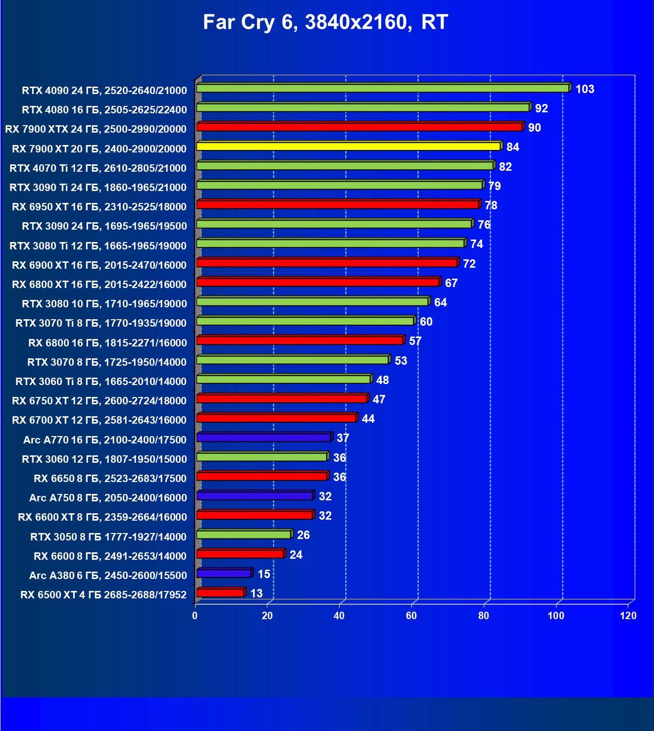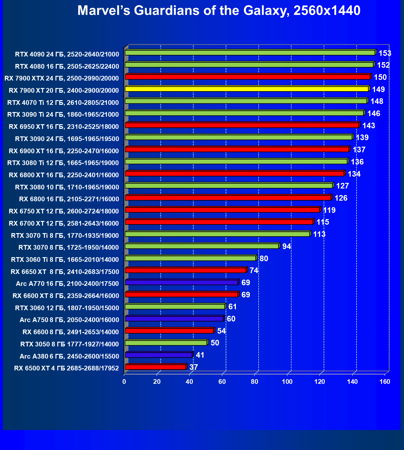 | 17 | RX 7900 XT 20 ГБ, 2400—2900/20000 | 124 | 1112 | 90 000 |