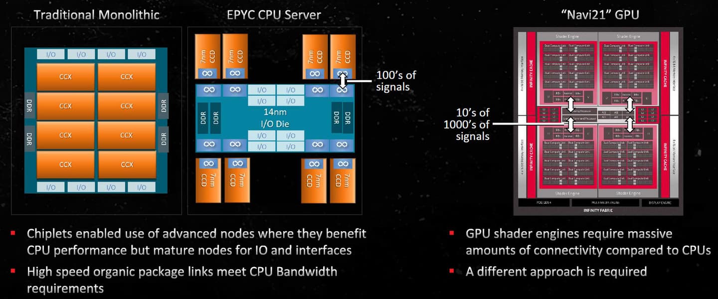 Типичные вычислительные алгоритмы, работающие на ядрах CPU, в основном помещаются в кэш-память разных уровней, а каналов к внешней памяти у настольных Zen всего два 64-битных, и в этом заключается важное отличие CPU от GPU. CCD-чиплеты Ryzen имеют небольшую площадь, порядка 70 мм² для Ryzen 7000, а IOD может иметь площадь лишь 122 мм² — также в серии Ryzen 7000. Графические процессоры совершенно иные, им нужна очень большая пропускная способность памяти для того, чтобы обеспечить работой все вычислительные ядра GPU — до 1 ТБ/с и больше. Да и требования к скорости связей внутри основной части GPU выше, высокие межкристальные задержки при разделении на много мелких кристаллов не подходят. Поэтому решение из Ryzen тут не сработало бы, а оптимально чуть ли не противоположное — размещение контроллеров памяти и кэш-памяти на нескольких небольших кристаллах, тогда как основные вычислительные блоки расположены в едином центральном чиплете GCD.