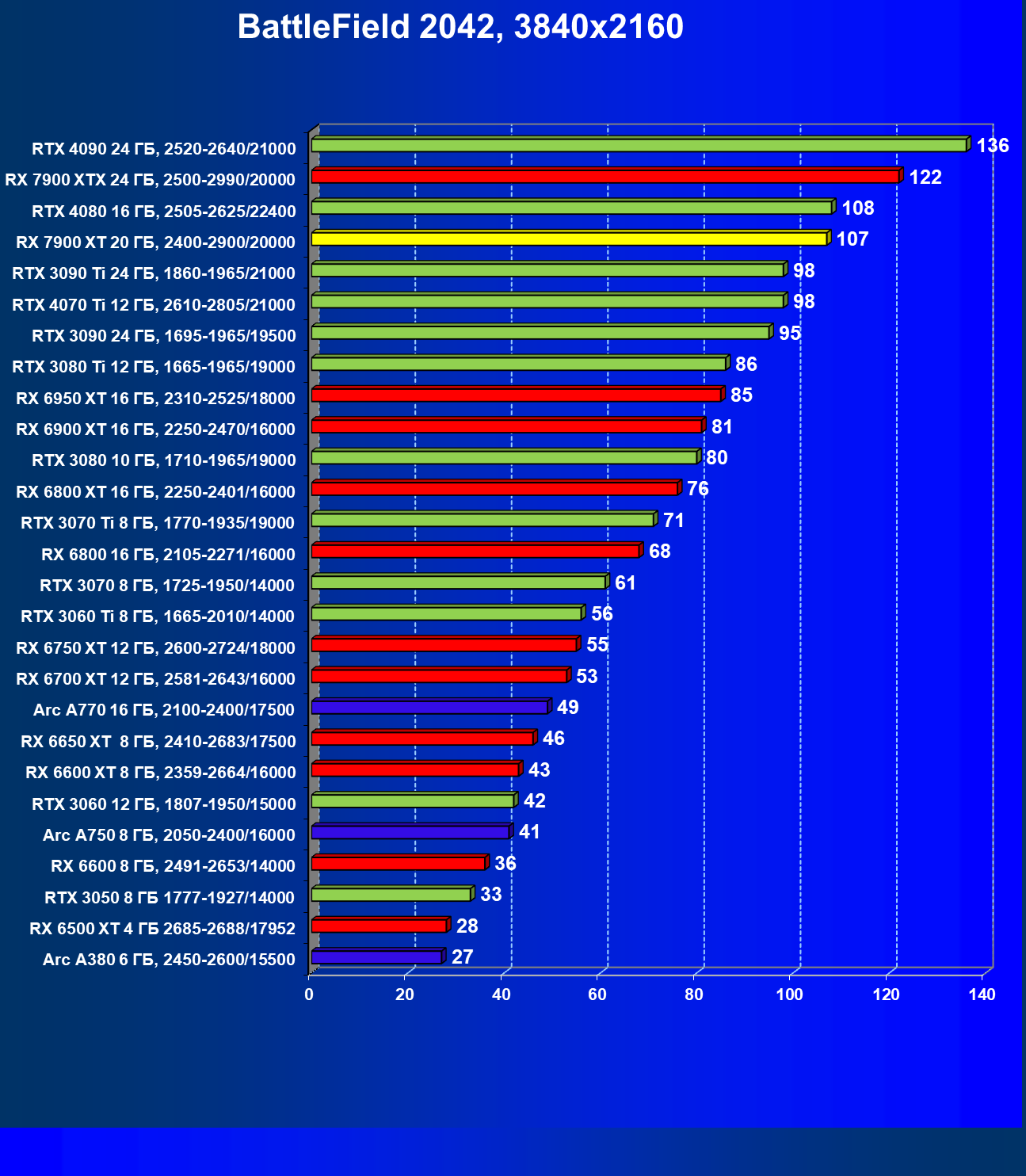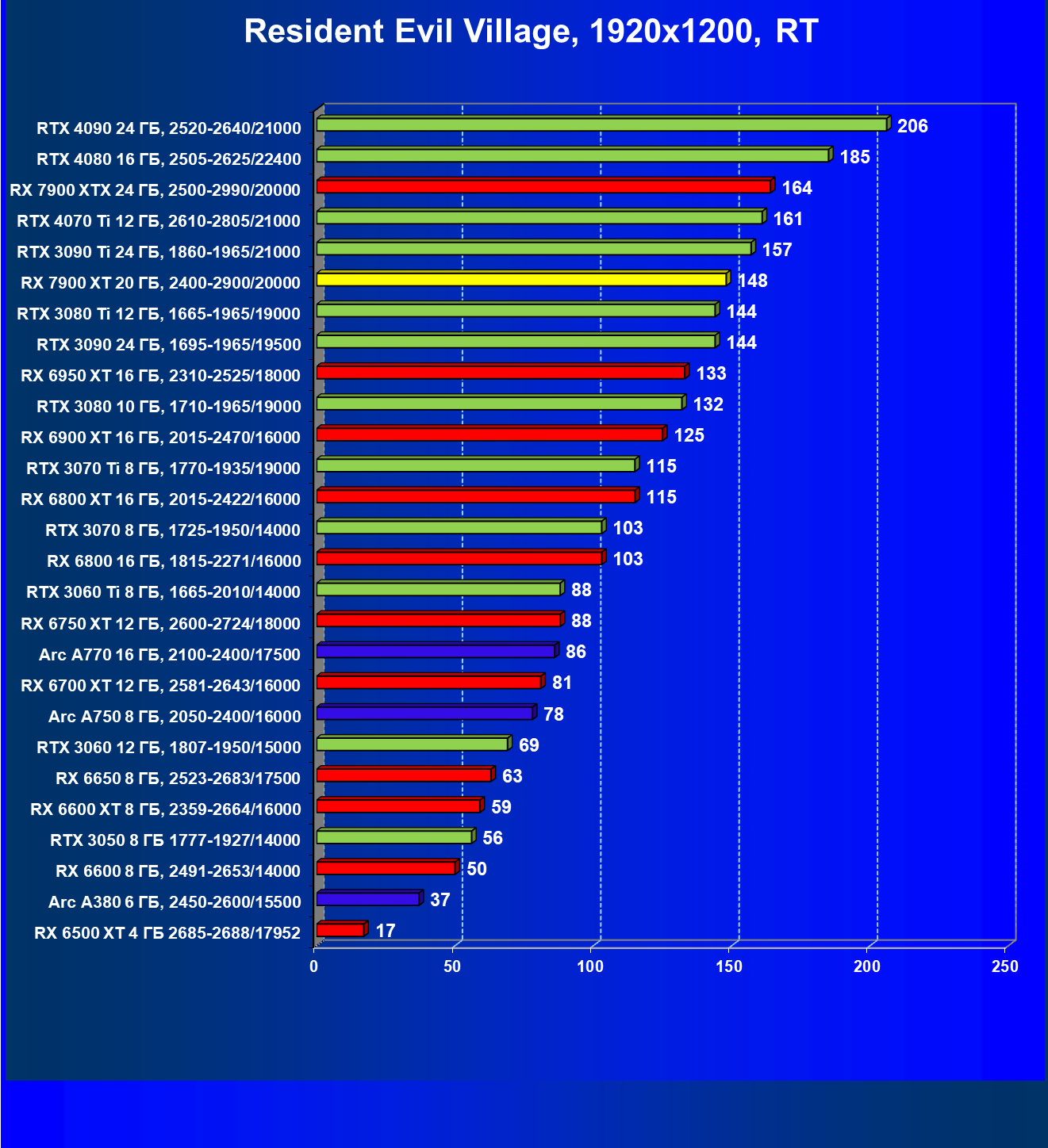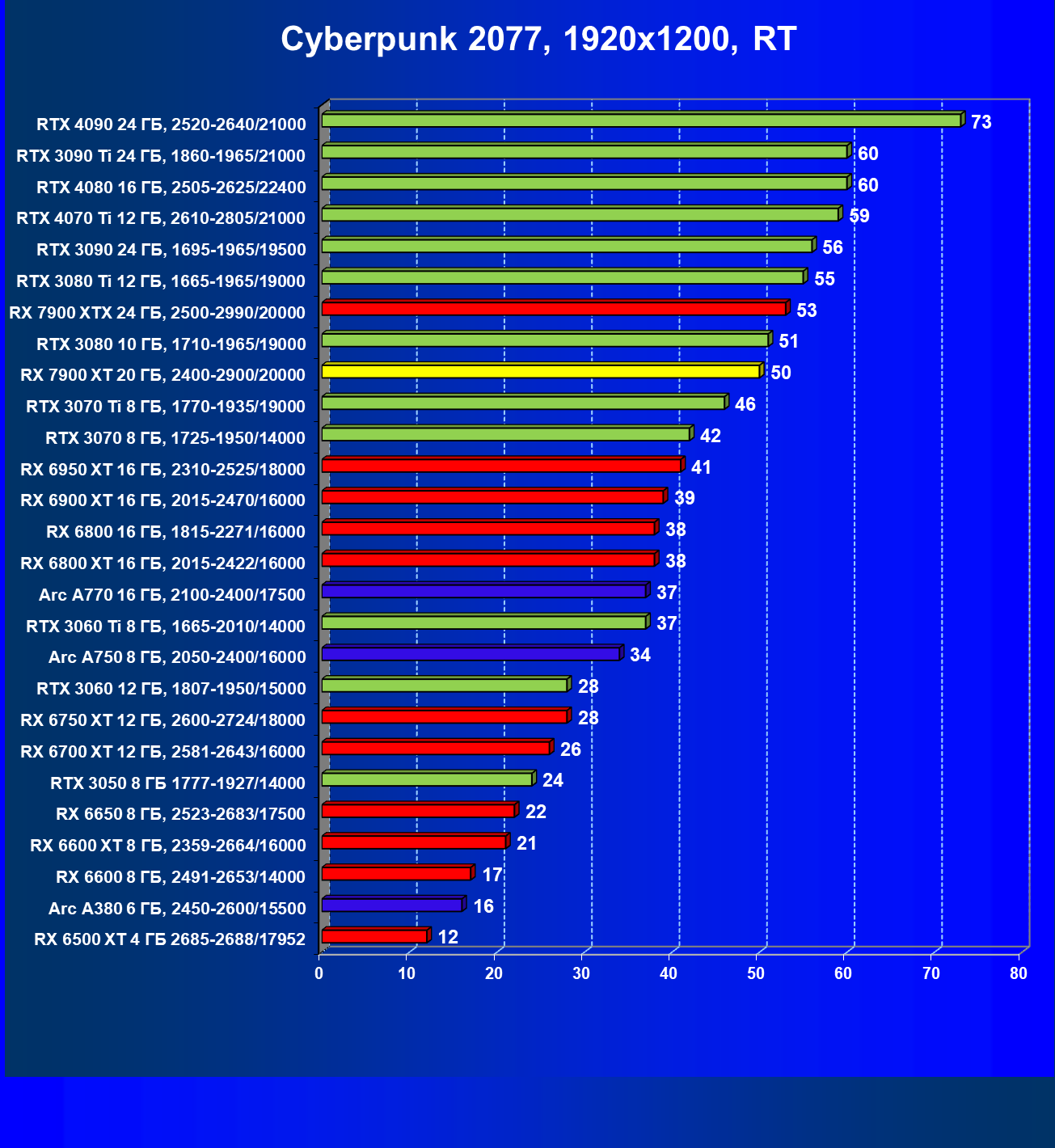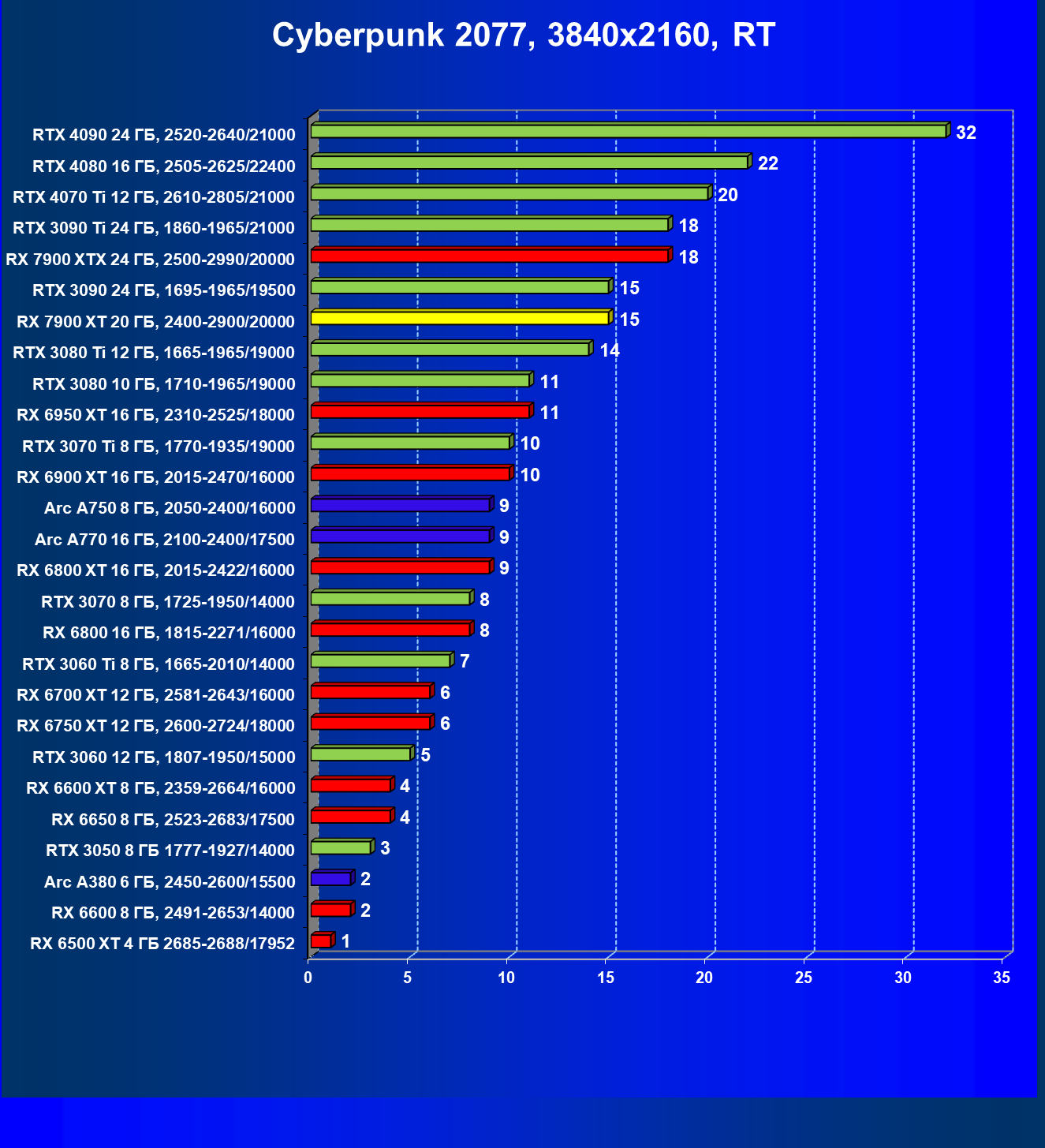 Radeon RX 7900 XT стал отличным конкурентом для GeForce RTX 4070 Ti, в играх с растеризацией обходя соперника, а в играх с RT немного отставая от него. В целом можно сказать, что они примерно равны. Пока цены новинок AMD на нашем рынке высоковаты из-за запоздалого появления этих карт, но рано или поздно они должны придти в норму, и тогда Radeon RX 7900 XT должен оказаться примерно равен GeForce RTX 4070 Ti и по цене. При этом Radeon RX 7900 XT обладает 20 ГБ памяти против 12 ГБ у соперника, хотя это скорее неустранимая особенность логической организации чипа, чем осмысленное решение. Ведь даже в разрешении 4K двенадцати гигабайт локальной памяти хватит всем играм на 2-3 года вперед, так что больший объем памяти у продукта AMD не становится реальным конкурентным преимуществом.