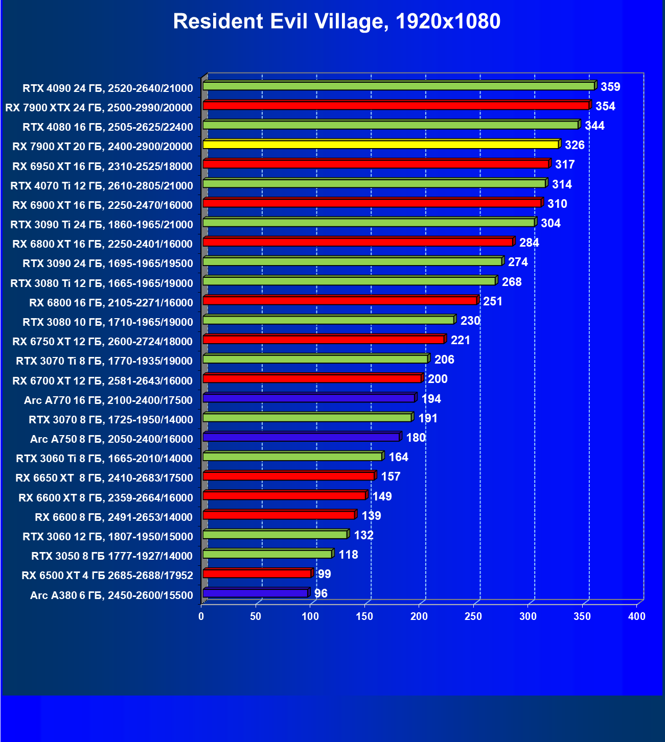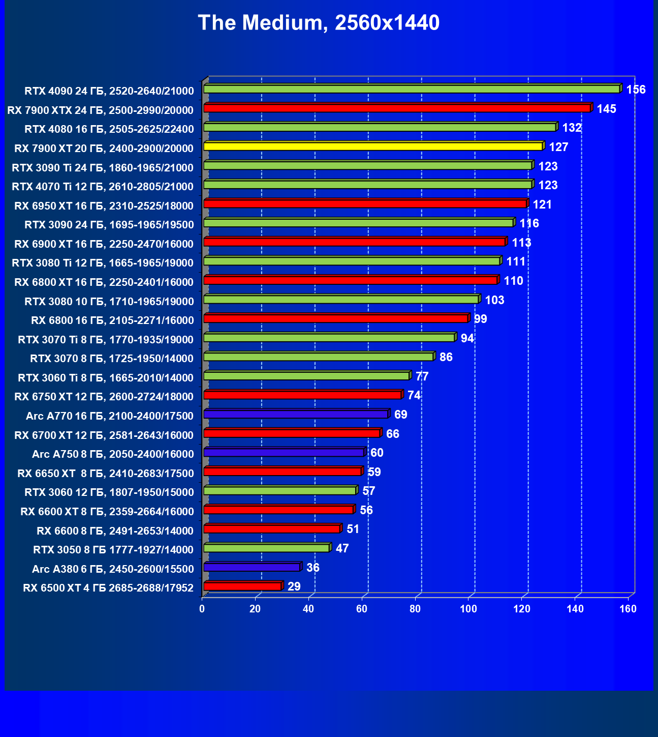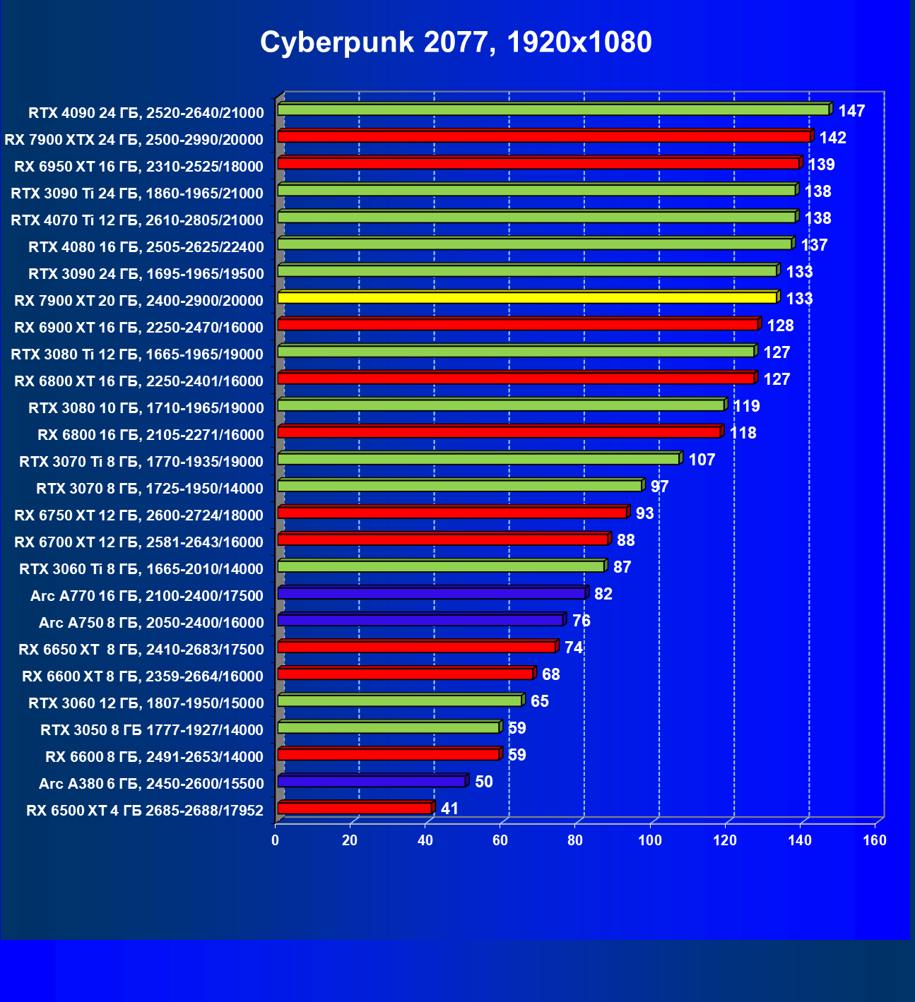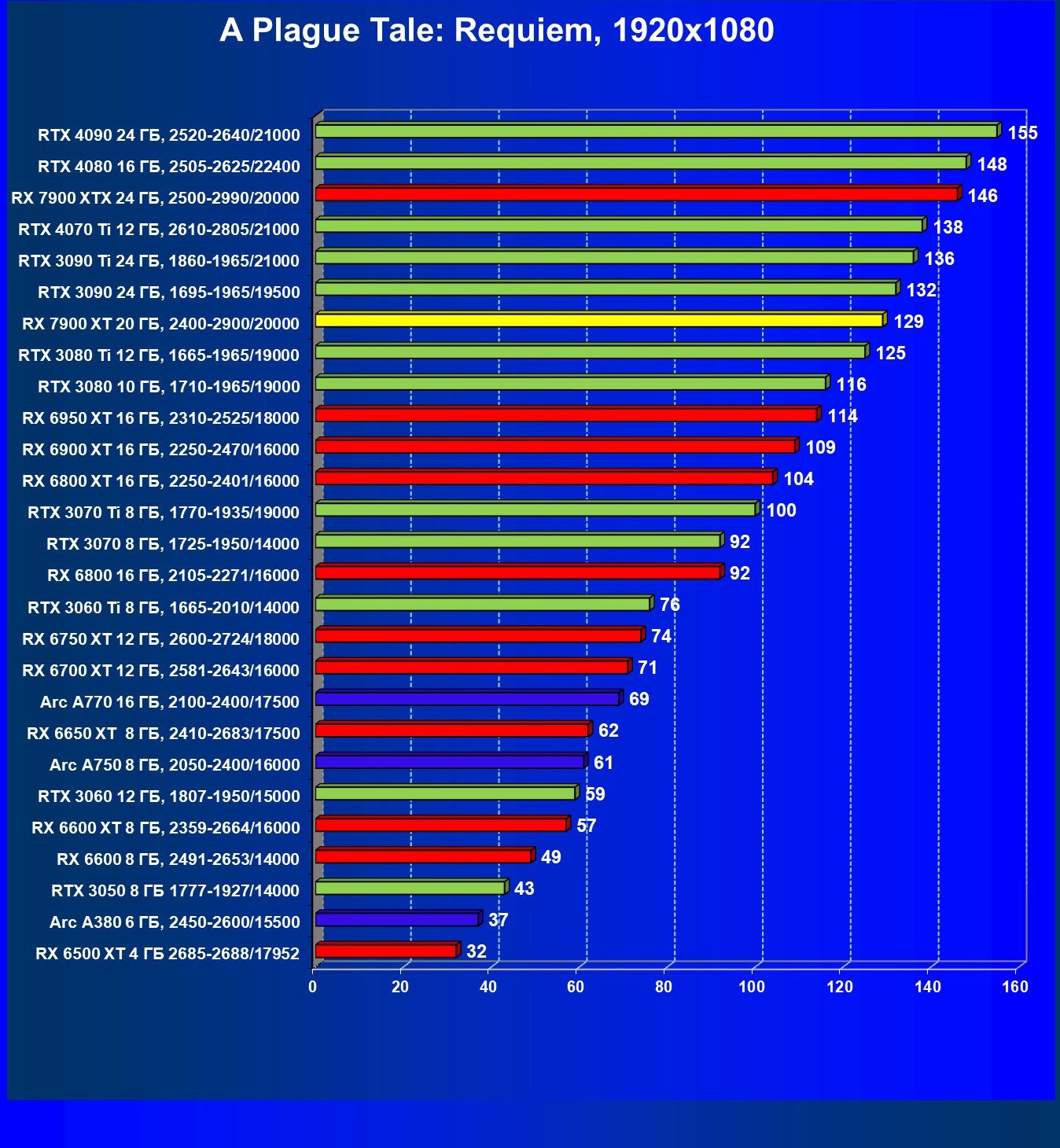 Radeon RX 7900 XT стал отличным конкурентом для GeForce RTX 4070 Ti, в играх с растеризацией обходя соперника, а в играх с RT немного отставая от него. В целом можно сказать, что они примерно равны. Пока цены новинок AMD на нашем рынке высоковаты из-за запоздалого появления этих карт, но рано или поздно они должны придти в норму, и тогда Radeon RX 7900 XT должен оказаться примерно равен GeForce RTX 4070 Ti и по цене. При этом Radeon RX 7900 XT обладает 20 ГБ памяти против 12 ГБ у соперника, хотя это скорее неустранимая особенность логической организации чипа, чем осмысленное решение. Ведь даже в разрешении 4K двенадцати гигабайт локальной памяти хватит всем играм на 2-3 года вперед, так что больший объем памяти у продукта AMD не становится реальным конкурентным преимуществом.