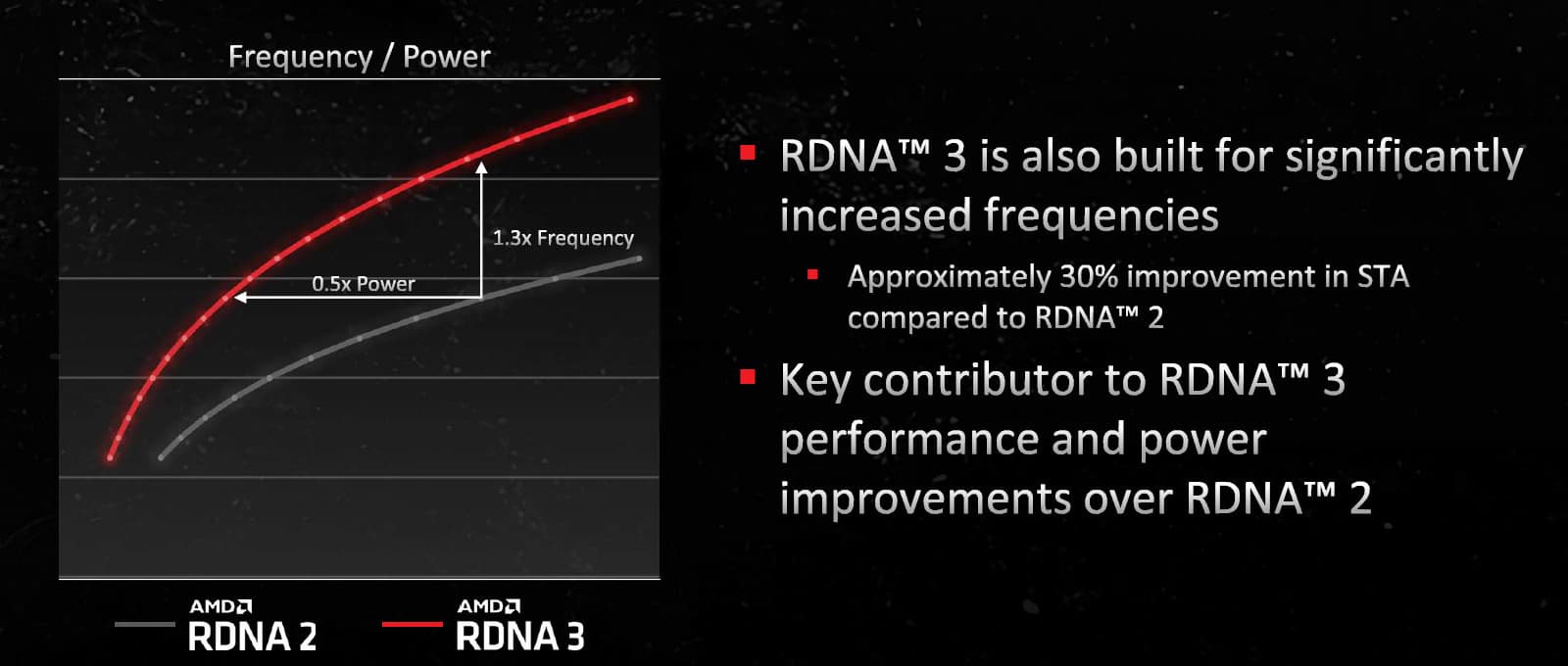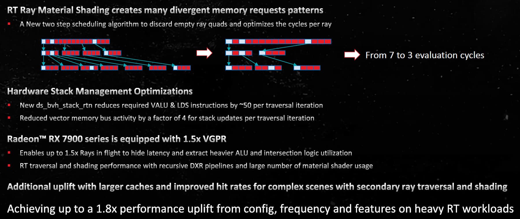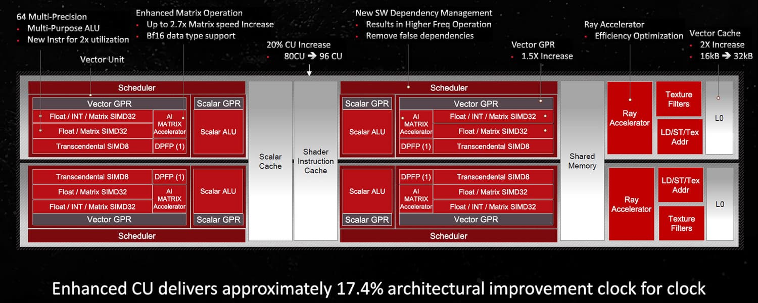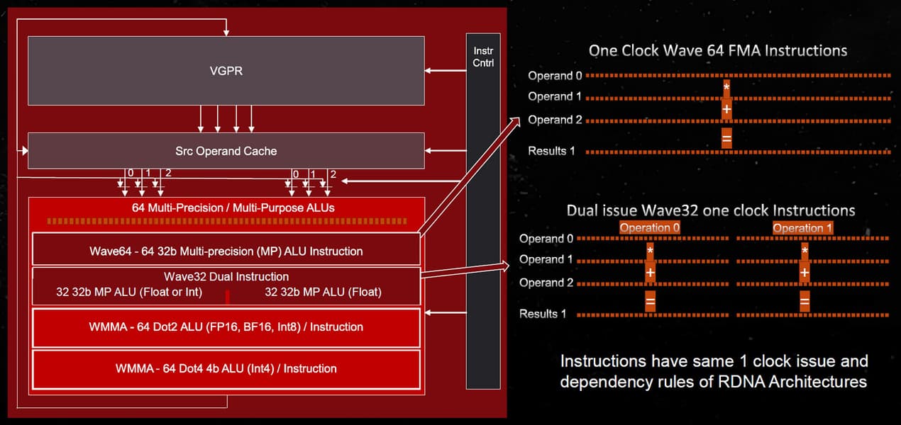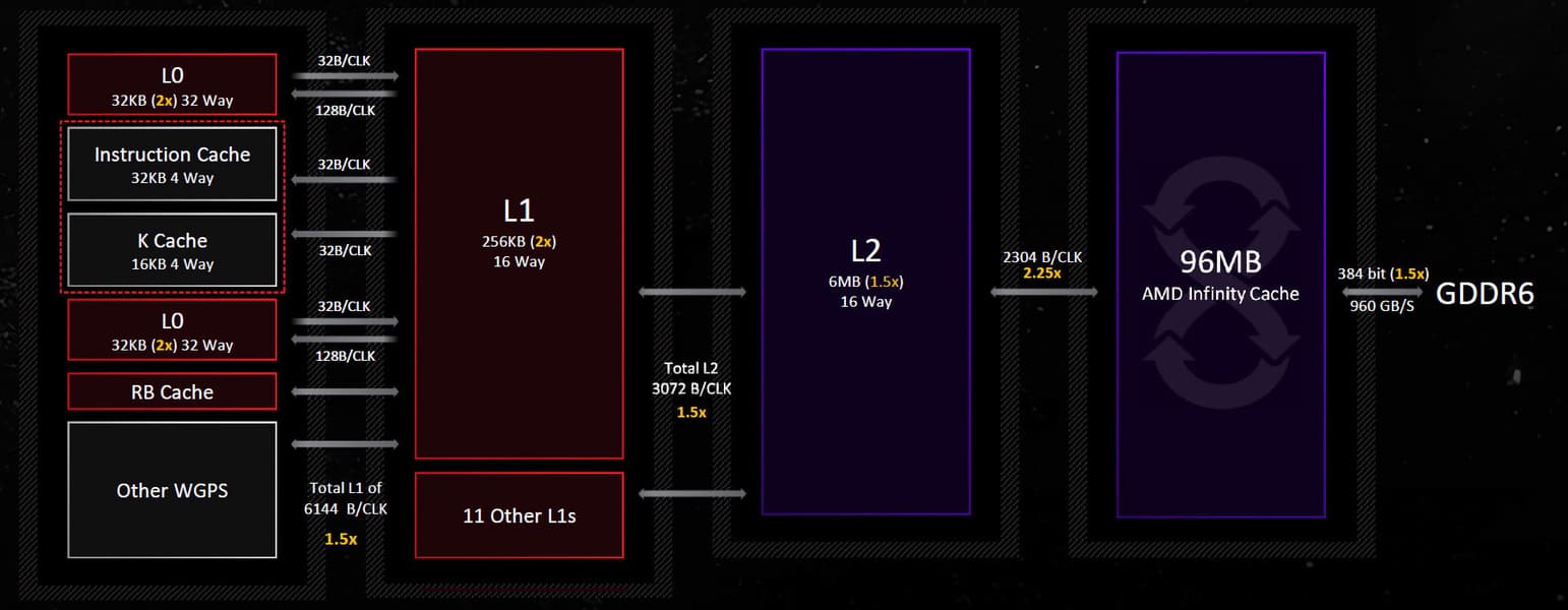 AMD утверждает, что они смогли улучшить использование исполнительных блоков на 20% — если в графических процессорах RDNA2 функциональные блоки относительно часто простаивали, то в RDNA3 над этим поработали. Самые большие изменения внутри основного чиплета произошли в вычислительных блоках CU и процессорах — увеличенный объем кэш-памяти всех уровней, увеличенный регистровый файл, а также более широкие и производительные интерфейсы между блоками. Самих блоков CU в Navi 31 больше, чем в Navi 21, и они работают быстрее на 17,4% за такт и на более высокой частоте, что вместе дает значительное повышение производительности GPU нового поколения.