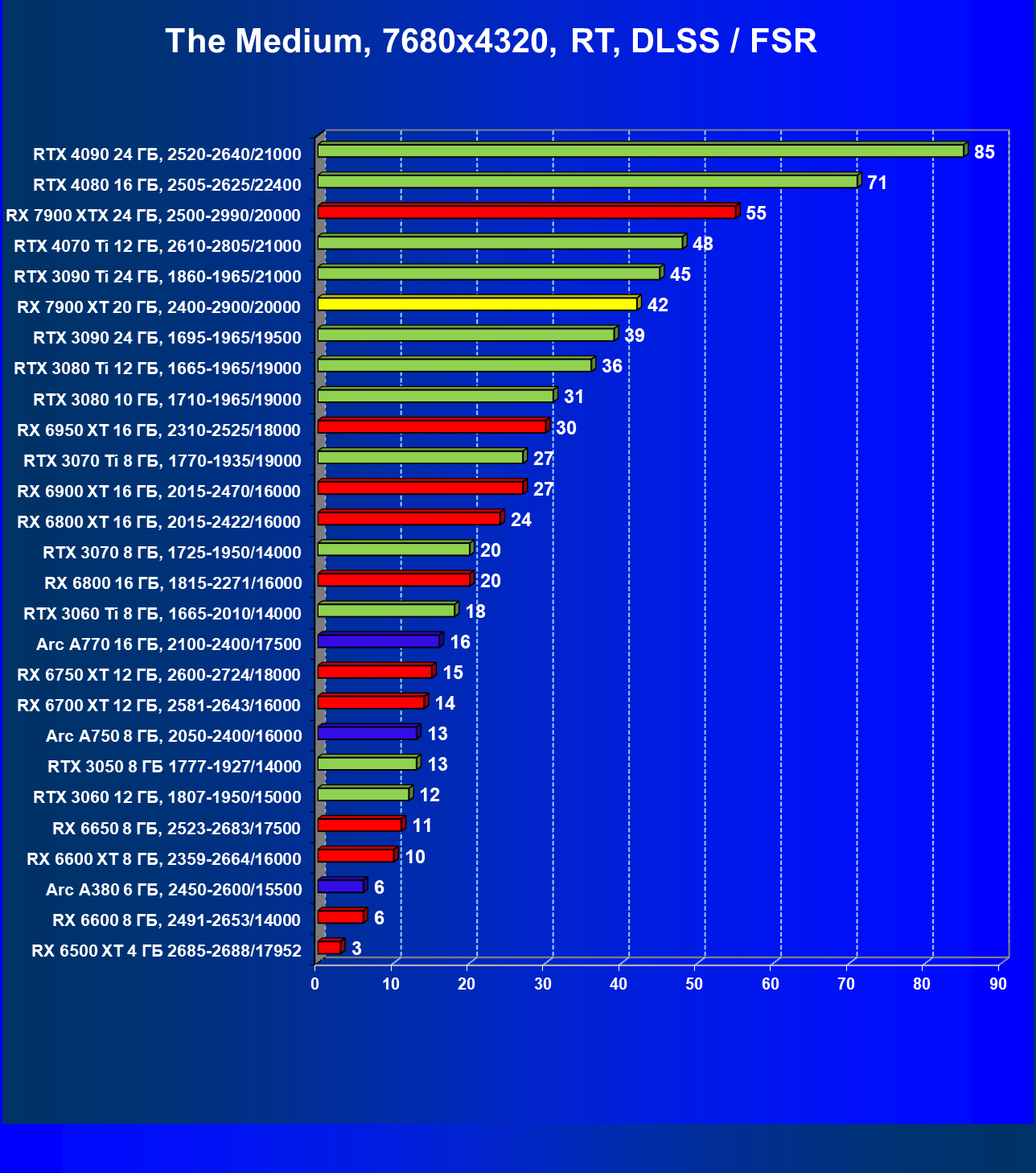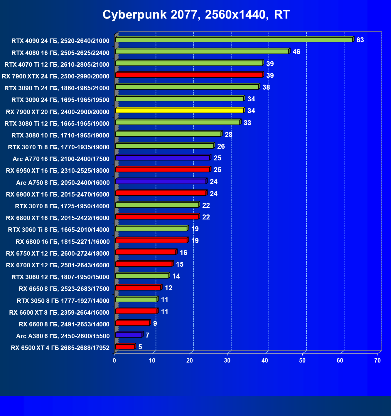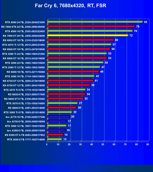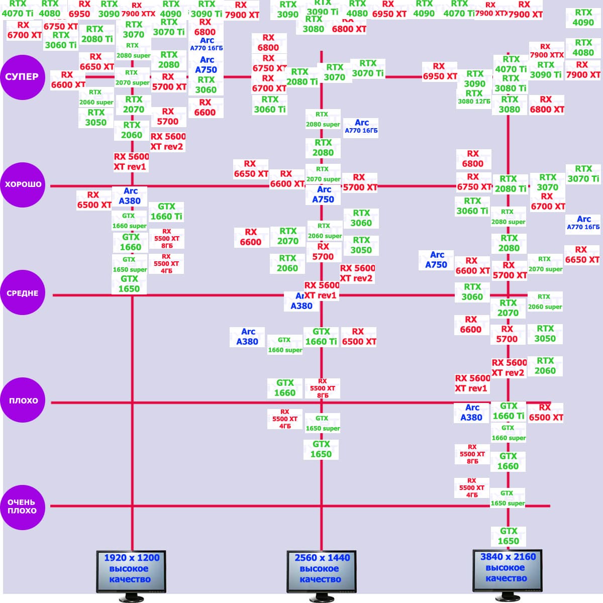 | 13 | RX 7900 XT 20 ГБ, 2400—2900/20000 | 86 | 770 | 90 000 |