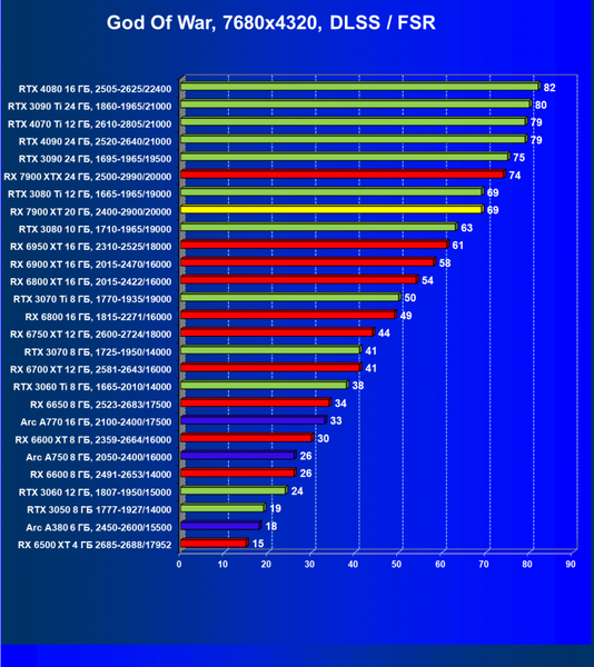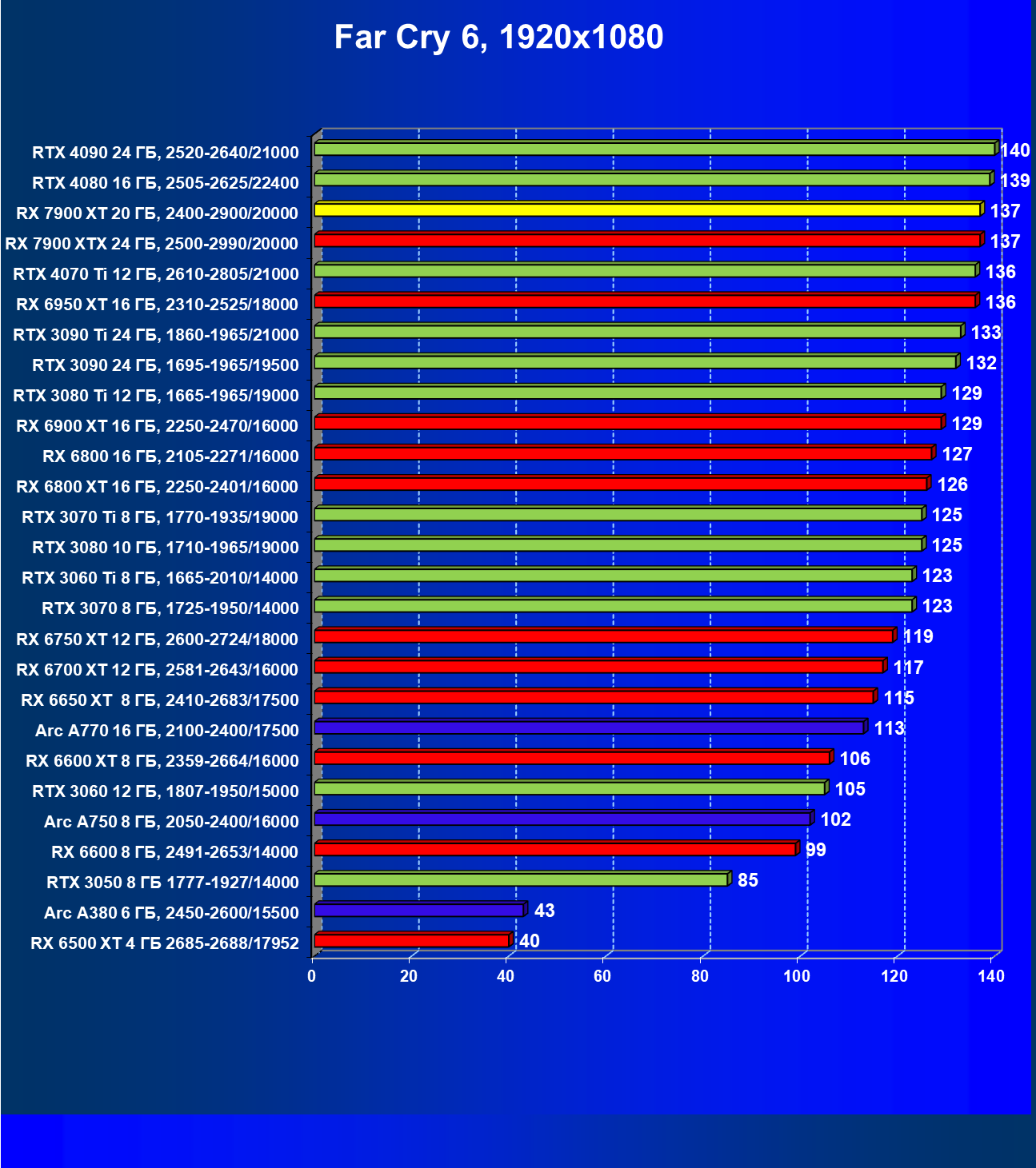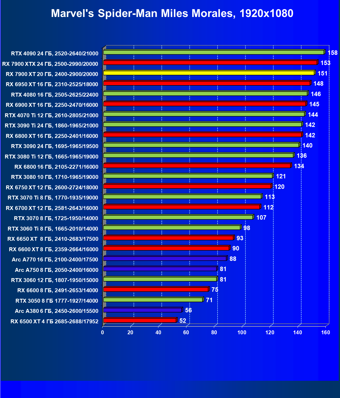 | 13 | RX 7900 XT 20 ГБ, 2400—2900/20000 | 86 | 770 | 90 000 |