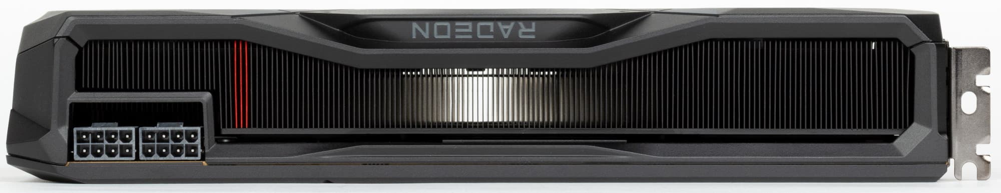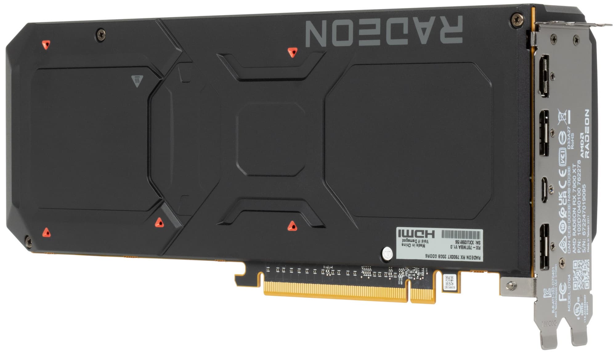 Референсный дизайн у моделей Radeon RX 7900 XT и RX 7900 XTX схожий, но рассматриваемая сегодня младшая модель в целом чуть меньше по всем размерам и не имеет RGB-подсветки, в отличие от старшей. Обе видеокарты значительно меньше соответствующих по цене видеокарт компании Nvidia. Для вывода изображения используются два стандартных разъема DisplayPort 2.1 и один HDMI 2.1, также есть разъем USB-C с поддержкой вывода DisplayPort — для использования с VR-шлемами.