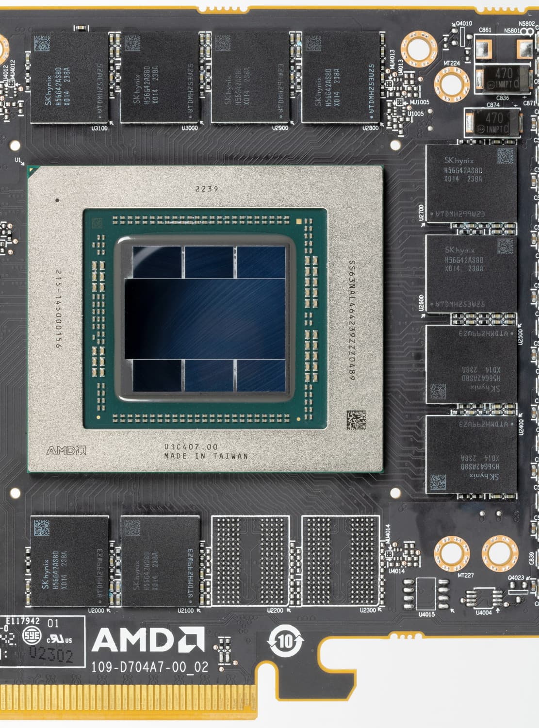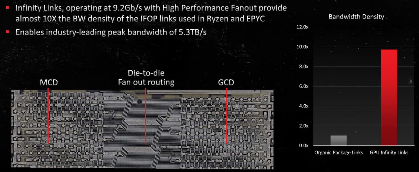 Эти кристаллы производятся при помощи техпроцесса 6 нм, а основная часть GPU — graphics compute die (GCD) — при помощи более совершенного процесса 5 нм. И так как соединение кэшей и GPU должно быть высокоскоростным, то эти кристаллы соединяются друг с другом при помощи очень быстрого соединения, обеспечивающего пропускную способность более 5 ТБ/с между GCD и всеми MCD.